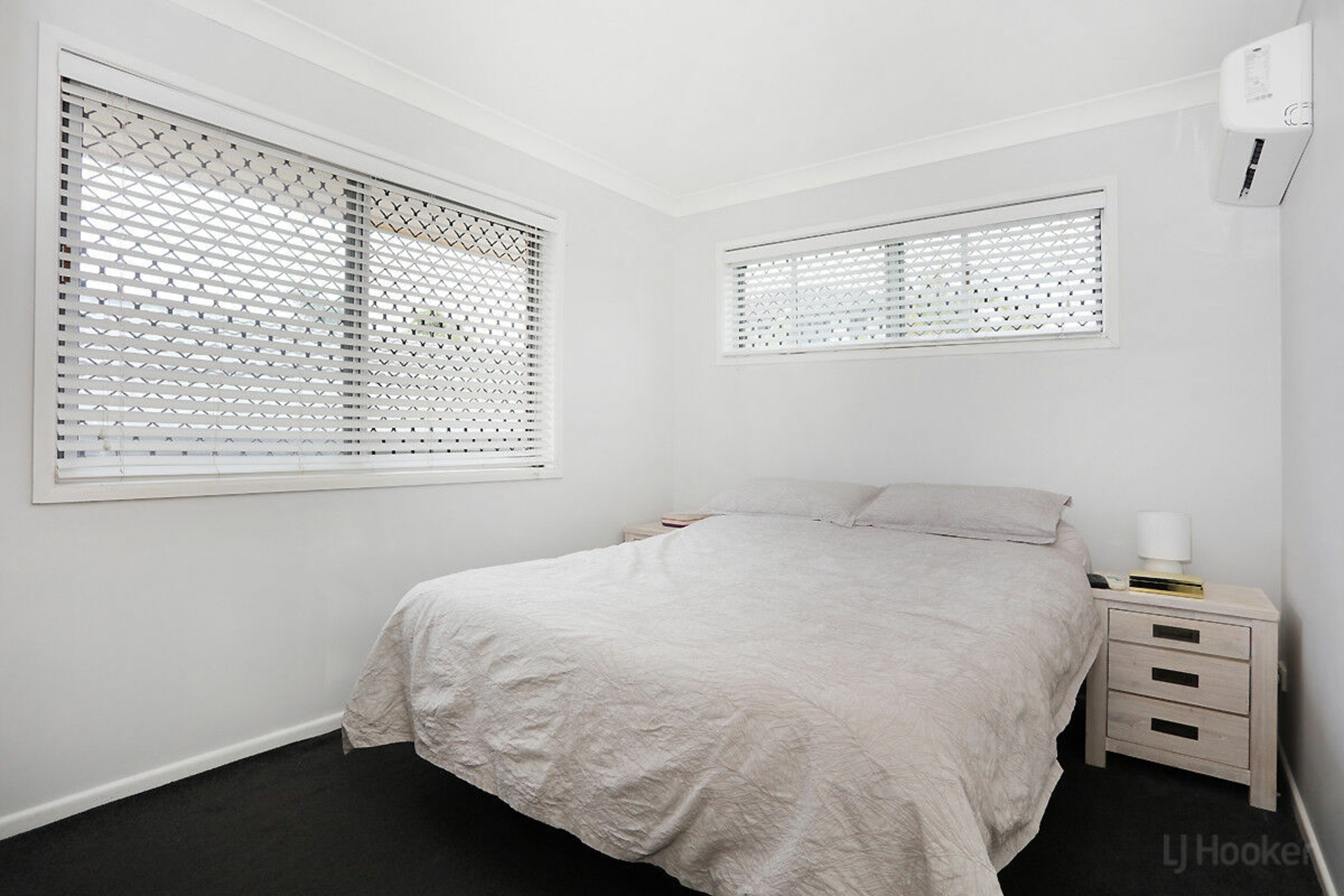 Separate oversized fourth bedroom suitable for a king bed, featuring modern carpet, air conditioning, and built-in wardrobe