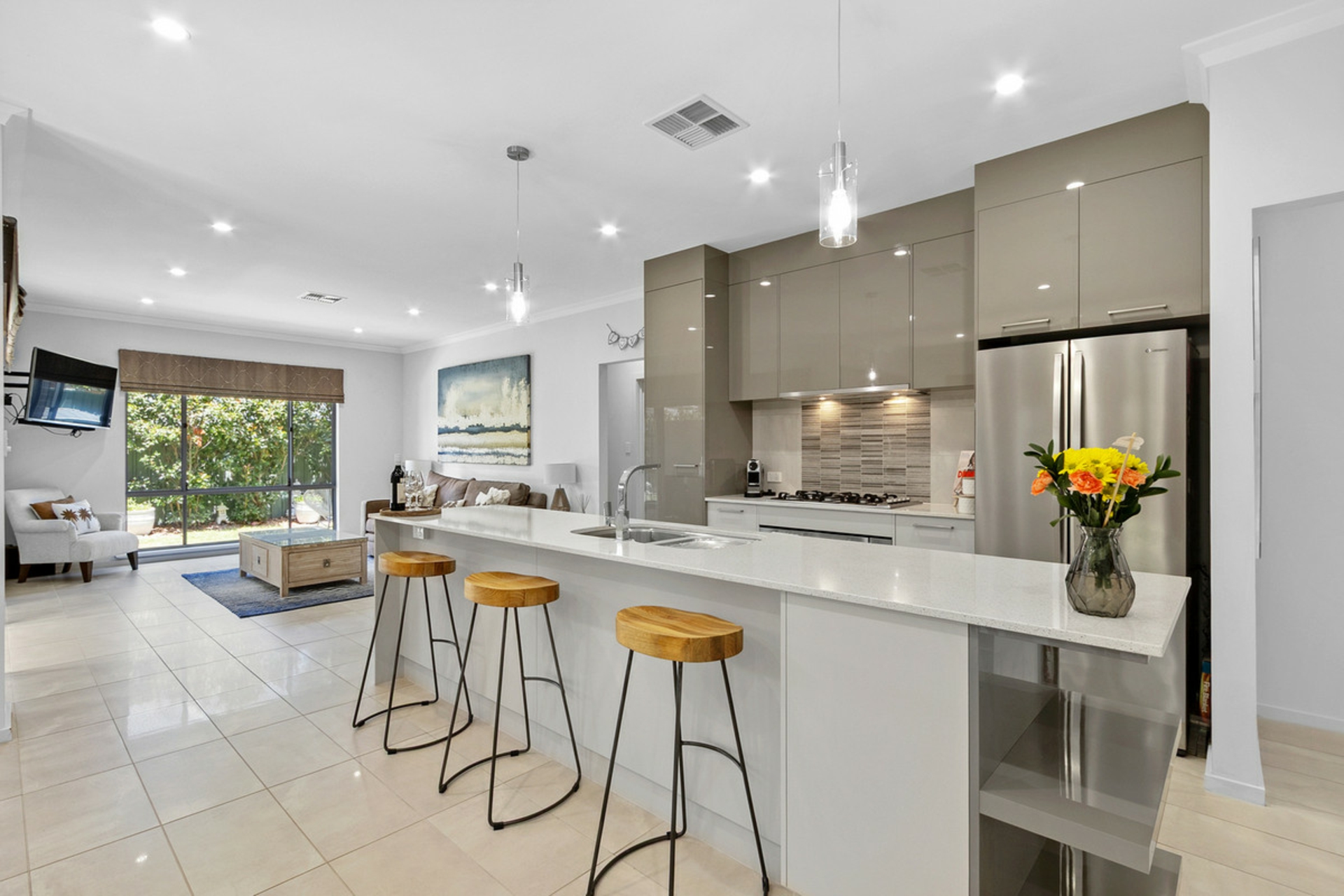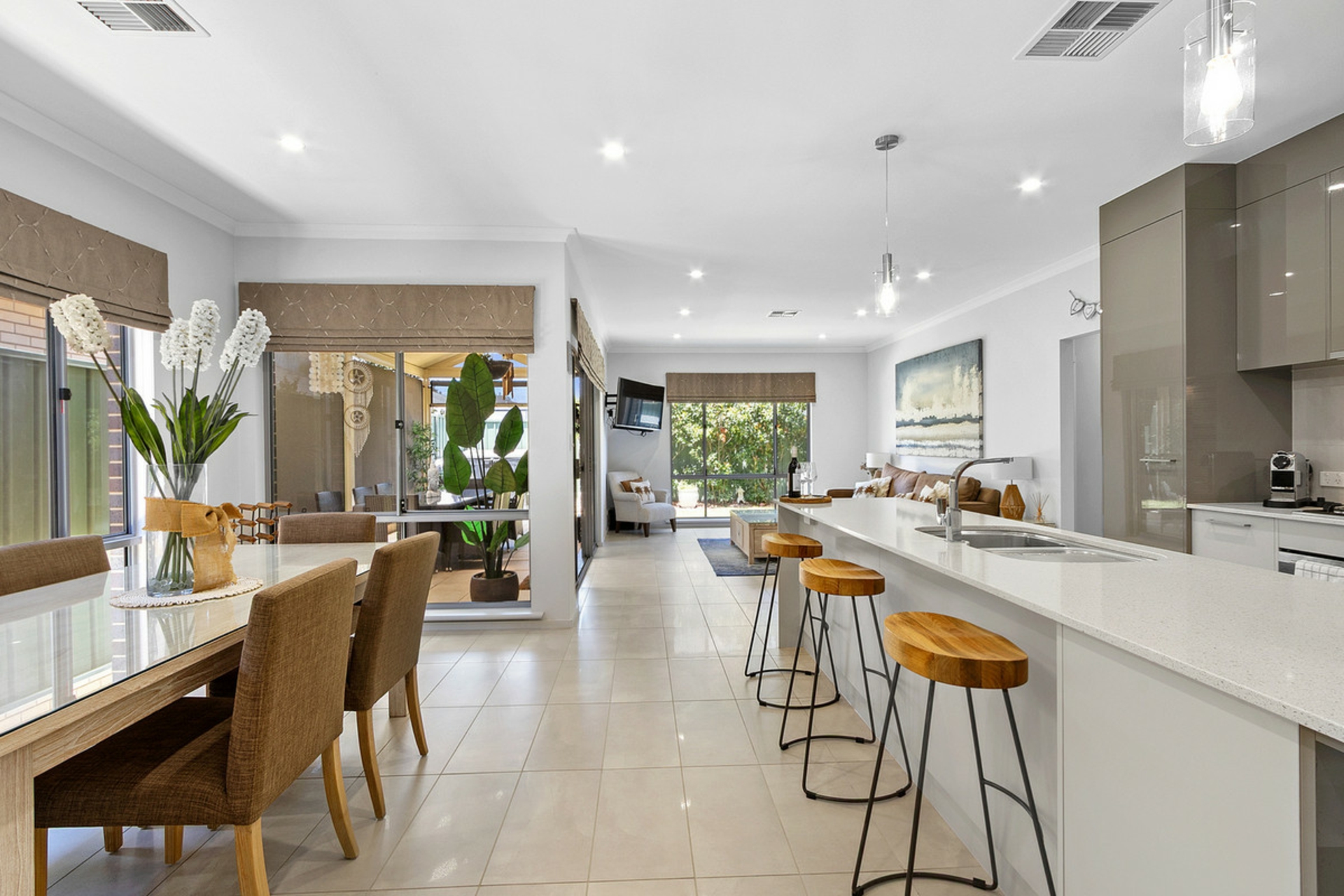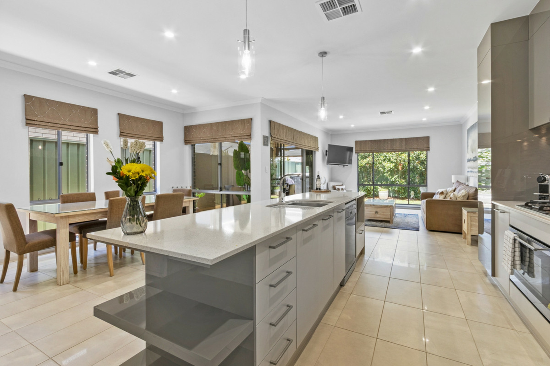• Open-plan kitchen and meals area flowing to the outdoor entertaining area via dual sliding doors.