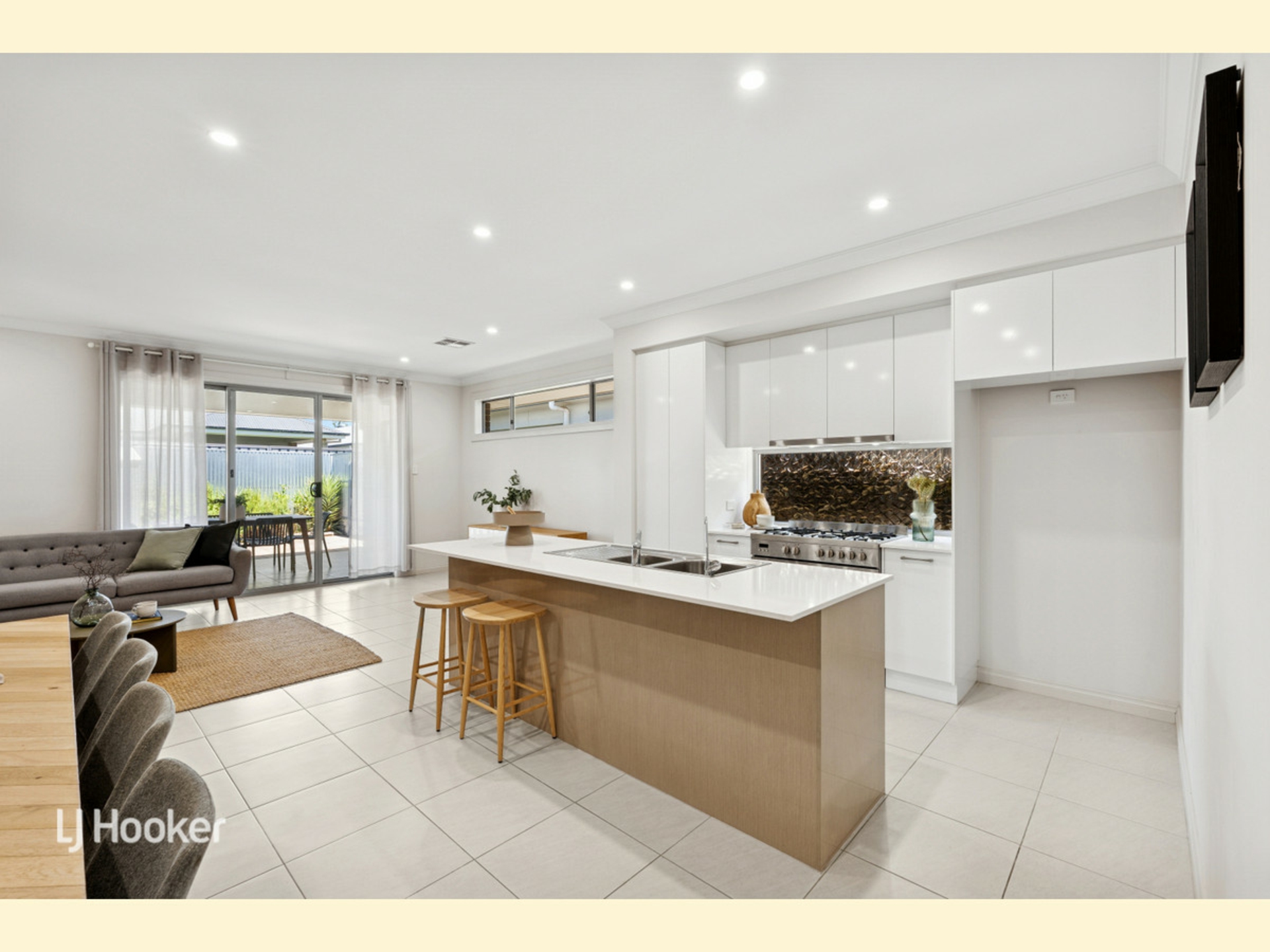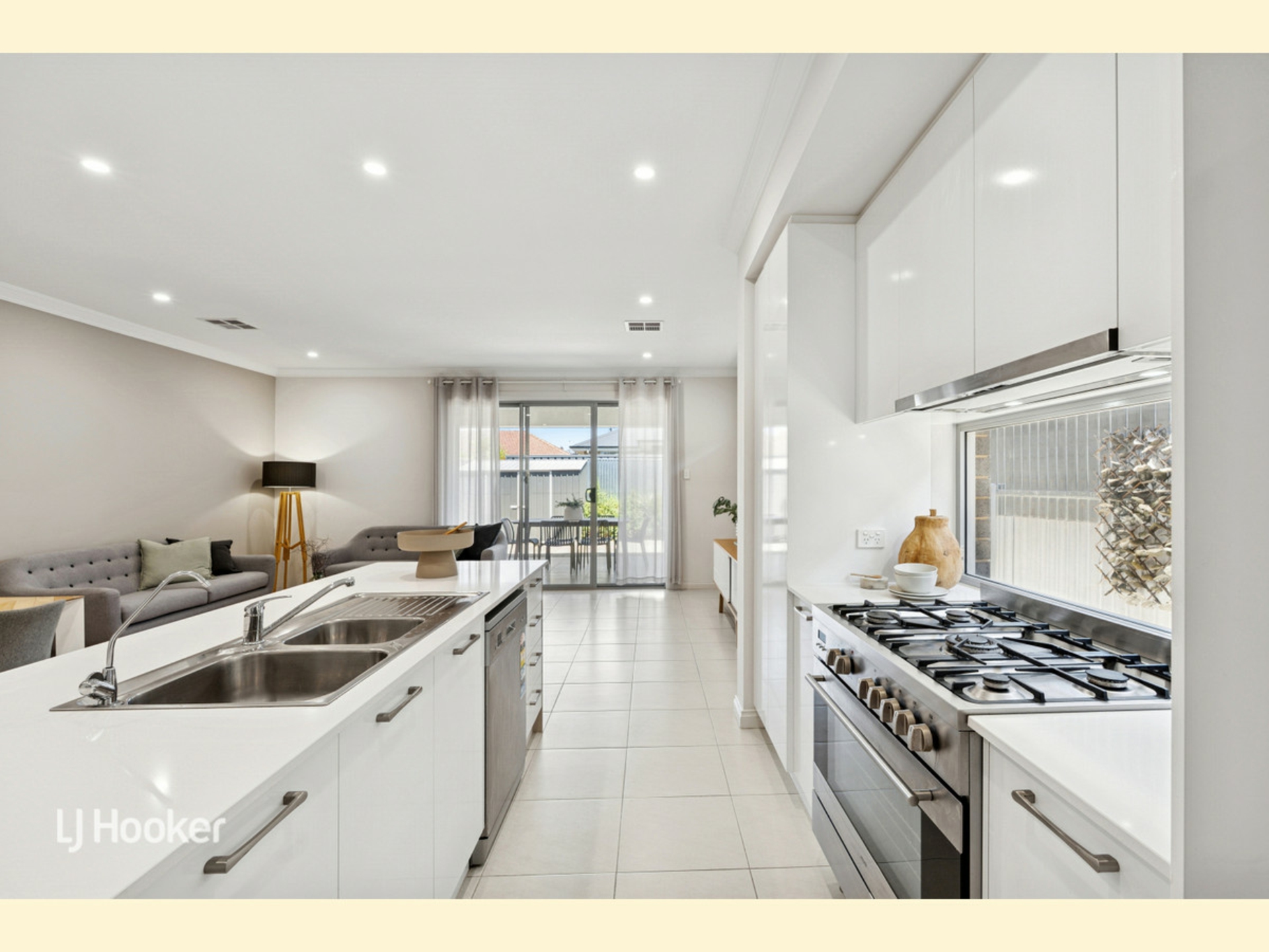 At the heart of the home, expansive open-plan living and dining is enhanced by refined finishes and a seamless indoor-outdoor connection. The kitchen is both beautiful and functional, appointed with stainless steel appliances, gas cooktop, dishwasher, statement island bench and generous storage, making it ideal for entertaining or everyday living. Tiled living areas add a sense of polish, while plush carpets in the bedrooms provide warmth and softness. Sliding doors open to a private, low-maintenance alfresco, perfect for relaxed evenings or weekend gatherings.
