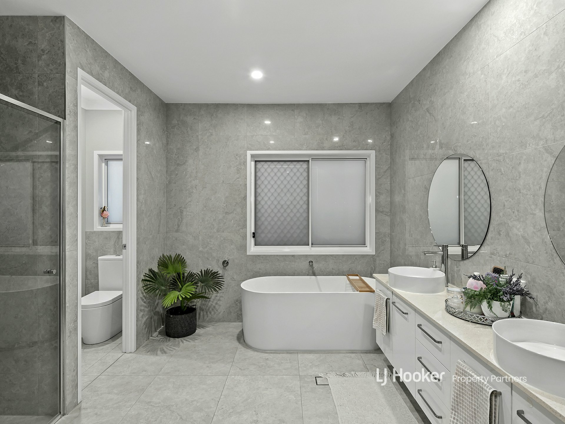 On the accommodation front, 3 of the 4 bedrooms have BIRs, with the master luxed up with its huge WIR, patio access, and a gorgeous ensuite with matching round mirrors over the twin sinks in its floating vanity, a super soaking freestanding tub, and rain shower. Almost as flash is the second full bathroom, also with a separate tub and shower, and there's a powder room for guests.