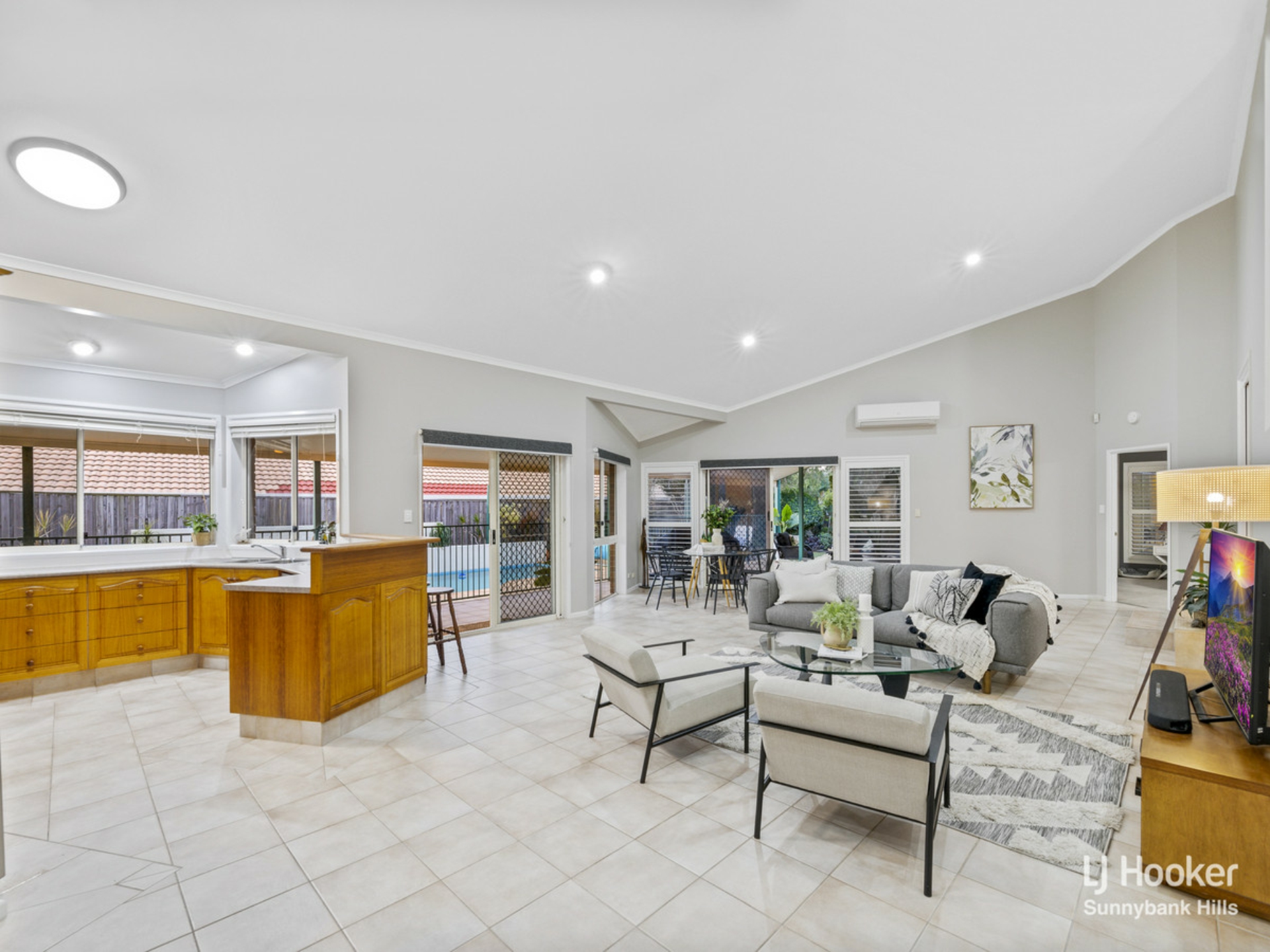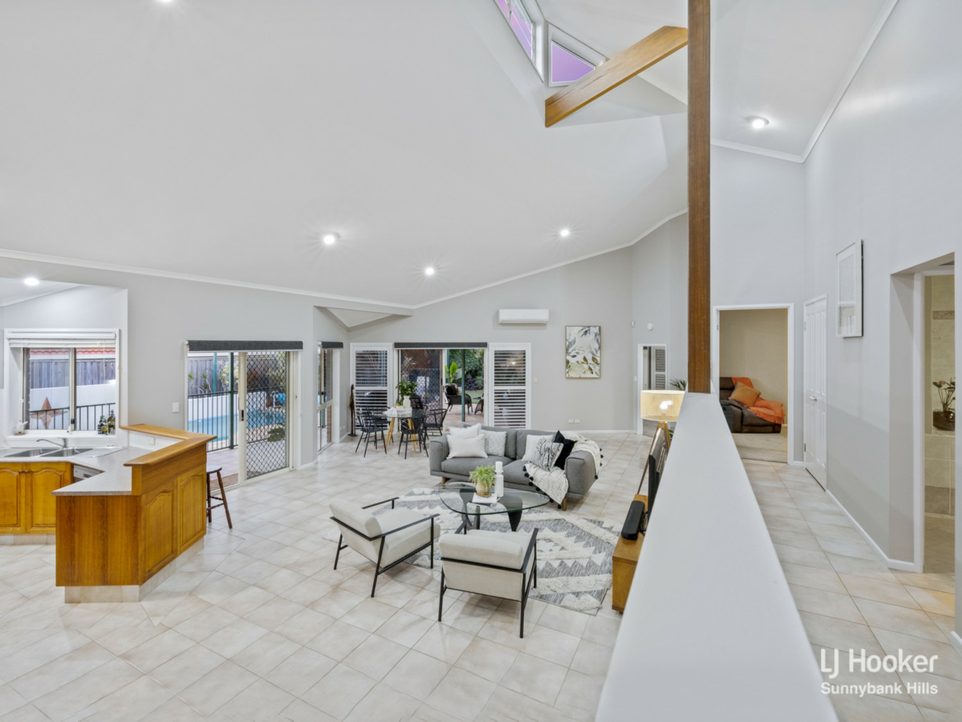 Through the sliding doors of the living areas, a large wrap around entertainment patio awaits, along with a sparkling in-ground pool. The additional stand alone living room with cathedral-style ceilings can act as a rumpus room, home office or teenage retreat.