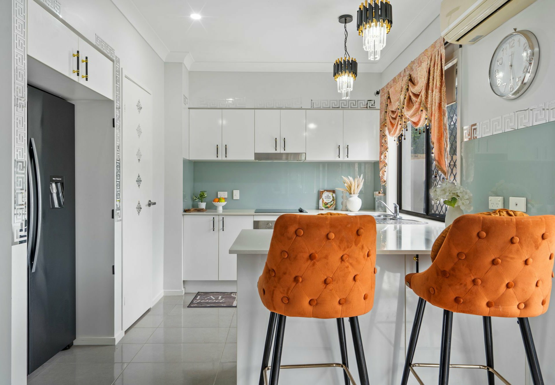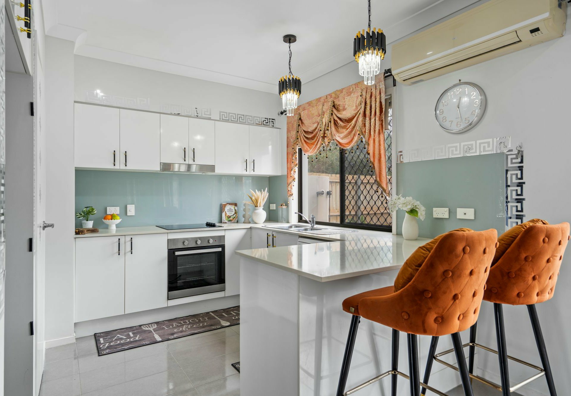 Overlooking the dining area, the sleek kitchen features quality stainless steel appliances and glass splashbacks for easy cleaning, while an abundance of storage cabinetry and a breakfast bar keep the space as practical as it is stylish.