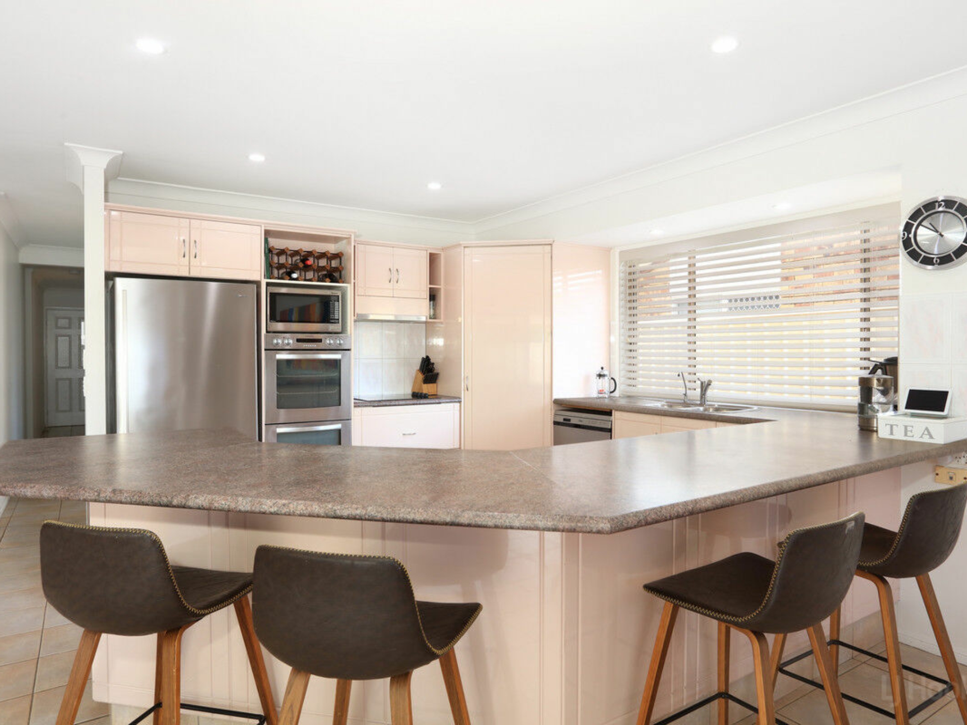 •Large tiled kitchen with modern appliances, dishwasher, and huge bench top