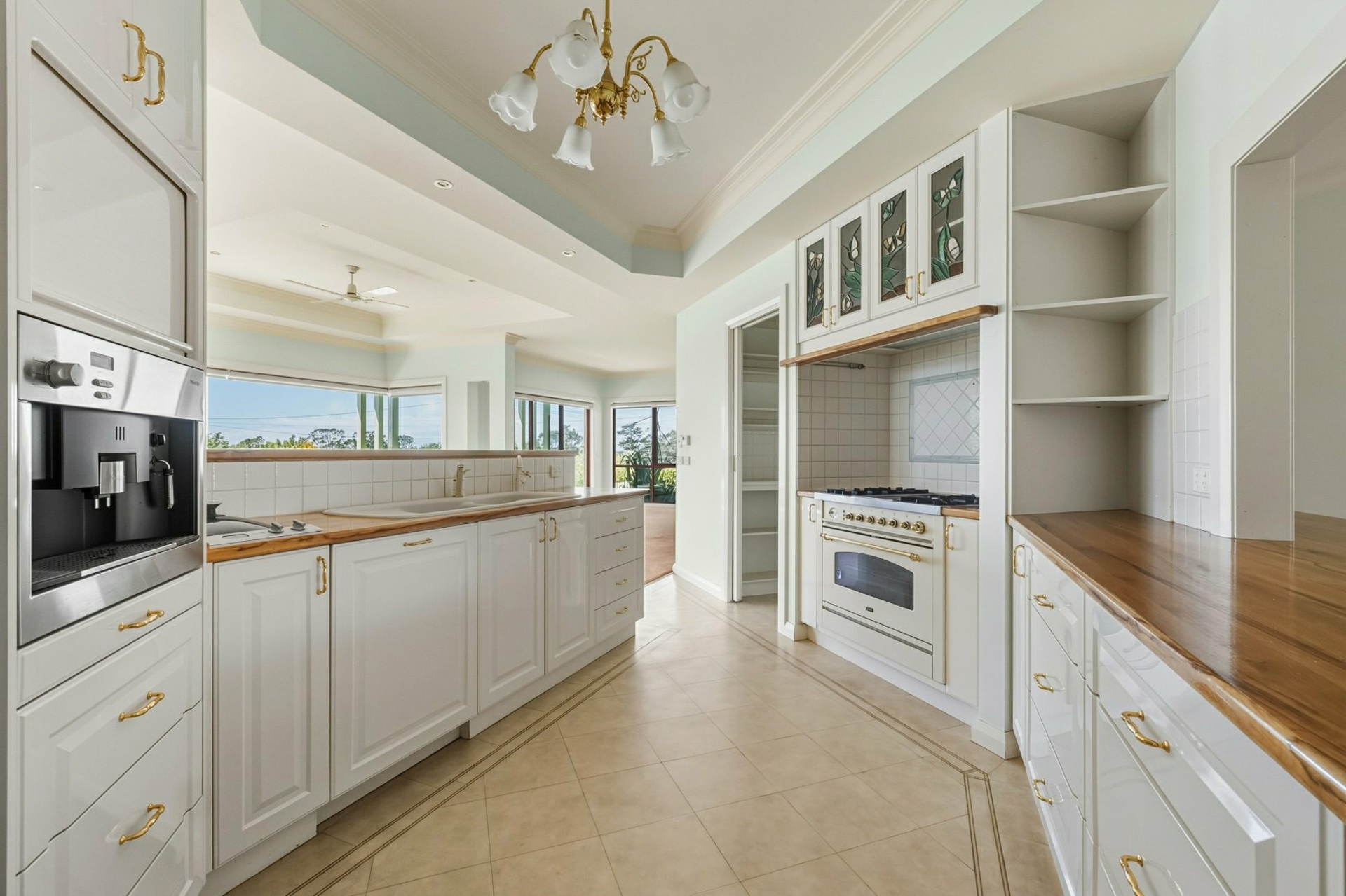 Chef's kitchen, the heart of the home, featuring a walk-in pantry, timber benchtops, Ilve 900mm gas/electric oven, coffee machine, integrated dishwasher and overhead cabinets with leadlight glass. The kitchen connects seamlessly to a private tiled outdoor living area with a verandah.