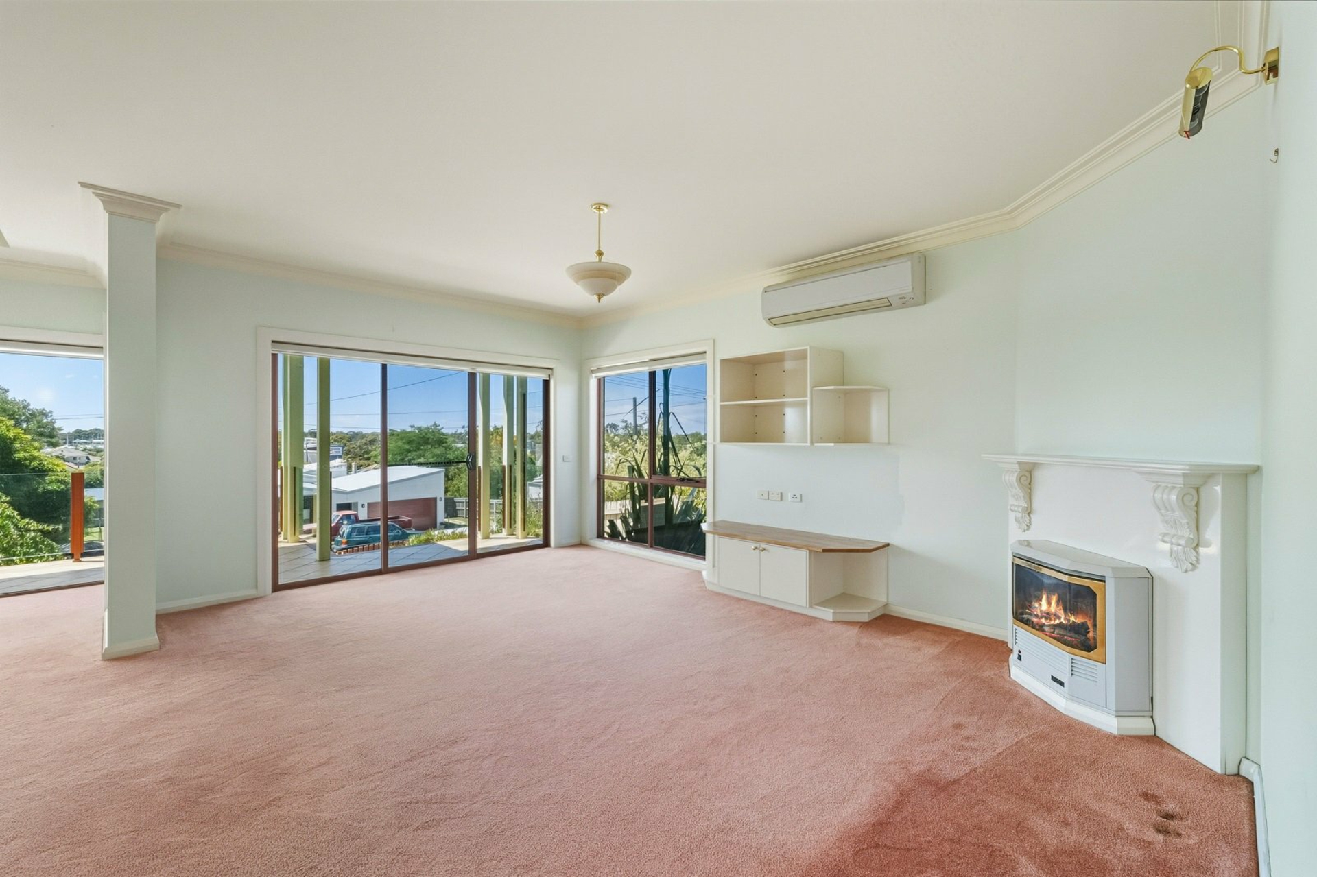 Impressive open plan living room with 9' ceilings, ornate cornices, detailed ceiling features, a frameless picture window, gas log fire, built-in TV cabinet and display cabinet, opening onto a tiled balcony with a glass balustrade and covered area to enjoy the views.