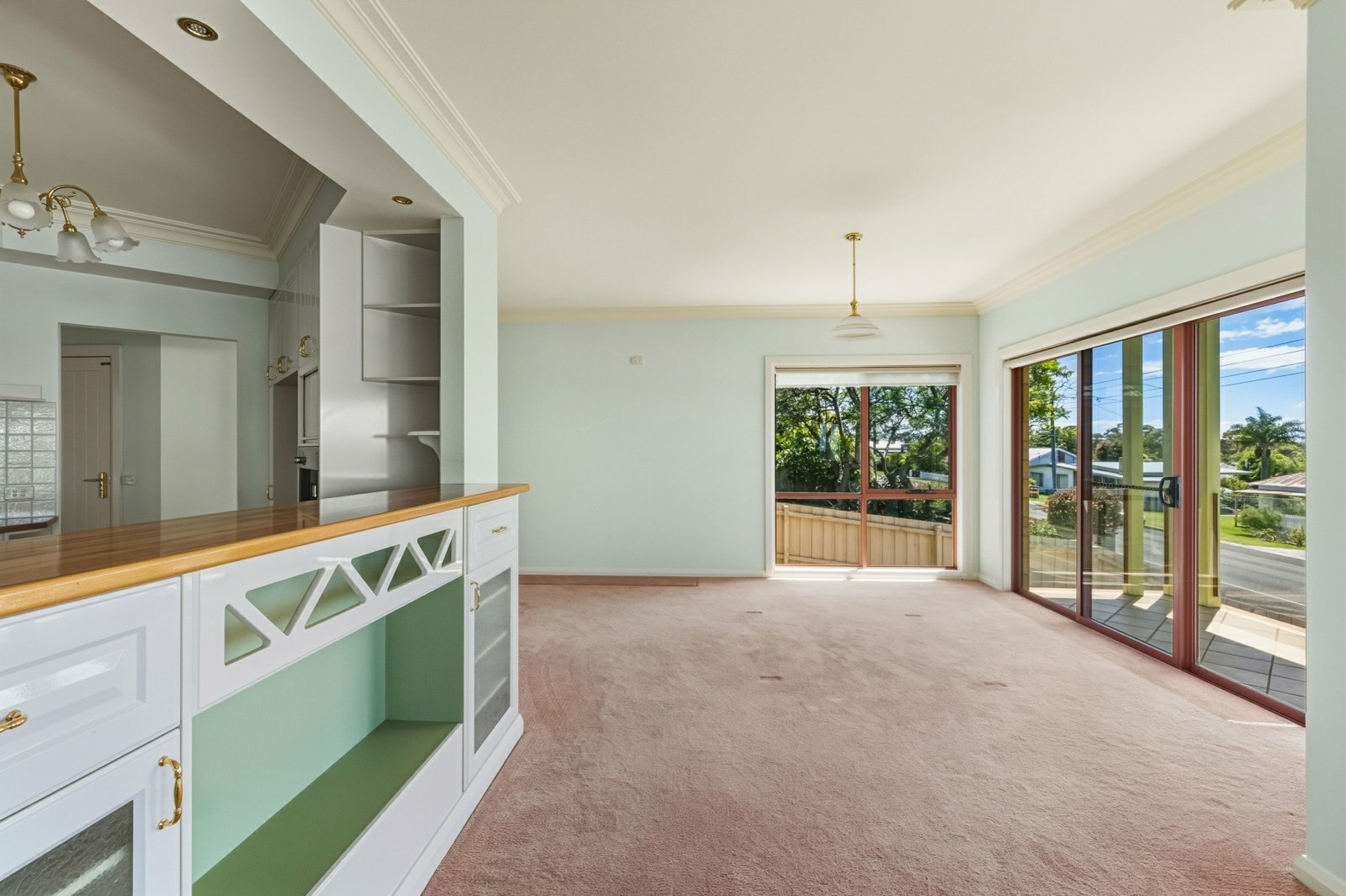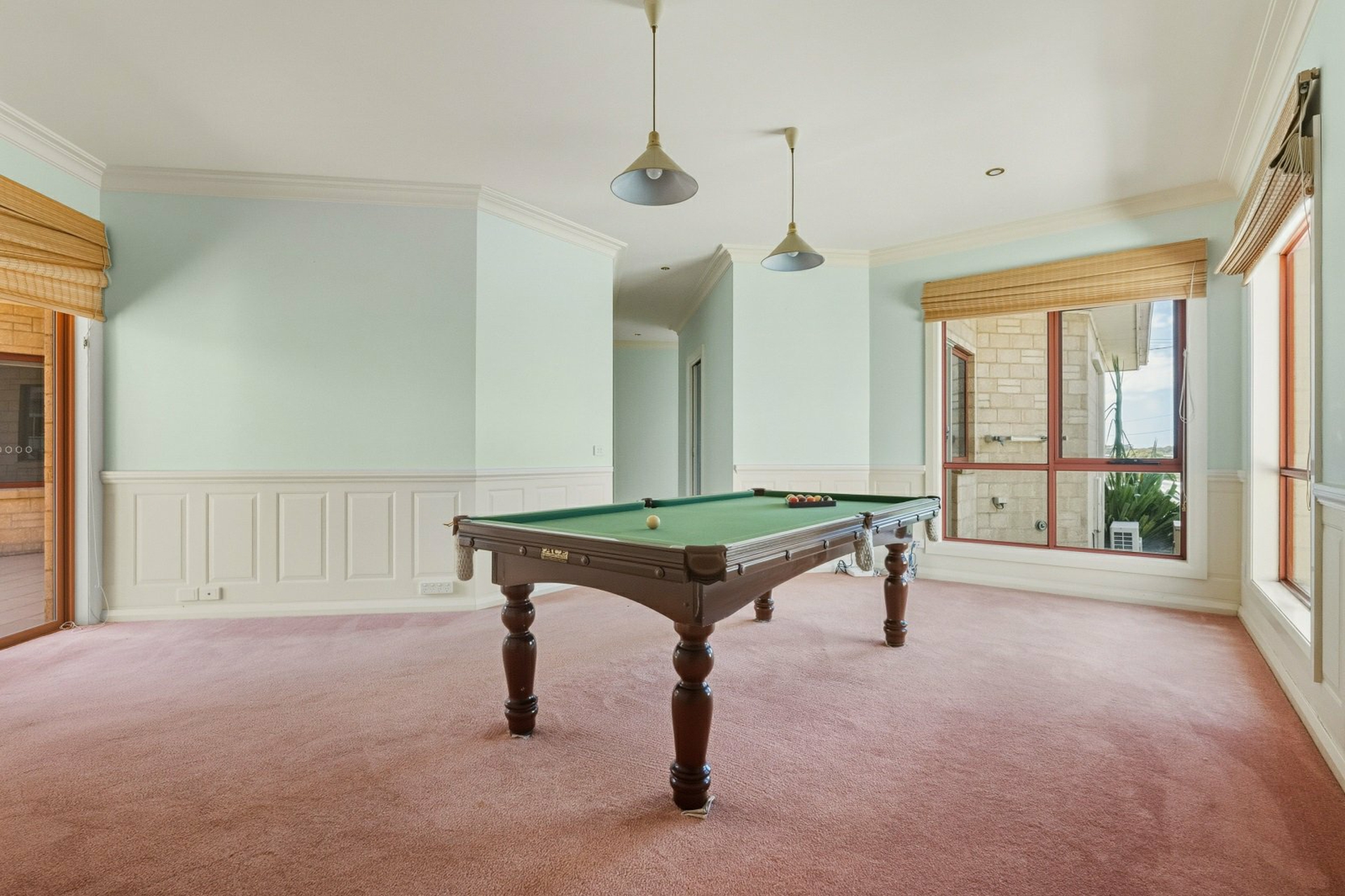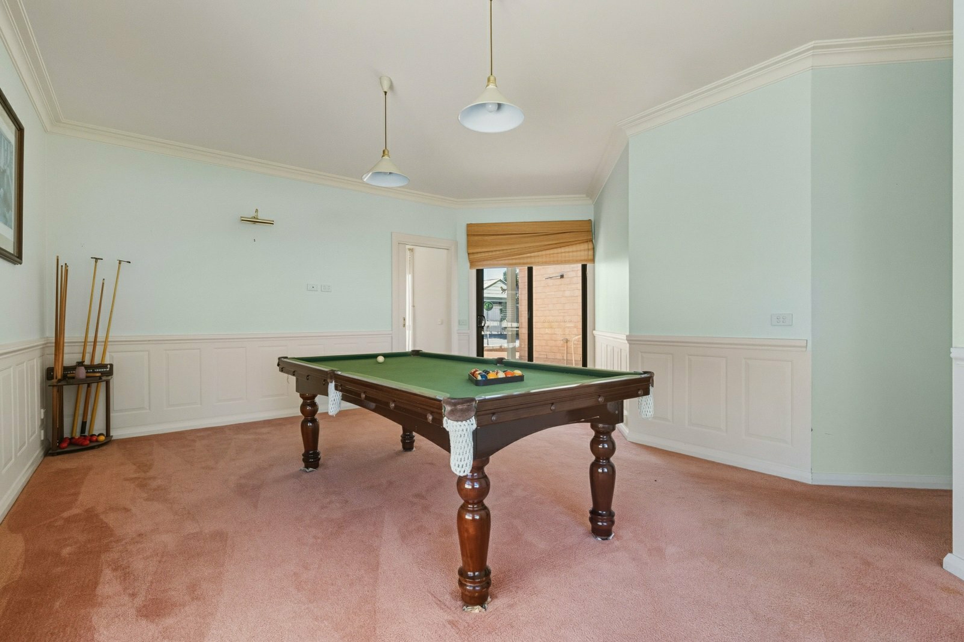 A spacious games room with feature dado panelling and a glass door leading to the outdoor entertaining space.