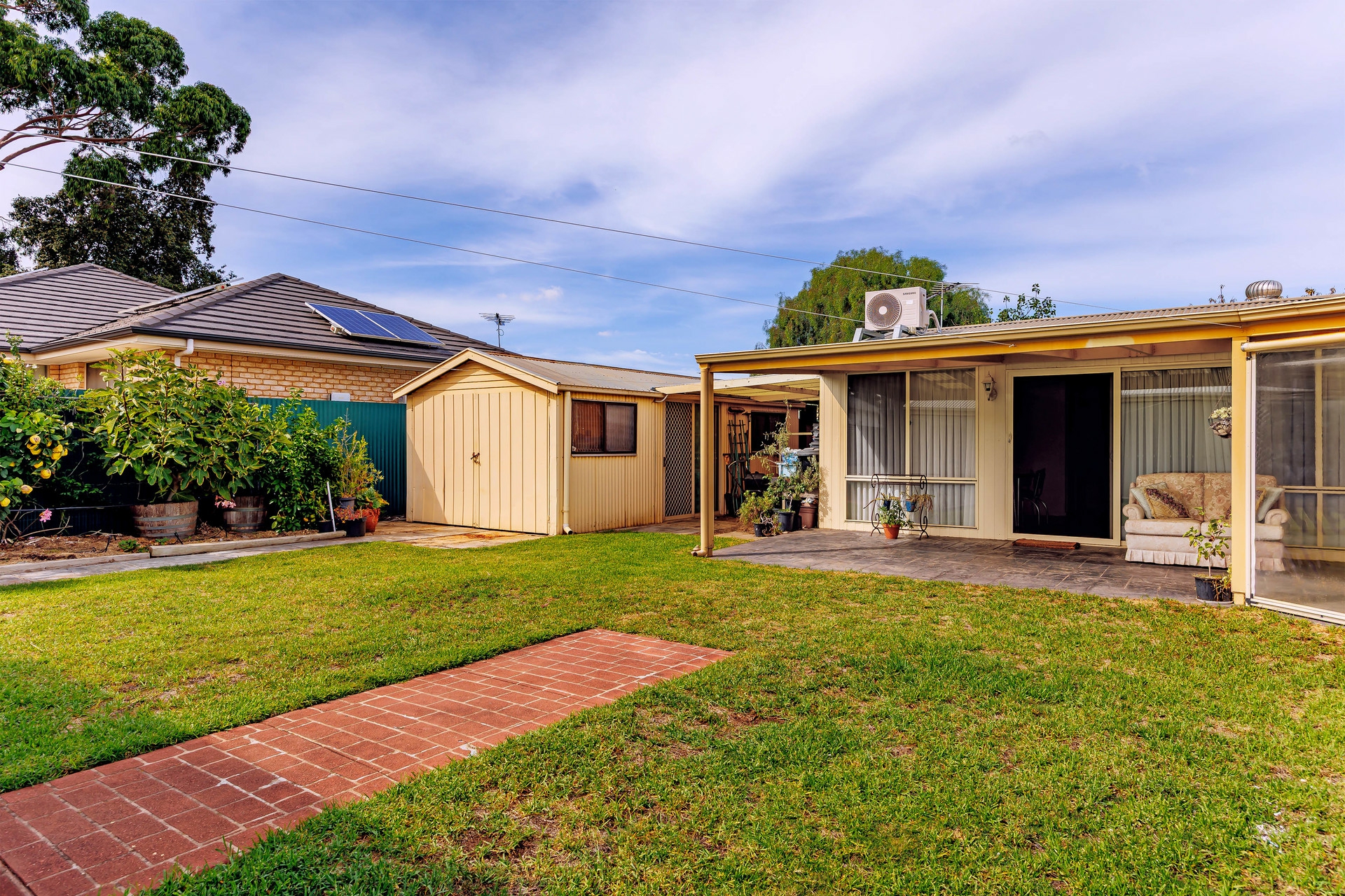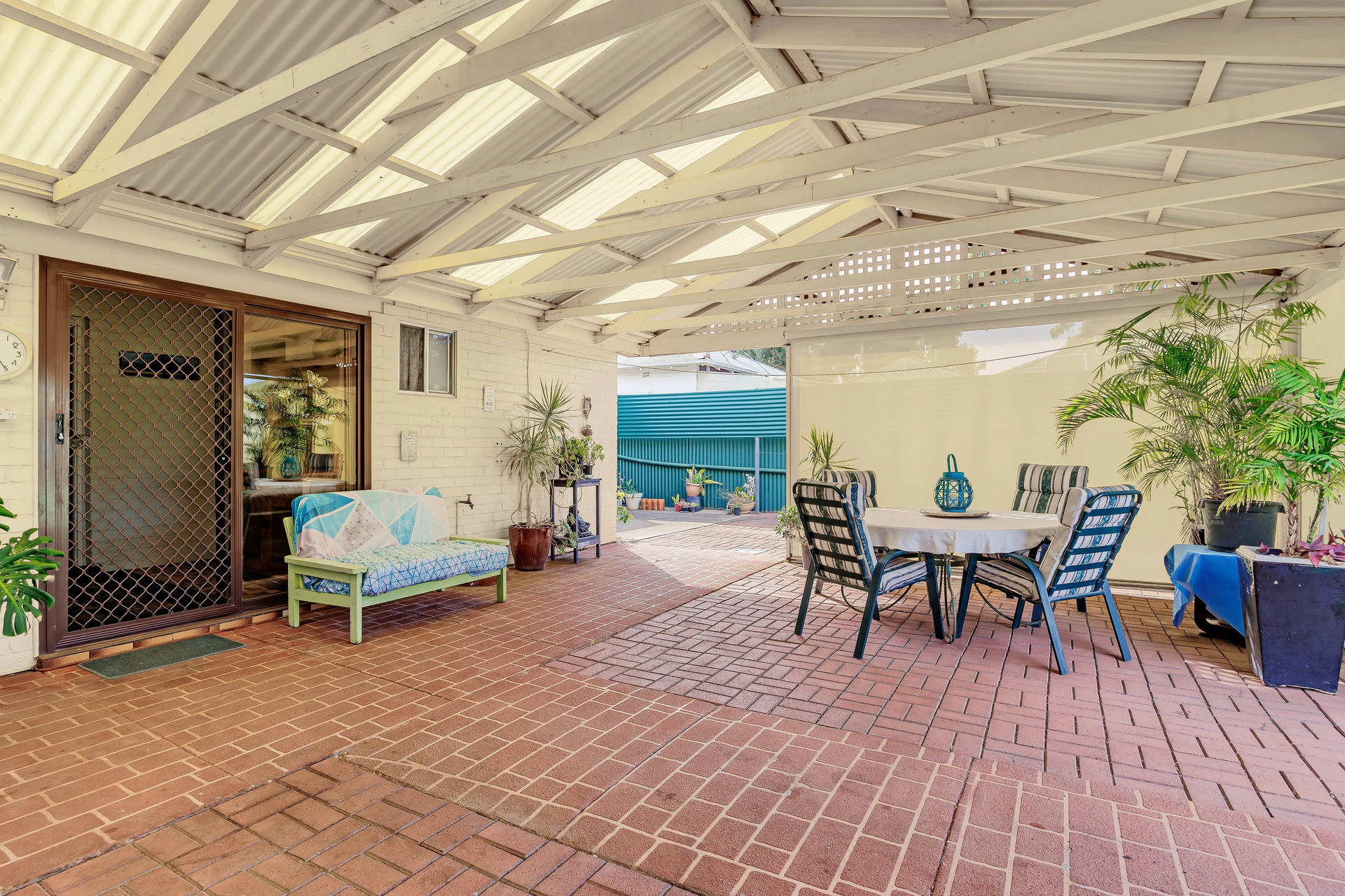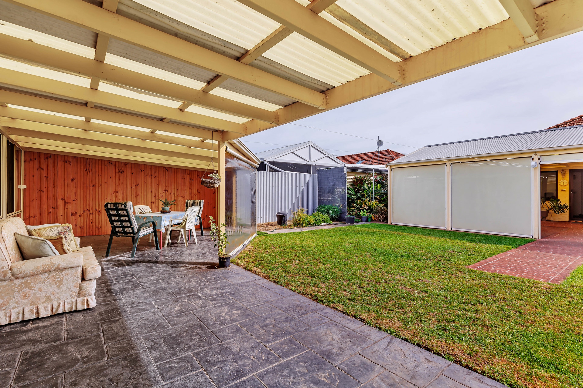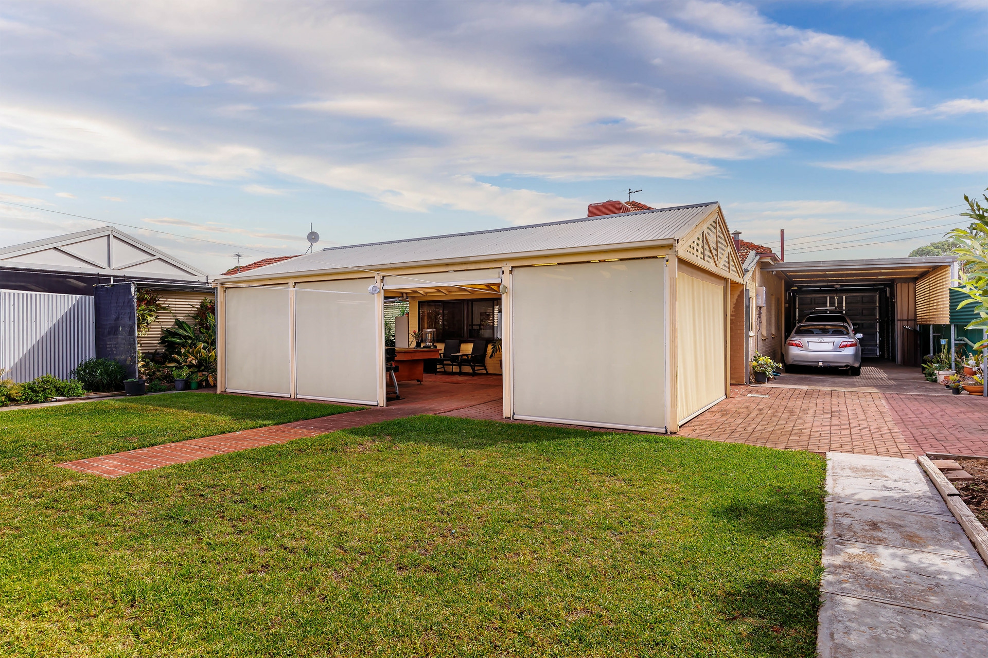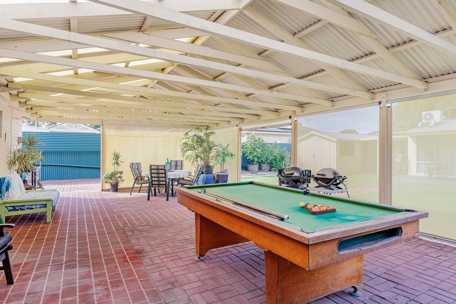 Outside is fantastic! You step outside to a huge undercover pergola/entertaining area with blinds to provide protection from the elements. This would be perfect for entertaining family or friends, or just relaxing outdoors.