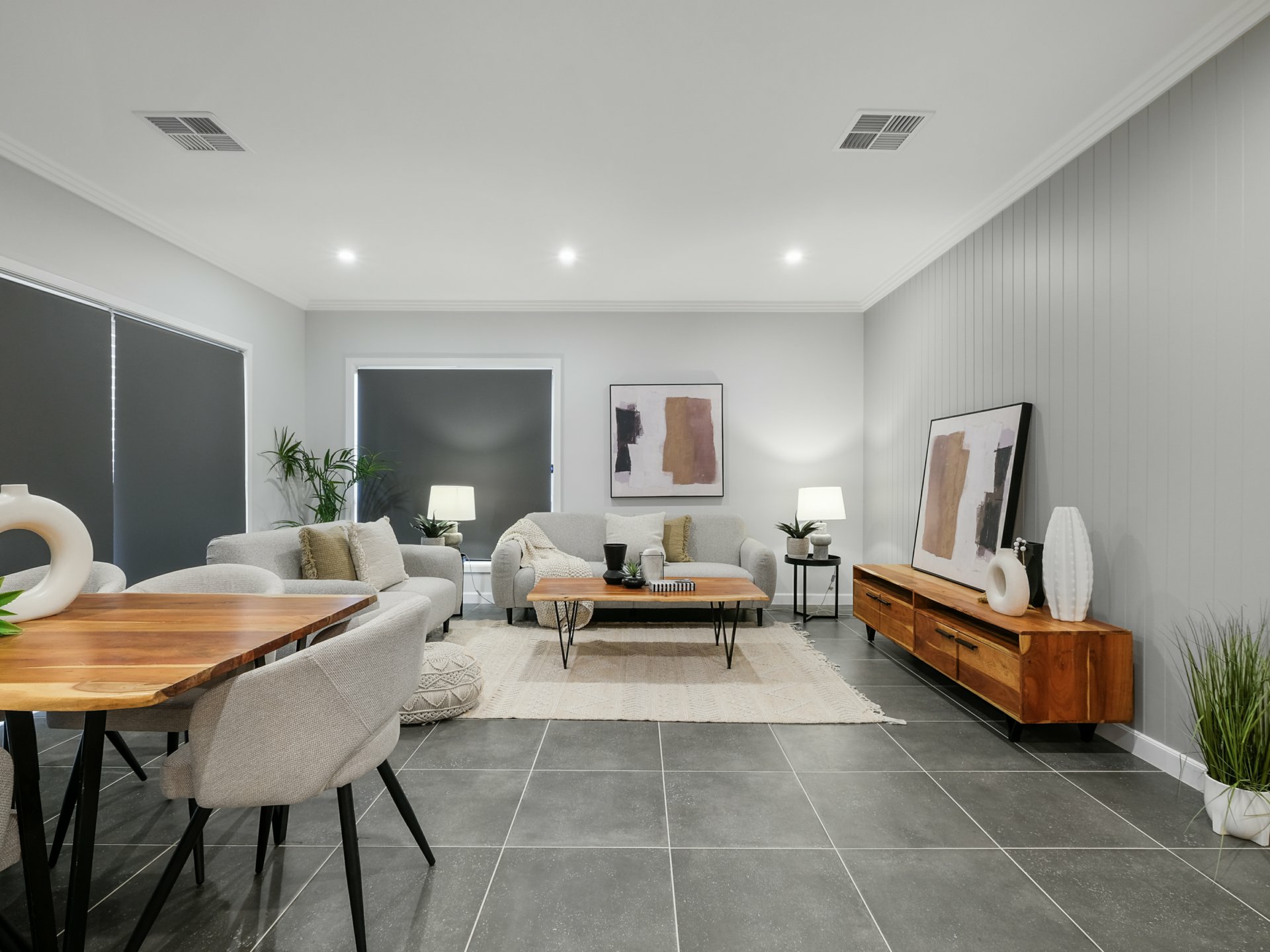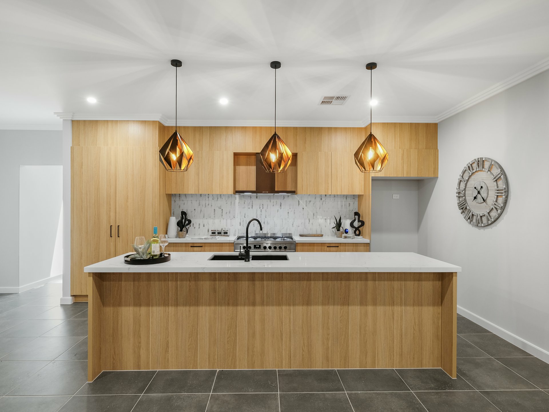 At its heart, a designer kitchen with a three-metre stone island, premium appliances, and flawless finishes flows seamlessly into a sunlit open-plan living and dining area — ideal for family life or entertaining.