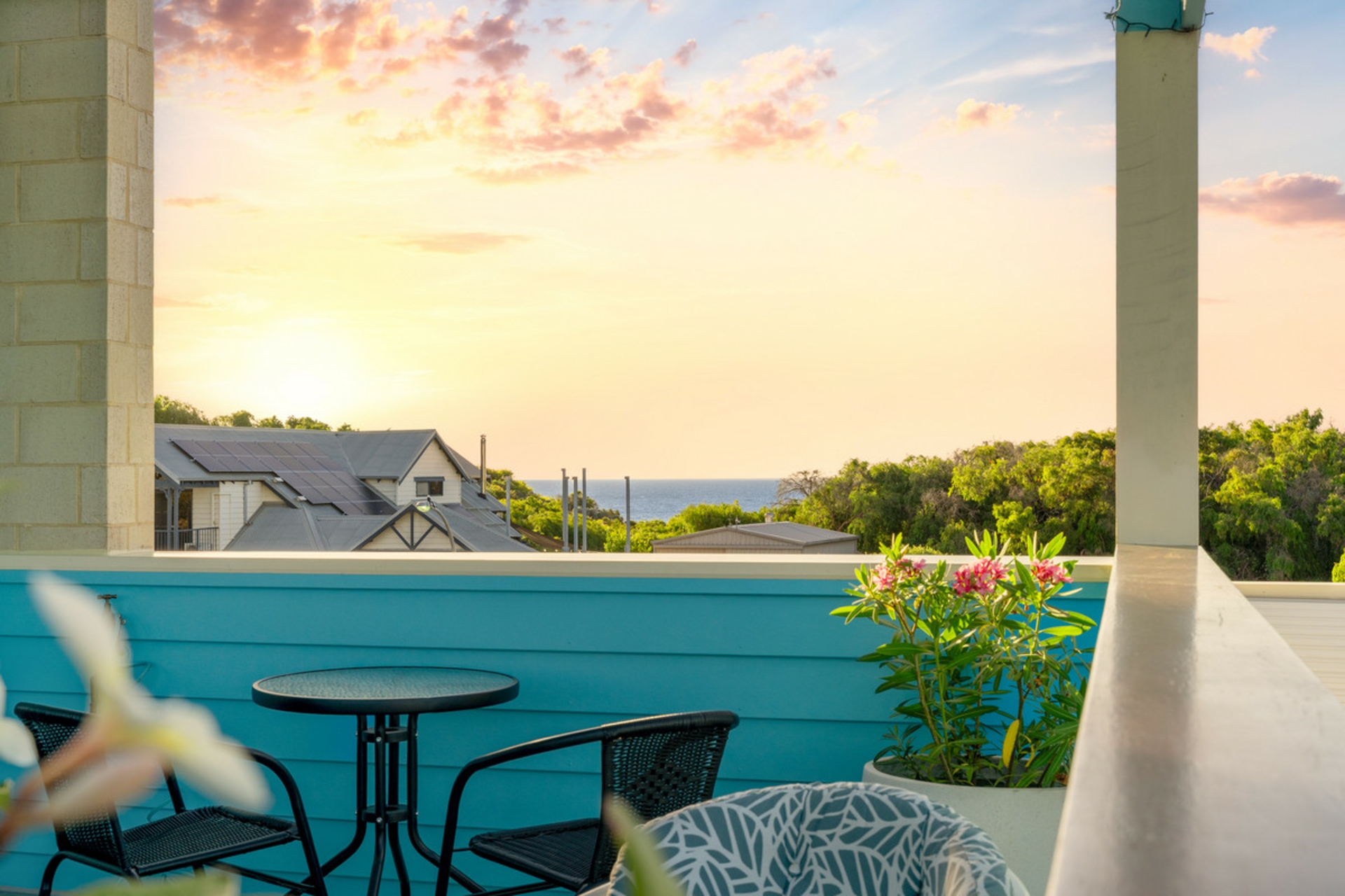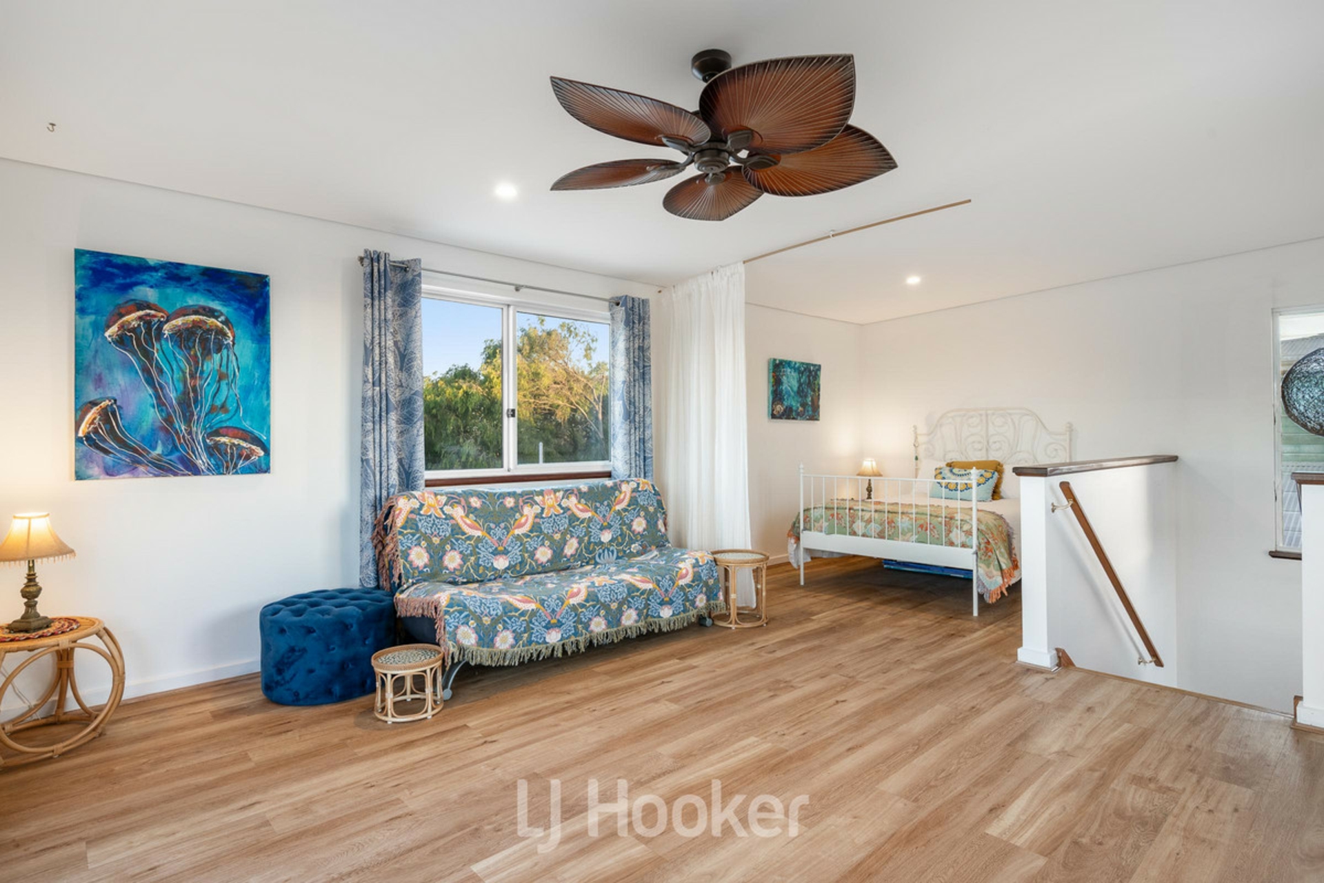 Accommodation includes three generous size bedrooms, with additional versatile room/bedroom upstairs opening onto a private terrace with ocean views. Ideal as a fourth bedroom, guest suite or peaceful retreat. Highlighted by a spacious master suite complete with feature timber doors opening to the alfresco, a large walk-in robe plus additional double robe, and a walk-through bathroom showcasing a clawfoot bath, hobless shower, and brass tapware vanity. Minor bedrooms include generous double built-in robes, with the front bedroom enjoying terrace access and ocean views.