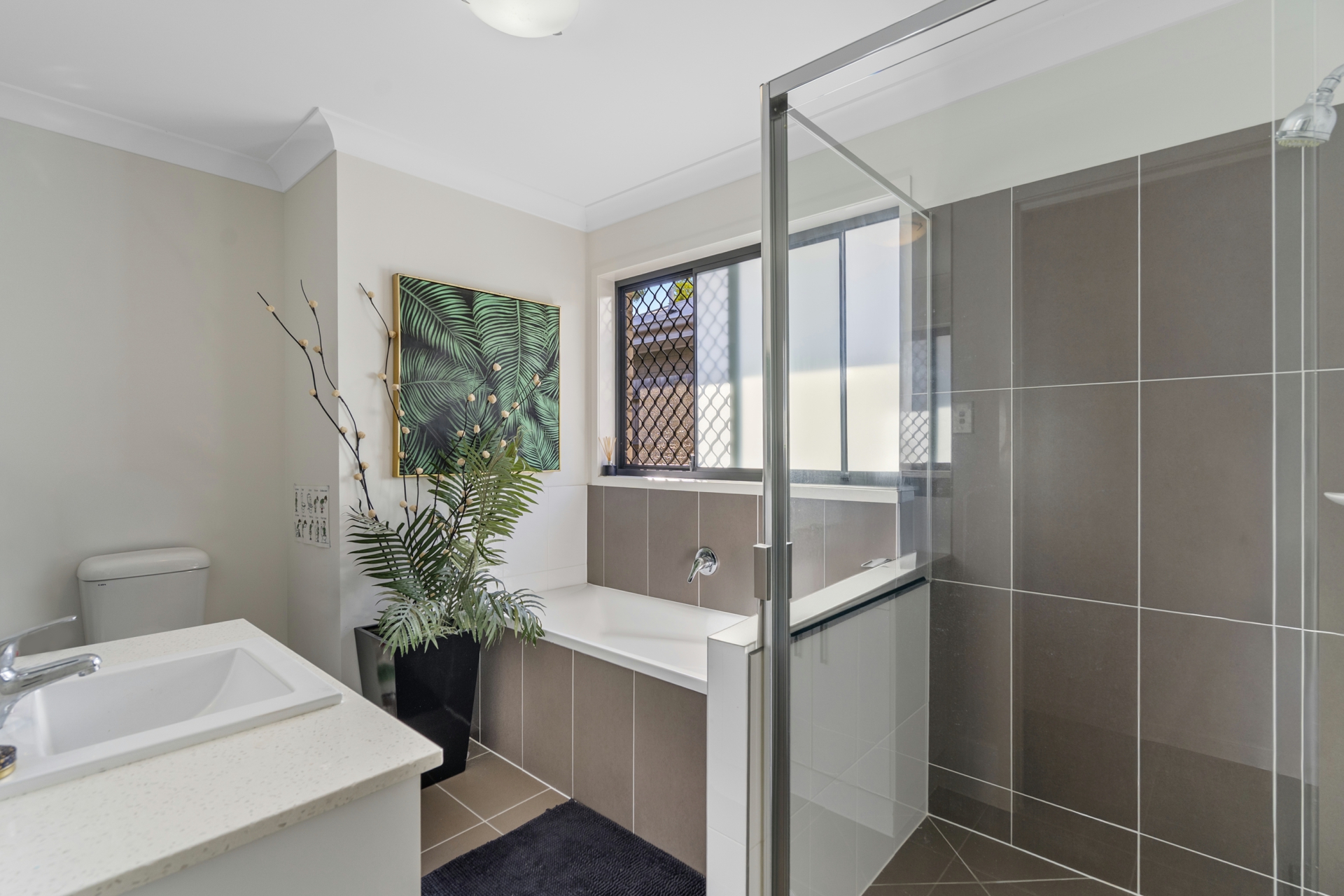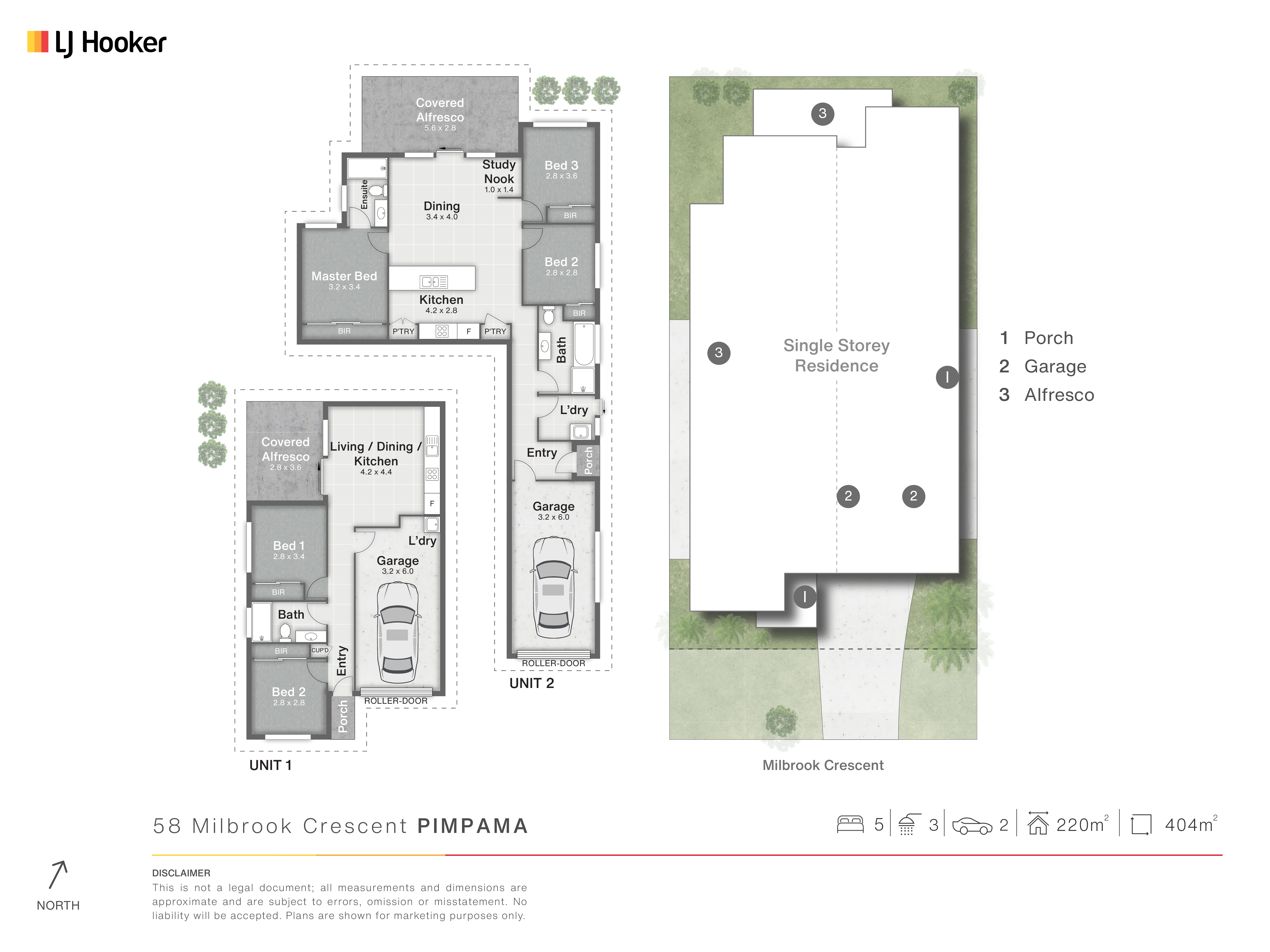 Unit 1, an elegantly appointed home, boasts three spacious bedrooms, including a serene master bedroom with garden views, and two bathrooms adorned with chic stone benchtops. A dedicated laundry room, coupled with the stylish family bathroom that features both a bath and shower, elevates the sense of luxury. The heart of the home is the kitchen, showcasing stone benchtops, which seamlessly flows into the living and dining area. The air-conditioned living space opens onto an expansive alfresco, perfect for alfresco dining and relaxation. Bedrooms 2 and 3, both equipped with wardrobes and ceiling fans, ensure comfortable accommodations for all. The substantial garden space promises a safe haven for children and pets to frolic.