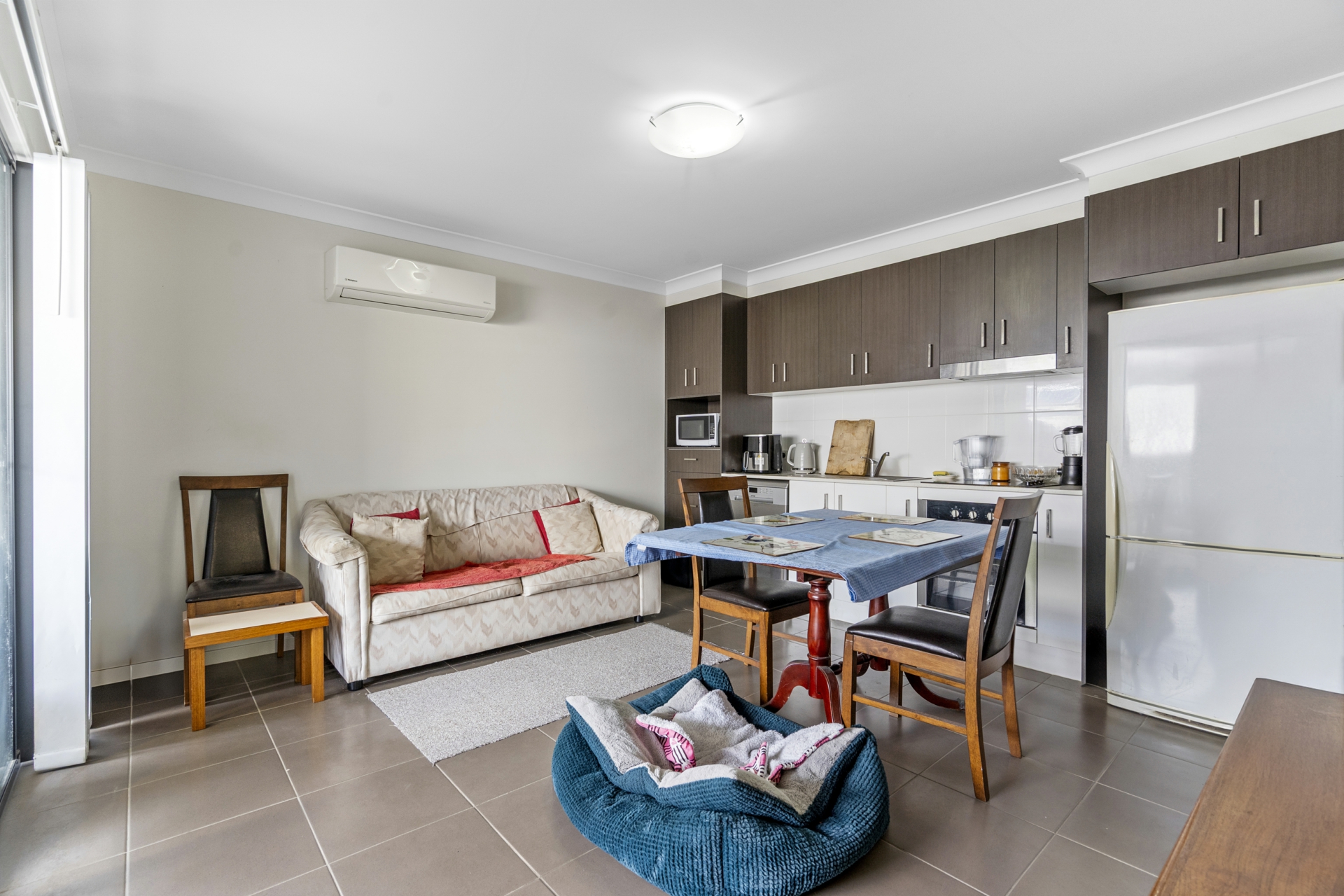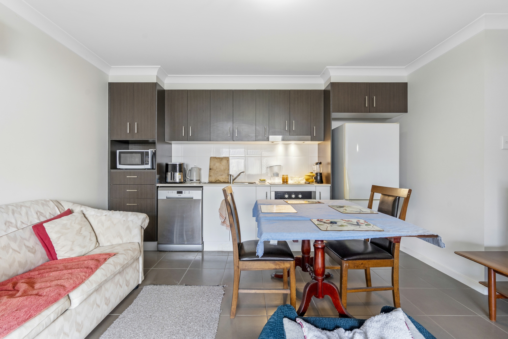 Unit 2 is an equally impressive abode, with two generously sized bedrooms and a sleek bathroom complemented by stone benchtops. The open-plan design integrates living, dining, and kitchen areas with stone benchtops, fostering a social atmosphere that spills out into the alfresco space.