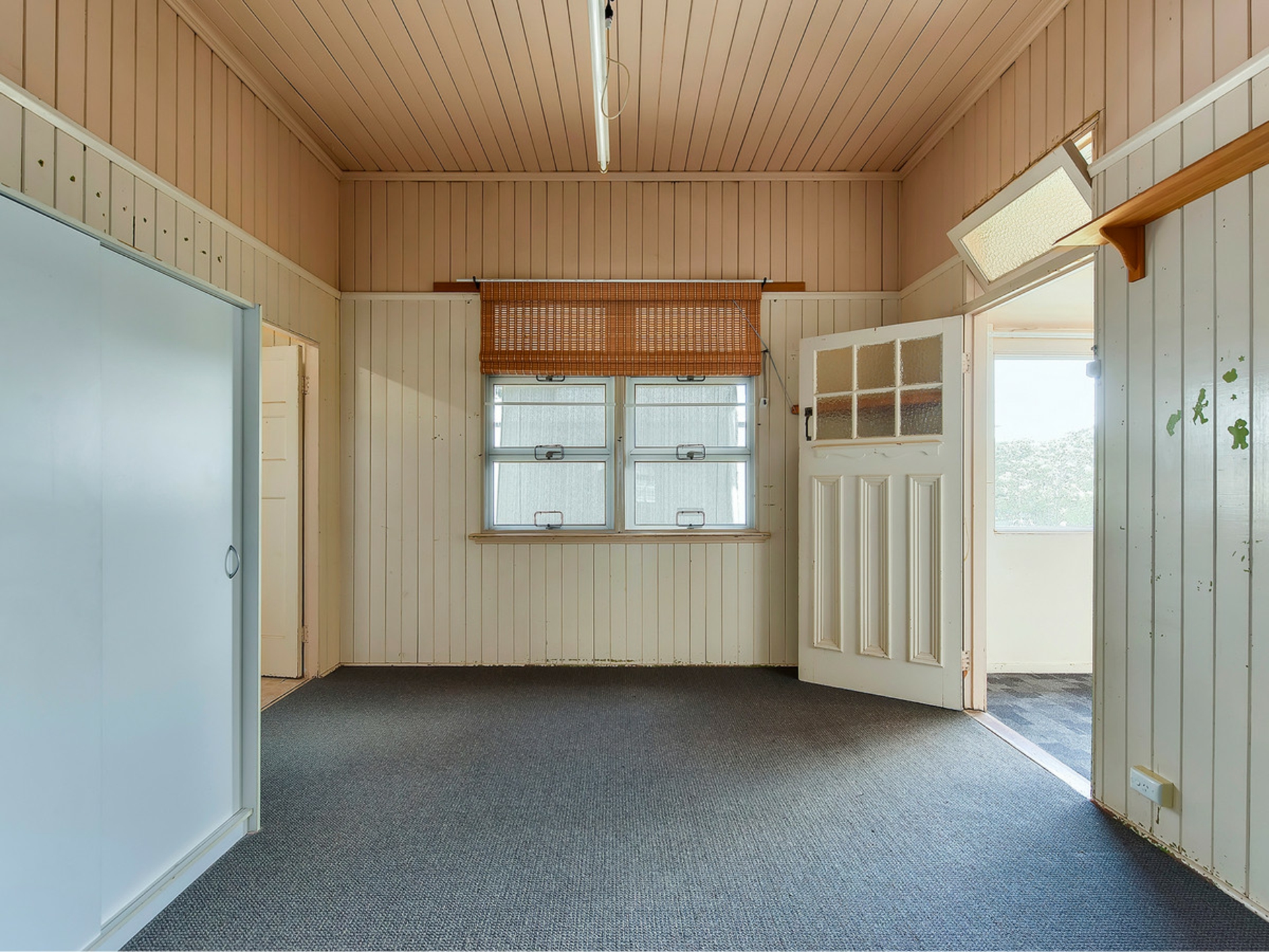 • VJ walls, gabled facade, high ceilings, hardwood frame.