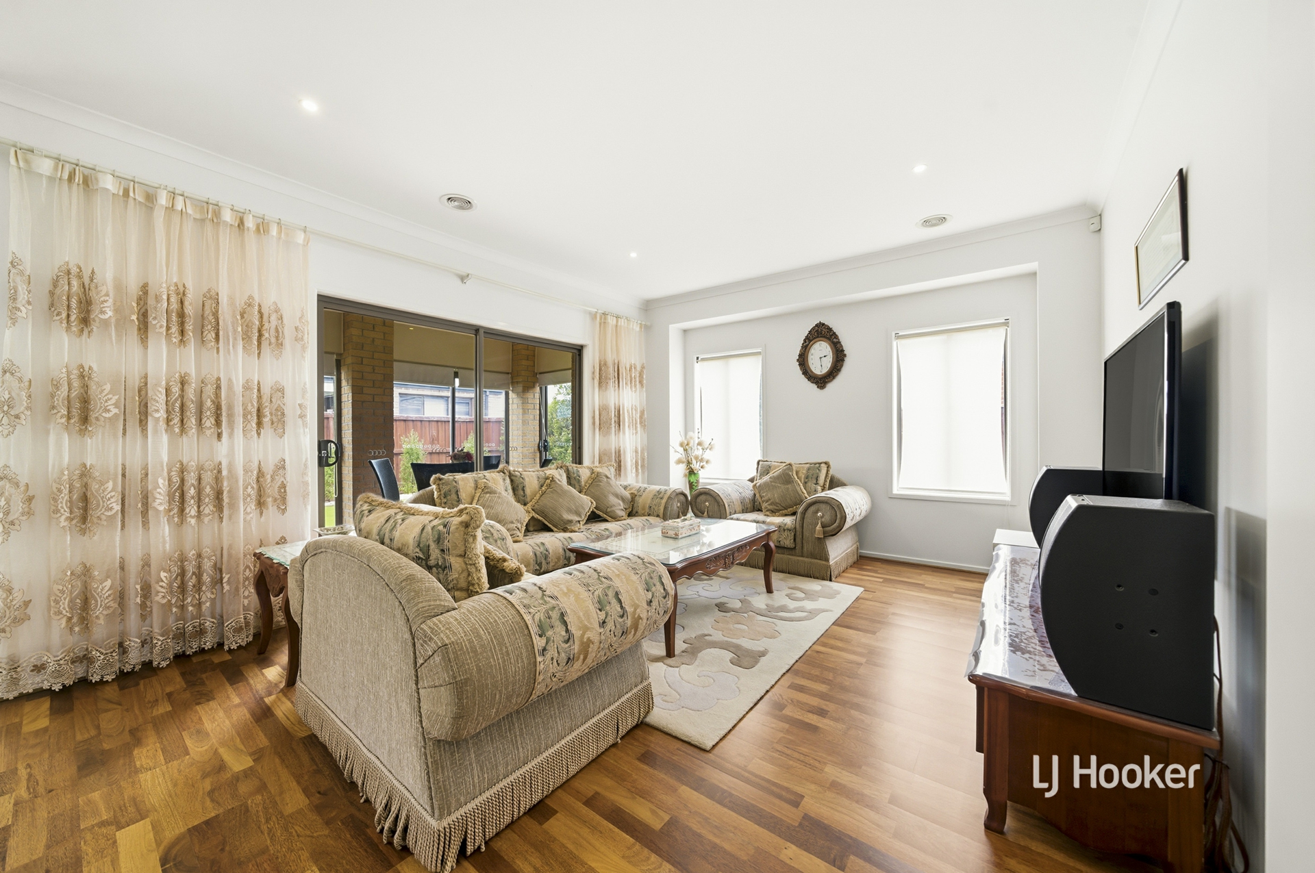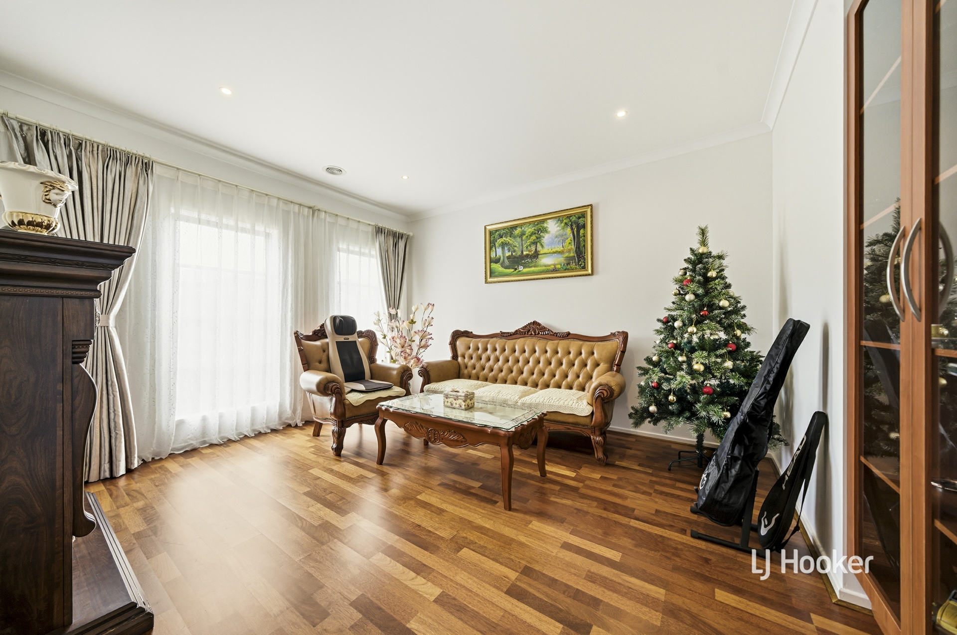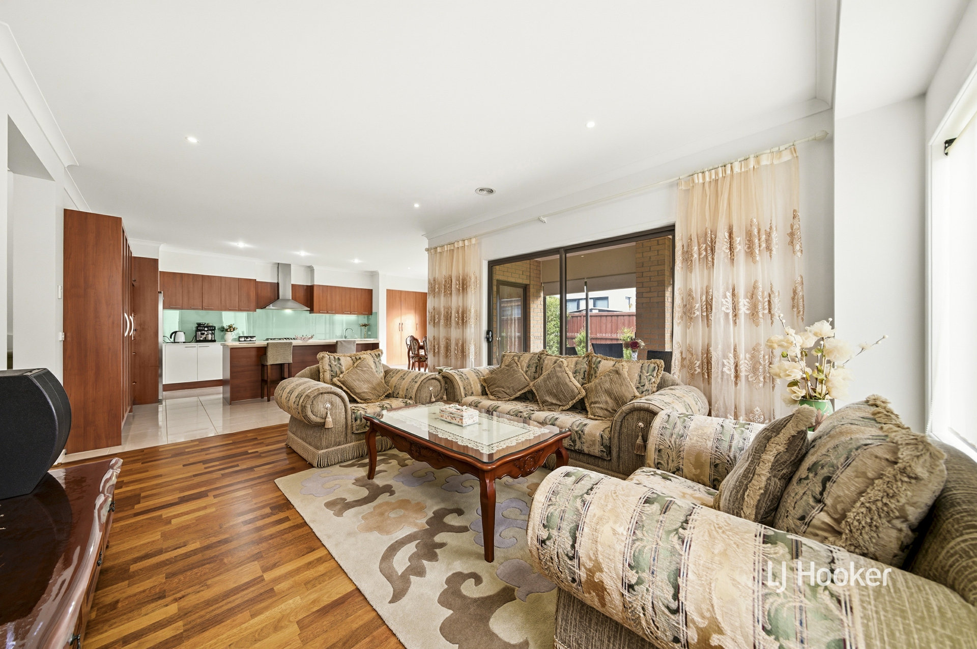 - Neat hedges offer privacy for a manicured front yard, timber porch patio, and stately facade, leading into the lower level of the home with formal lounge and open-plan living/dining/kitchen offering sundrenched shared areas with stunning floorboards underfoot for prime relaxation and entertainment. An upstairs carpeted retreat provides an additional versatile family space.