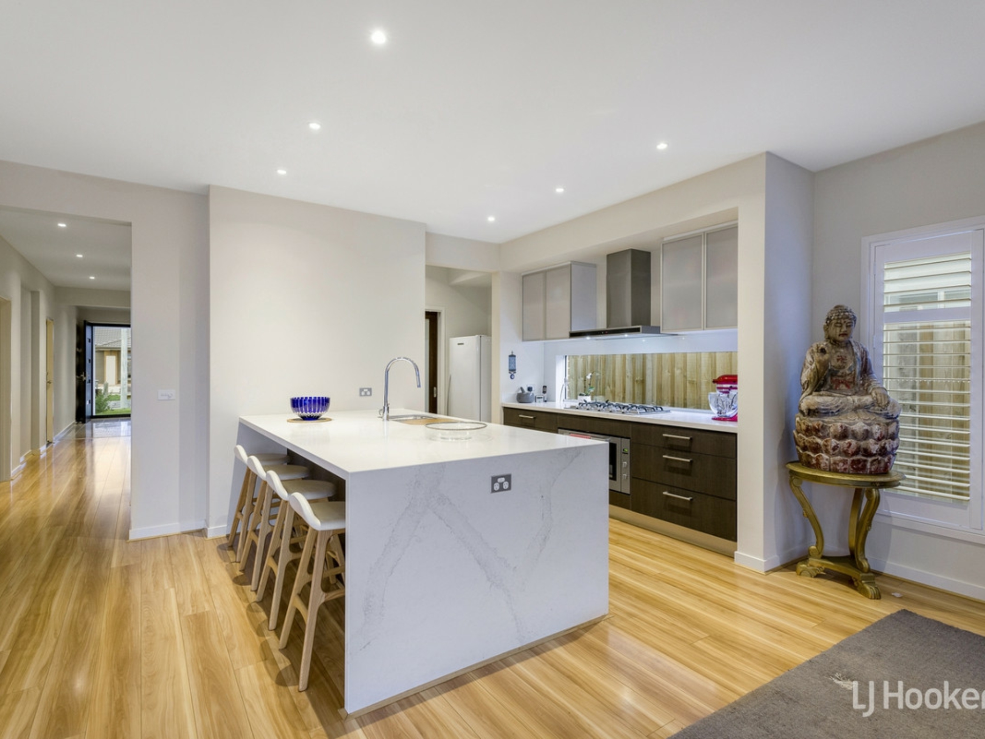 - The kitchen radiates modern excellence complete with stainless steel appliances including 900mm under bench oven, gas cooktop and rangehood, dishwasher, spacious butler's pantry and waterfall stone benchtops with bench space for casual meals.