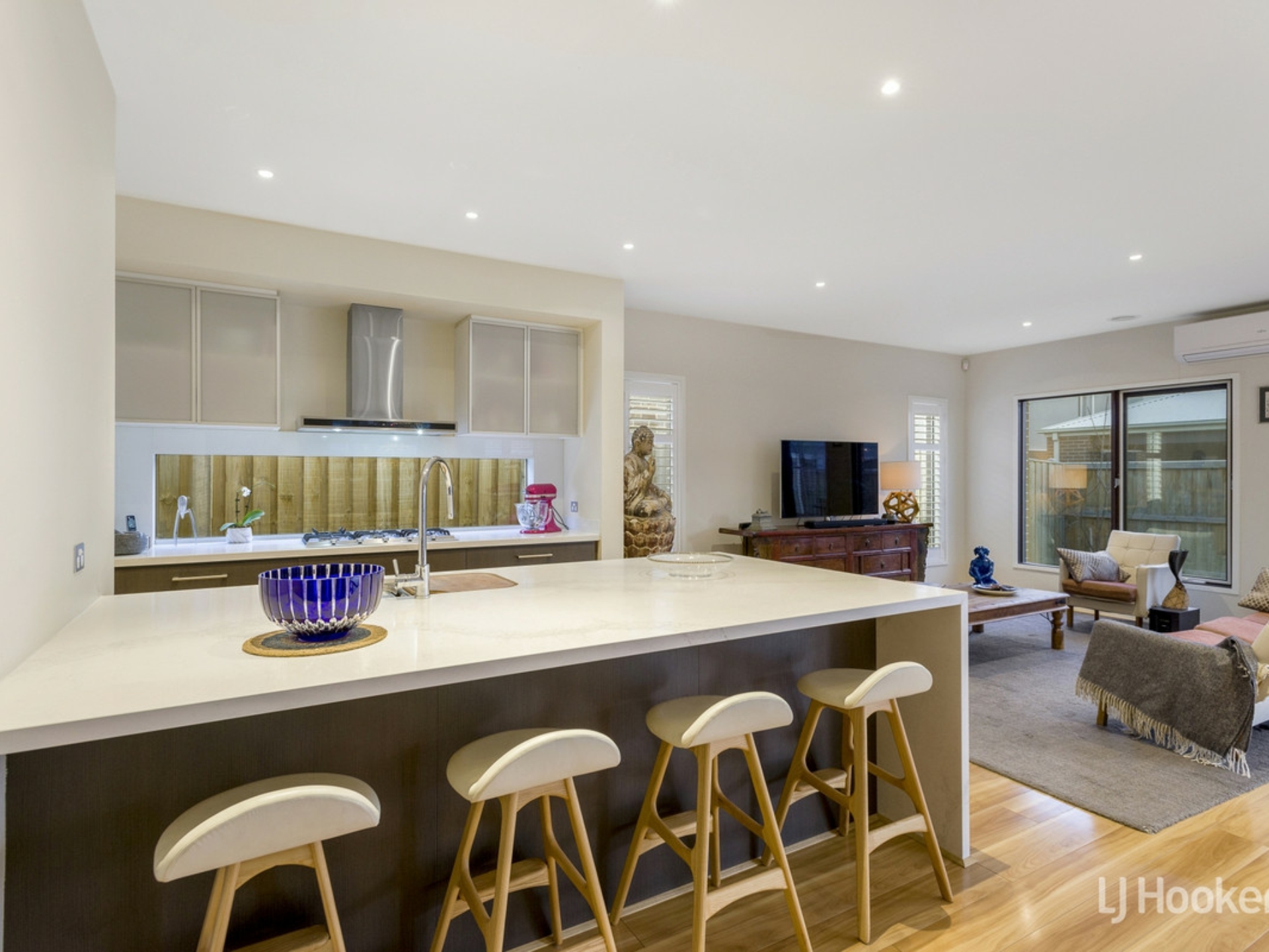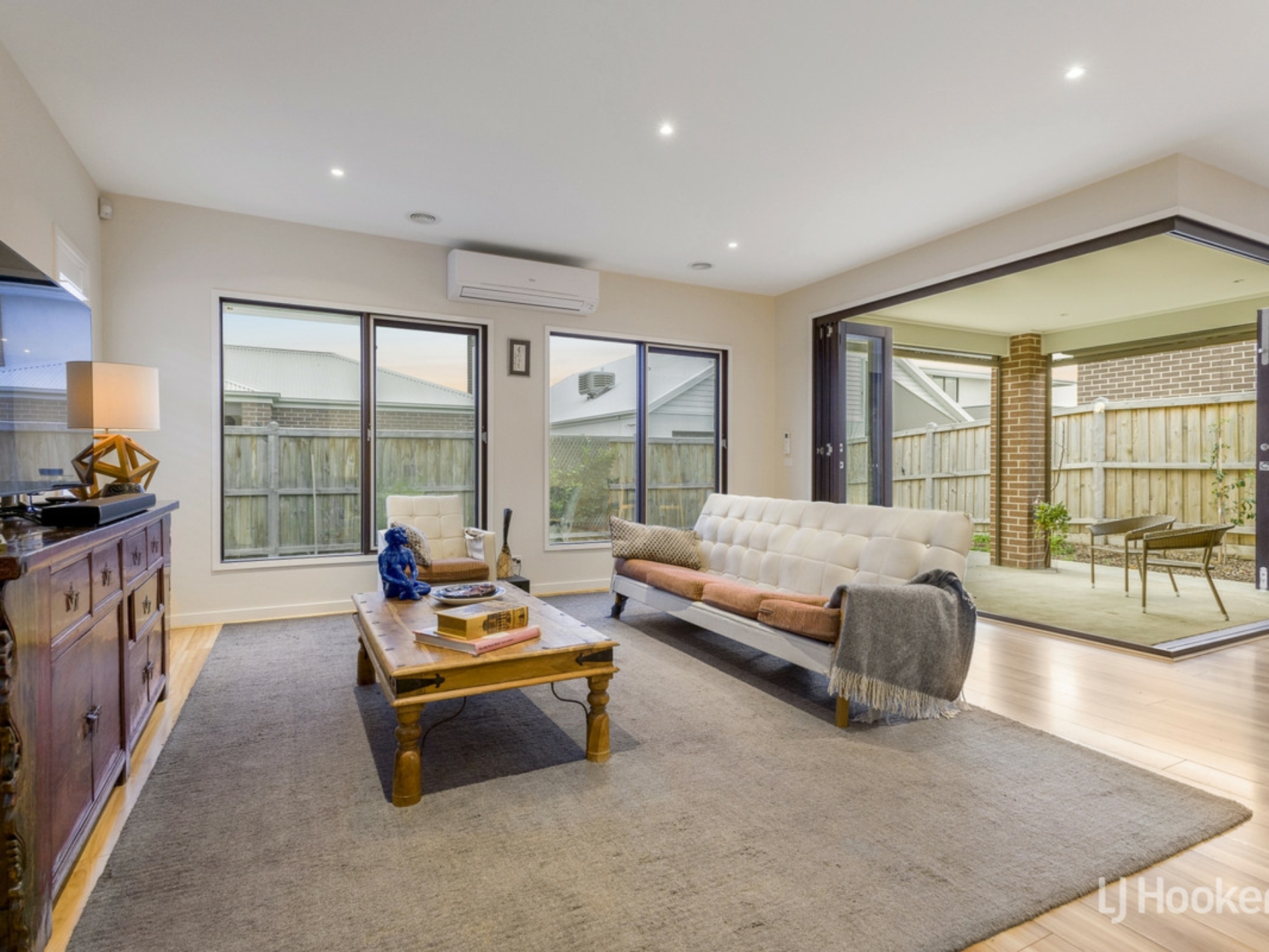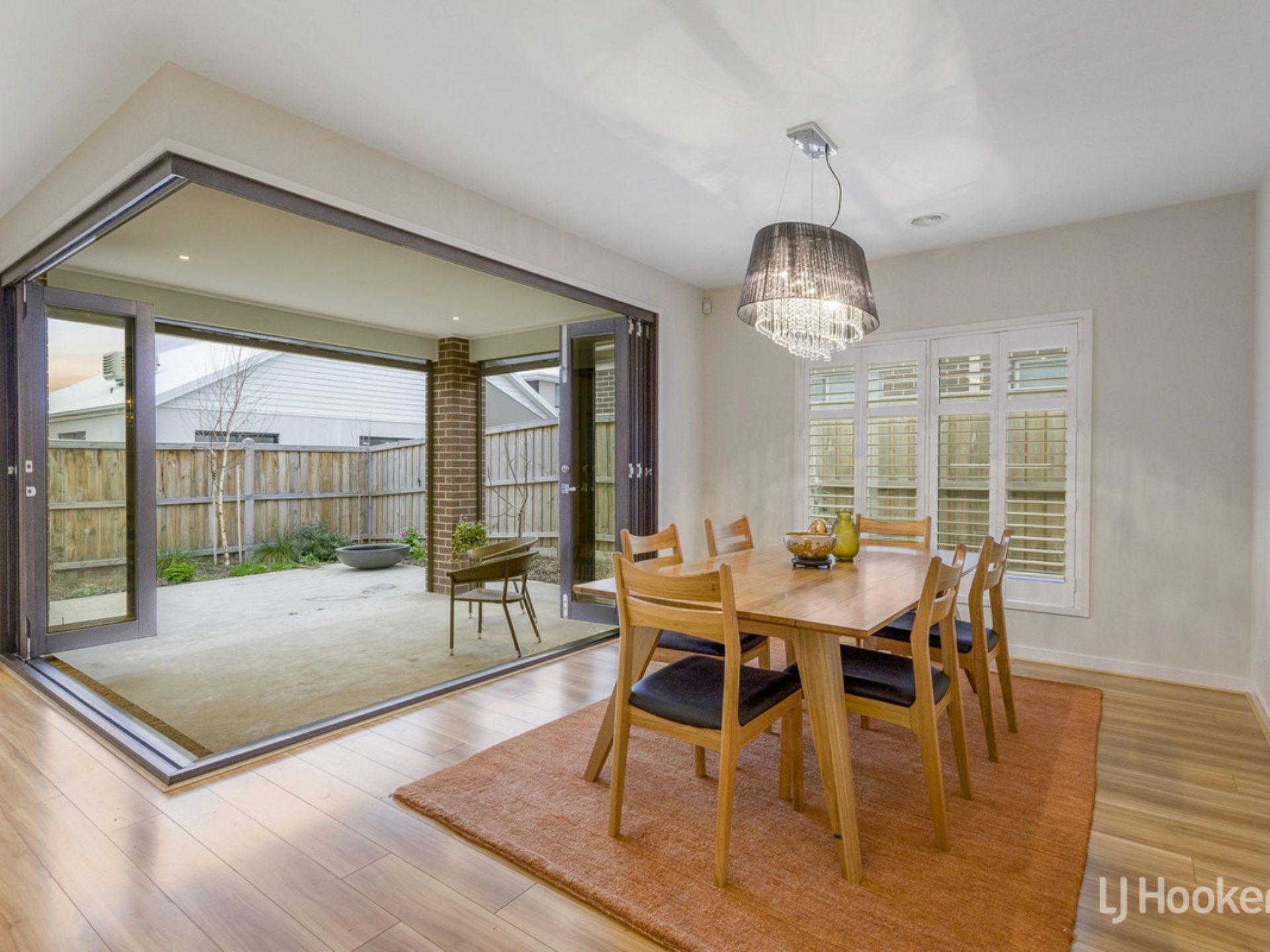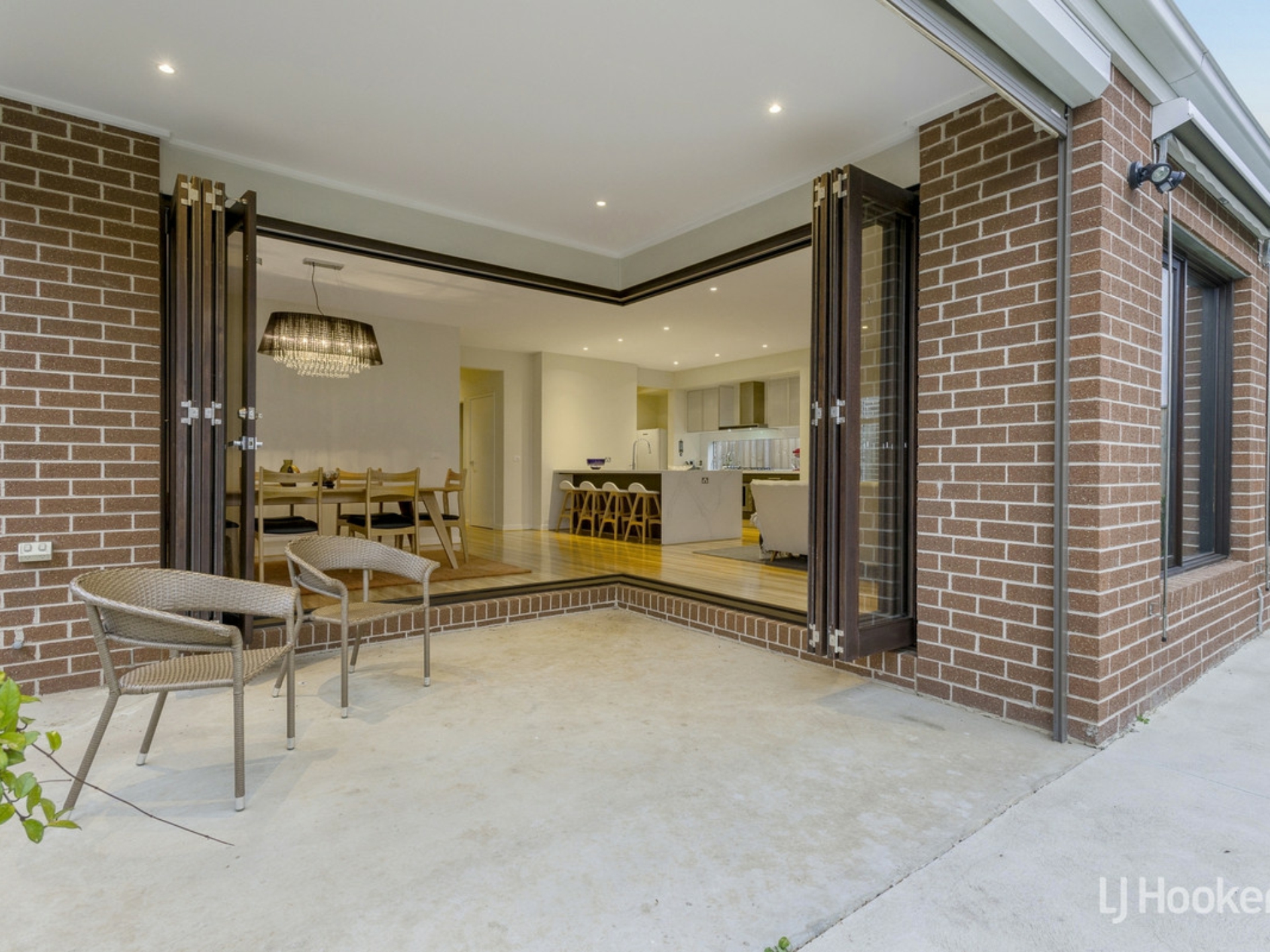 - The open plan living and dining area has been designed perfectly for entertaining and flows seamlessly through hardwood bi-fold doors to the outdoor alfresco area with cafe blinds for year round enjoyment.