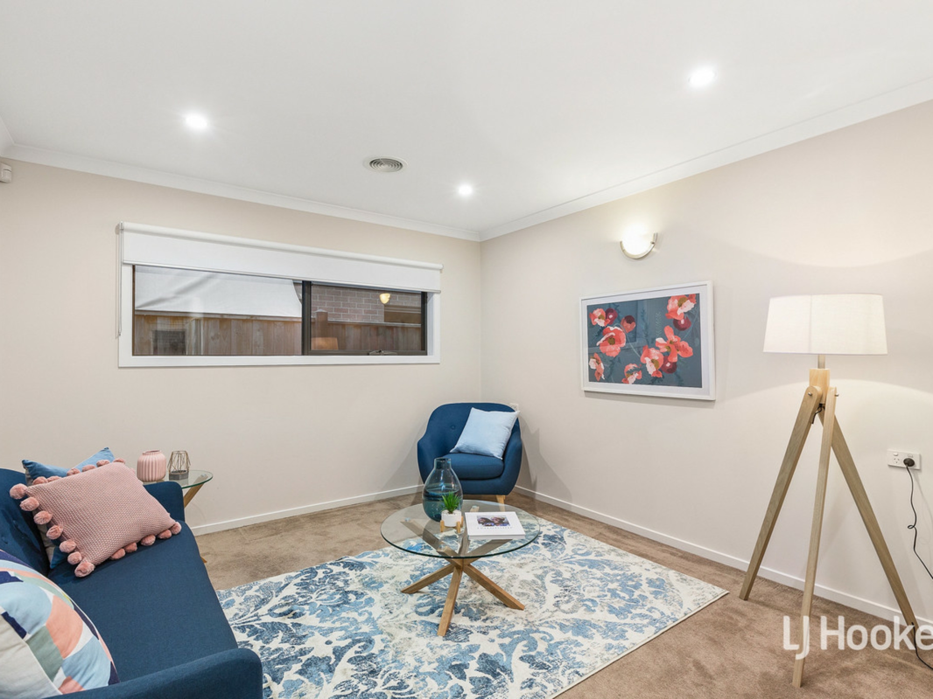 - Elegant and distinguished living spaces include the carpeted lounge room and tiled open plan meals and family area adjacent the kitchen.