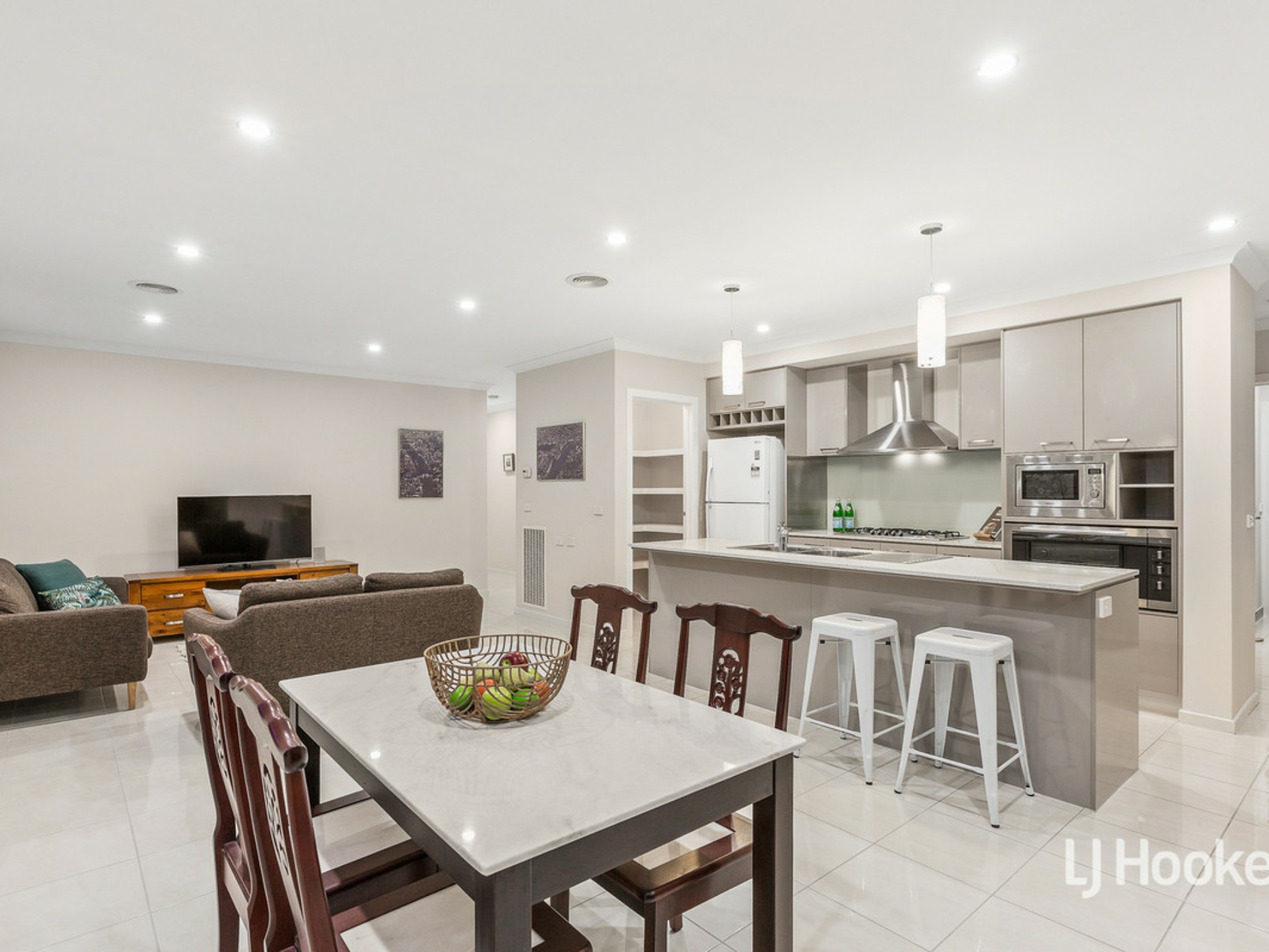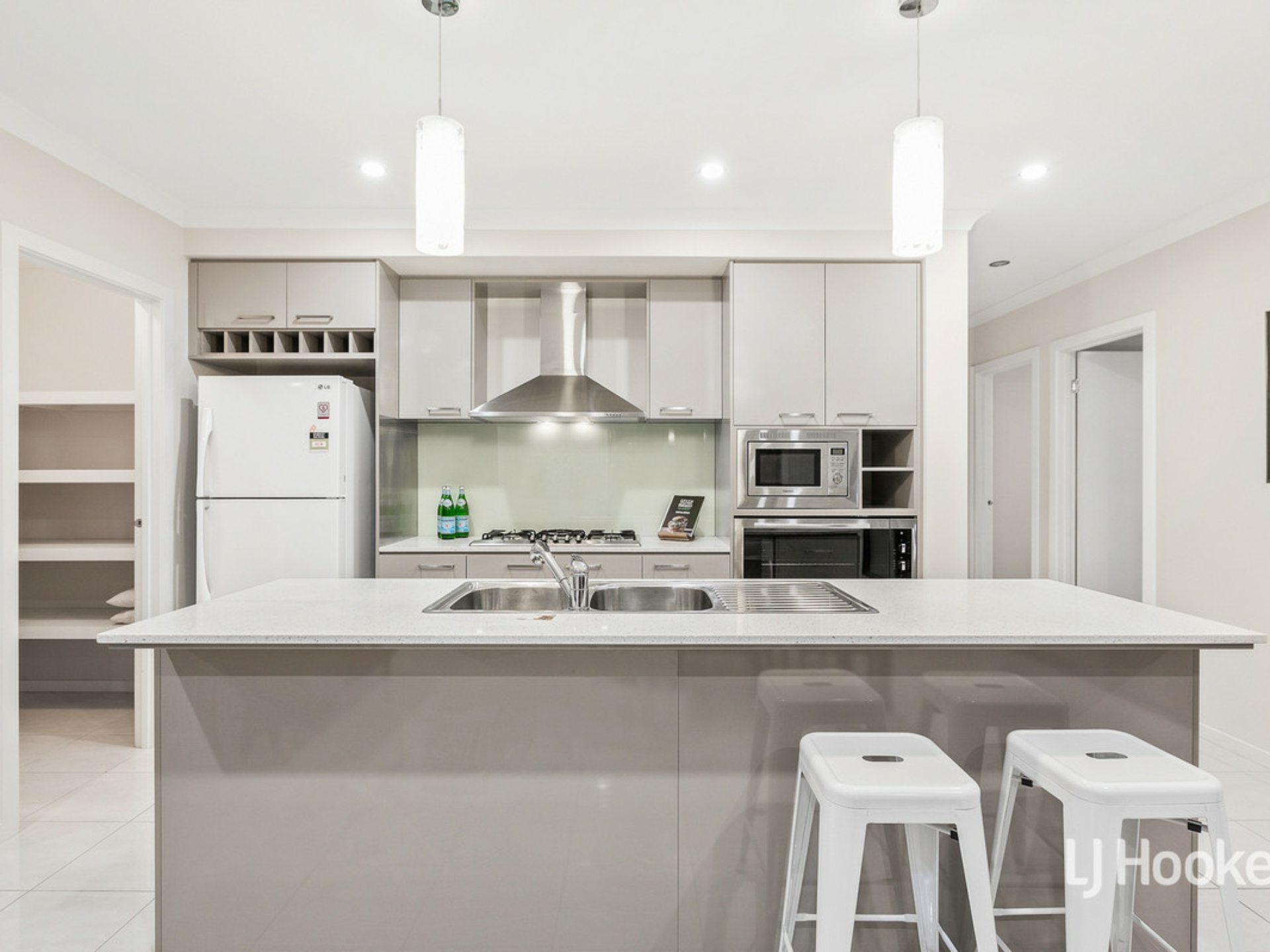 - The contemporary kitchen is well-equipped with stainless steel appliances including 900mm wall oven, gas cooktop and rangehood, dishwasher, integrated microwaves, stone bench tops, glass splash back, built in wine rack, walk in pantry and island bench with pendant lighting.