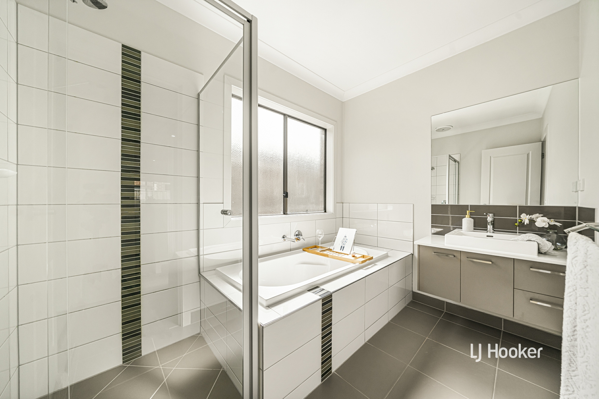 - Four carpeted bedrooms provide comfortable accommodation, including a main bedroom positioned at the front of the home, complete with a walk-in robe and private ensuite featuring a semi-frameless glass shower and vanity with storage. The remaining three bedrooms are each fitted with built-in robes and are serviced by a modern main bathroom with a separate bath and separate toilet.