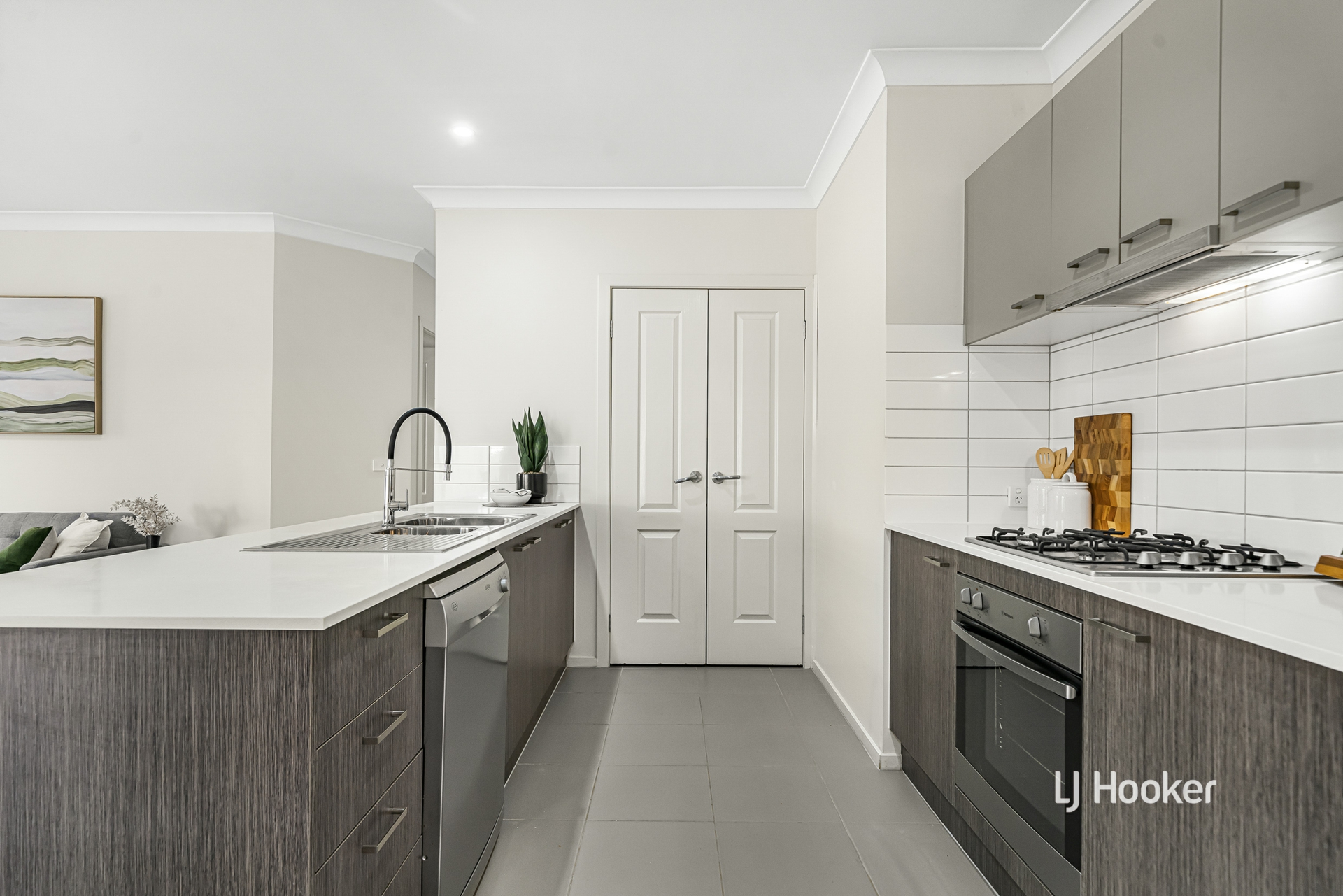 - The galley-style kitchen is a culinary haven, boasting a 600mm electric under-bench oven, gas cooktop, dishwasher, rangehood, stone benchtops, dual sink with side drainer, a double-door pantry, and ample cupboard and storage space.
