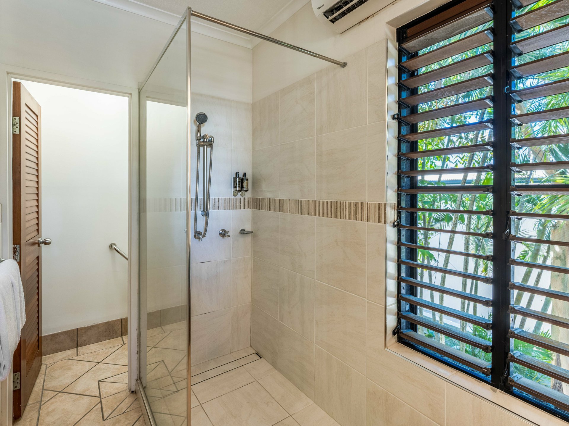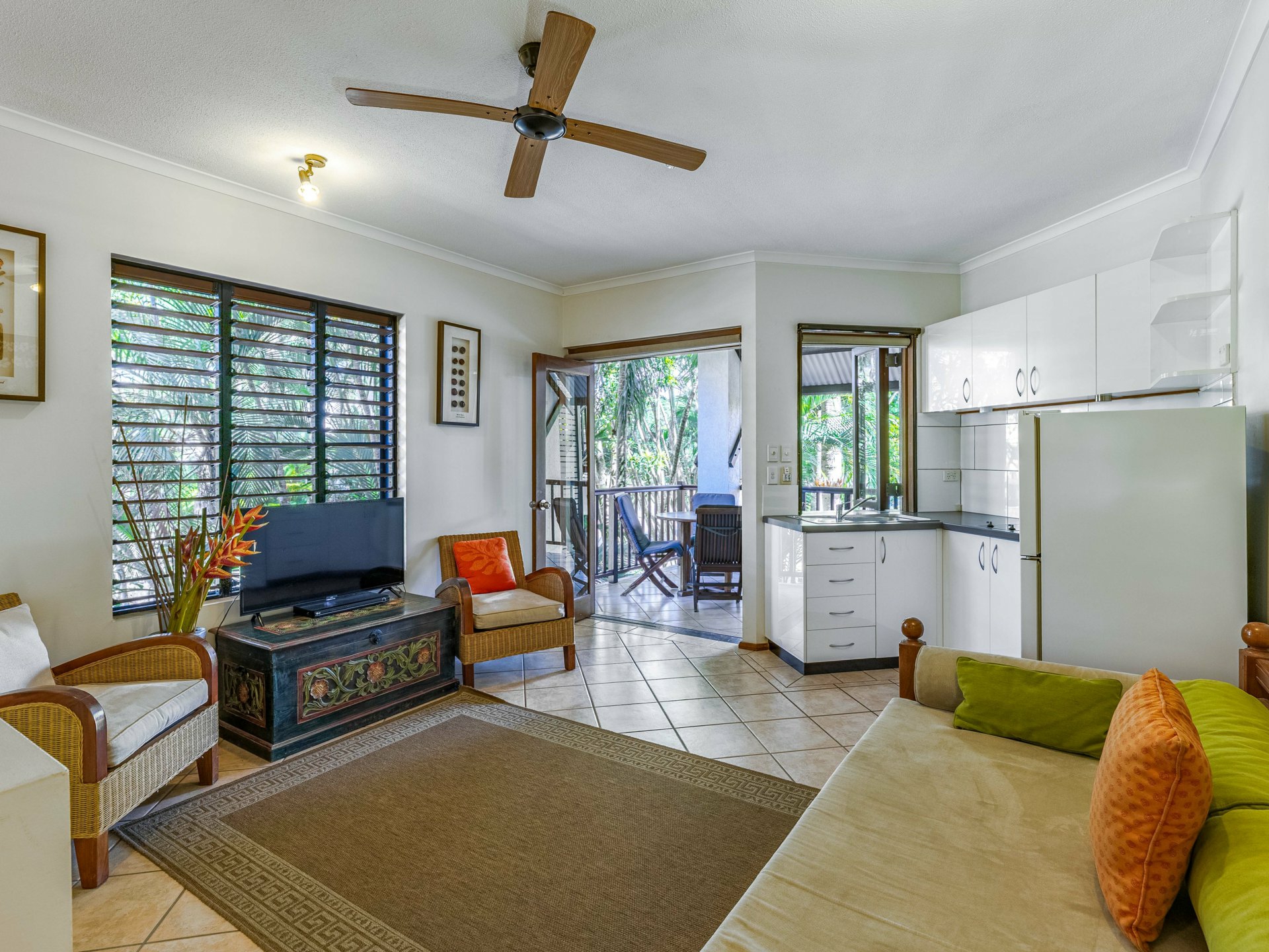 Feature timber sliding doors separate the breezy king-sized bedroom from the main living area. Tiled for maximum convenience, the bedroom comes complete with air-conditioning, ceiling fan, a built-in wardrobe and upgraded ensuite with easy access walk-in shower, modern vanity and tropical garden outlook through timber louvres.