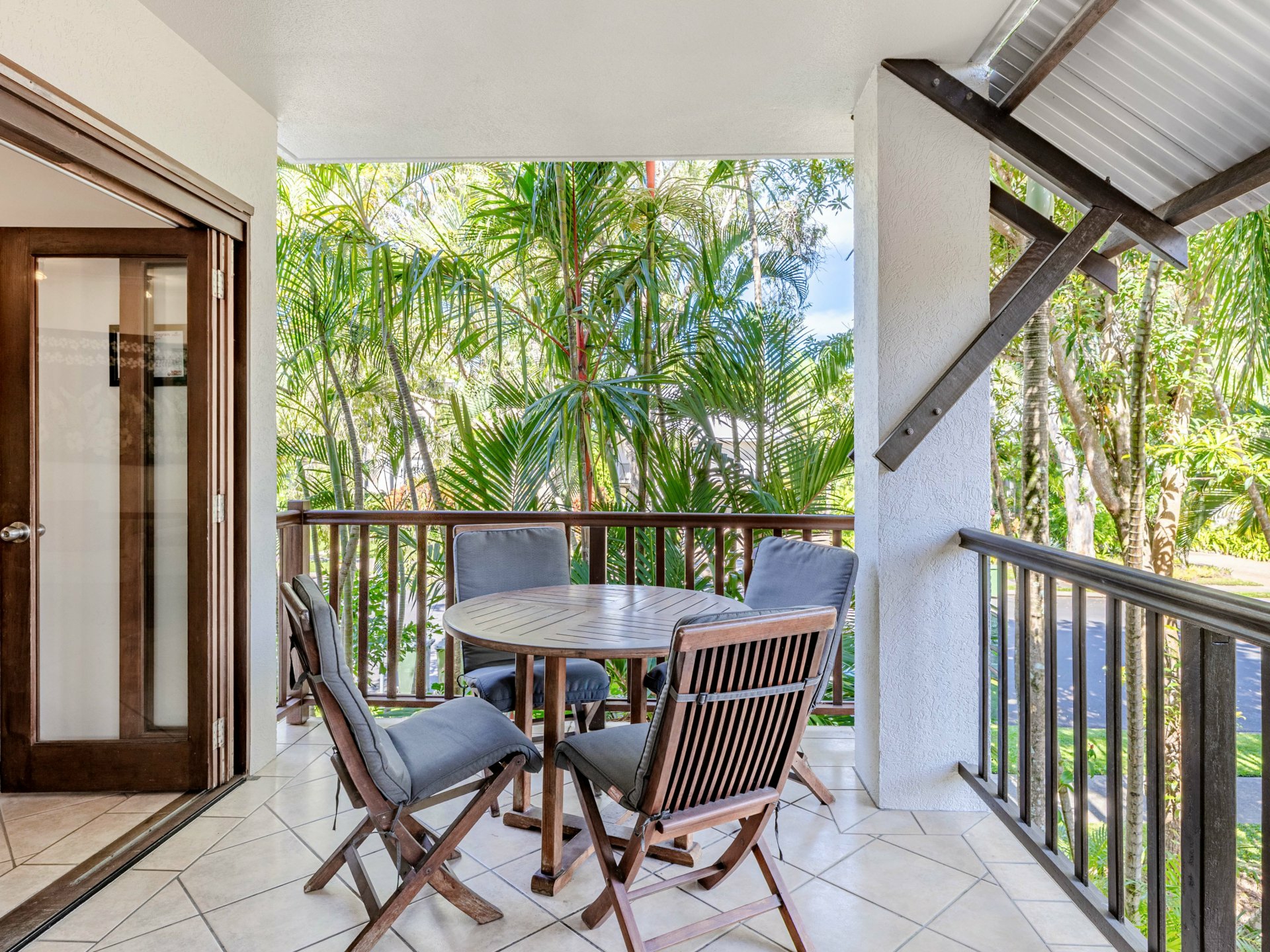 pool view balcony that frames the entry into the apartment.