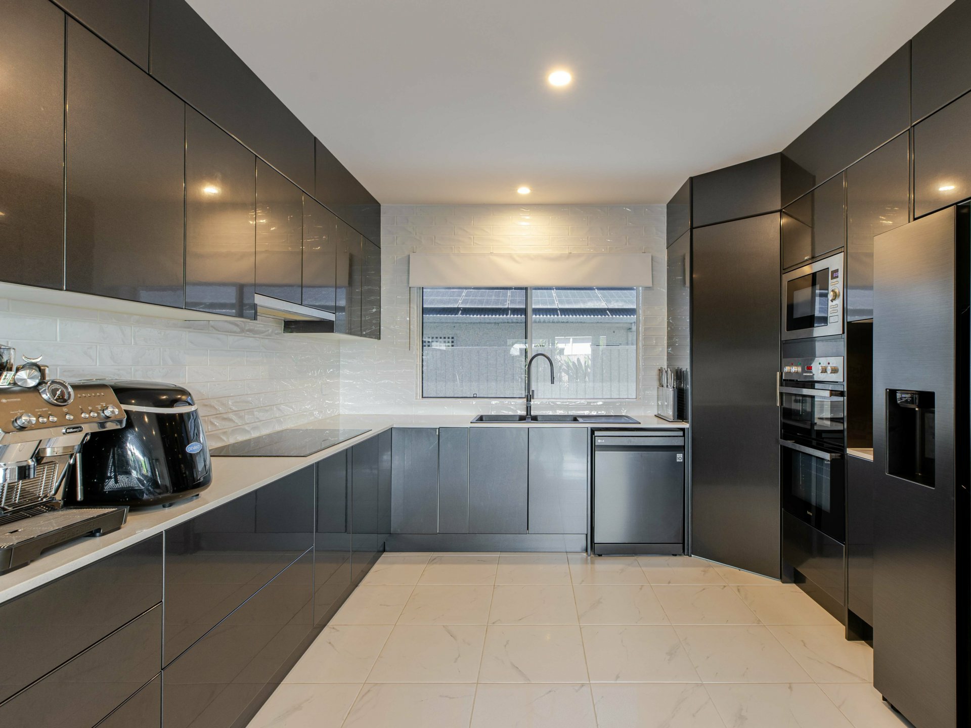 The modern kitchen is a feature - the contemporary design comes complete with stone benchtops, a conventional oven, additional steam oven, sleek cooktop, dishwasher, large fridge recess, dual sinks and excellent storage space care of the abundant drawers and cupboards that are finished flush with the ceiling.