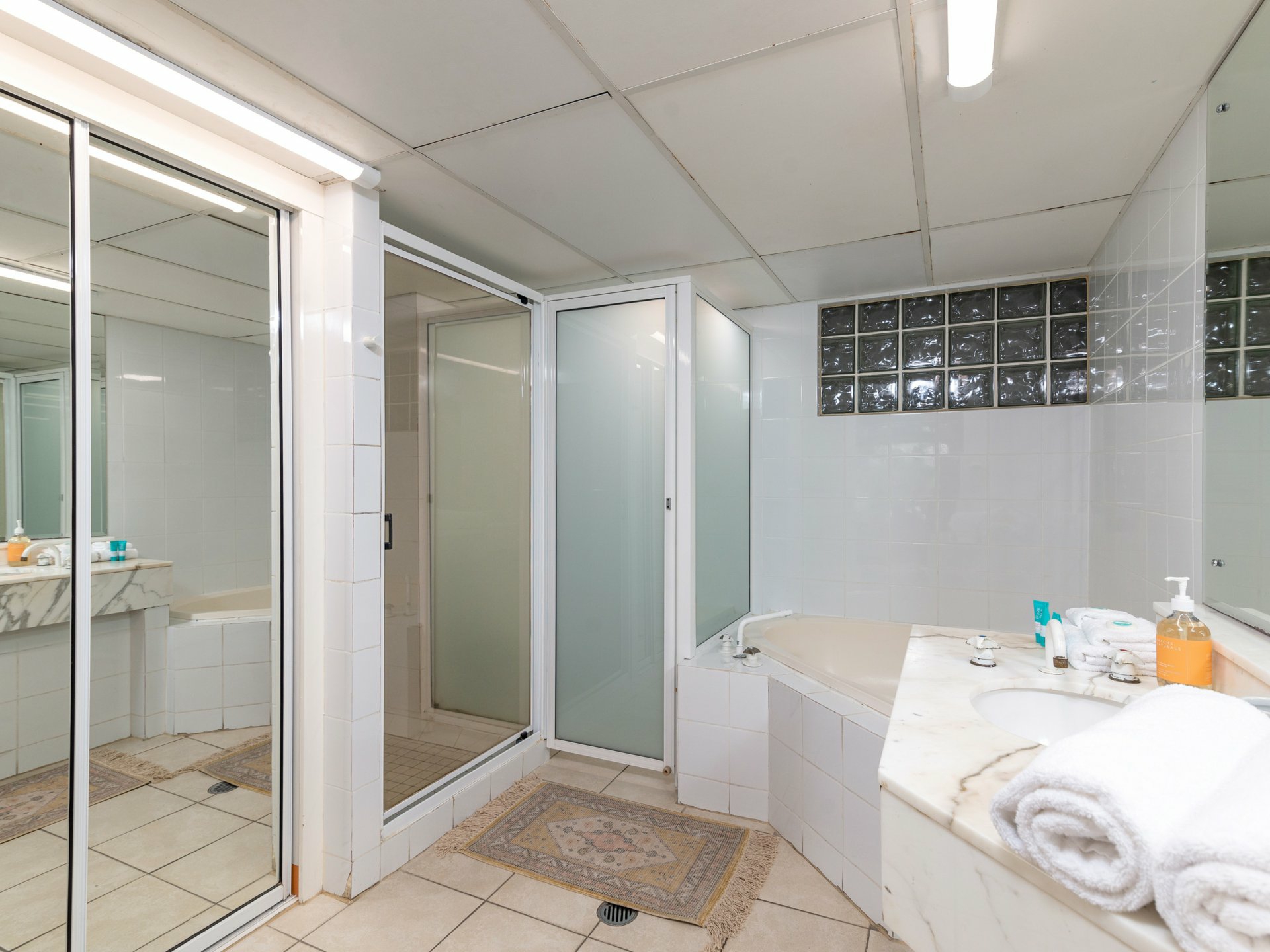 The crisp white decor will keep you feeling cool, while the combination of air conditioning and ceiling fans will help ensure your comfort at all times.
