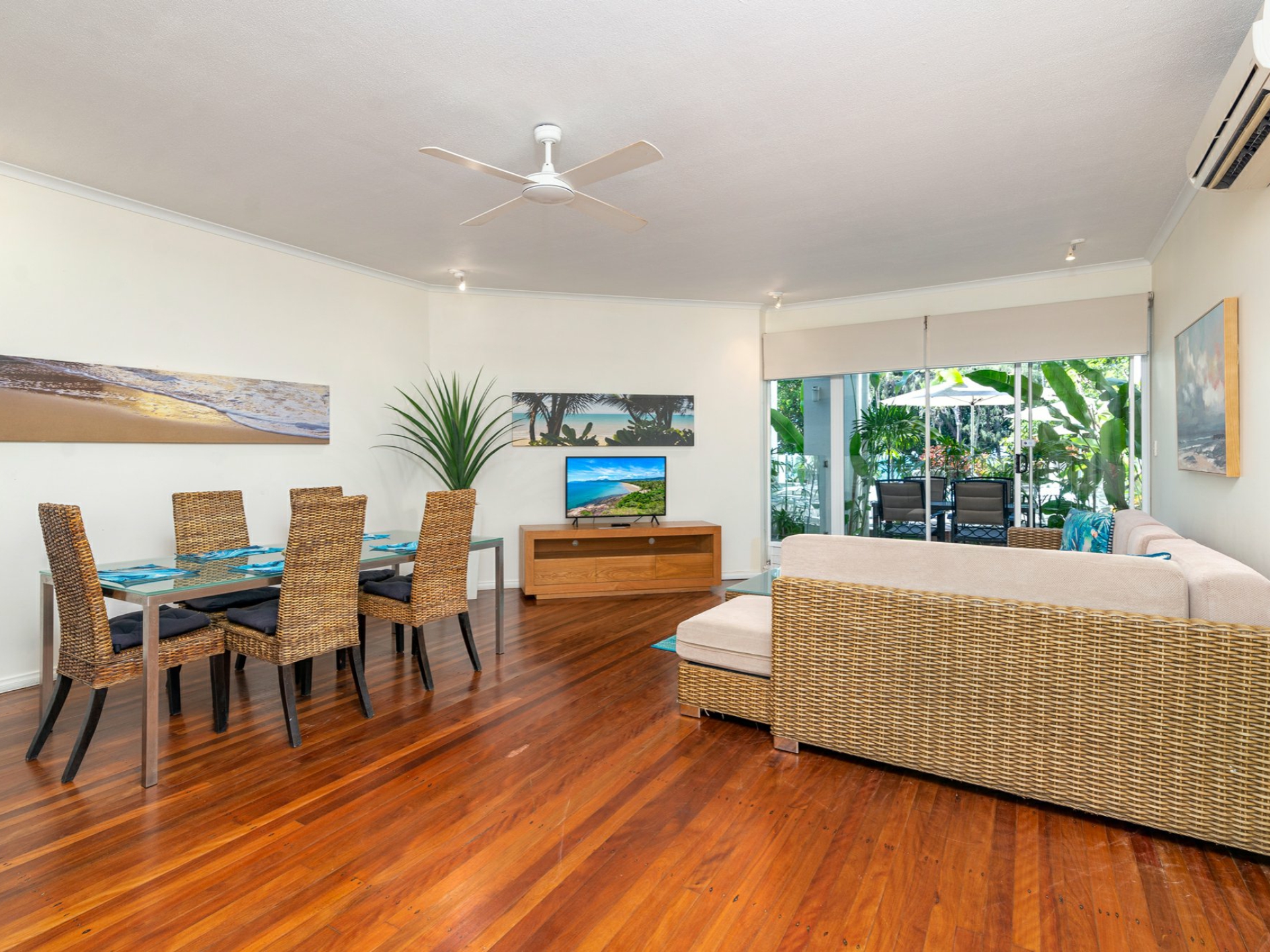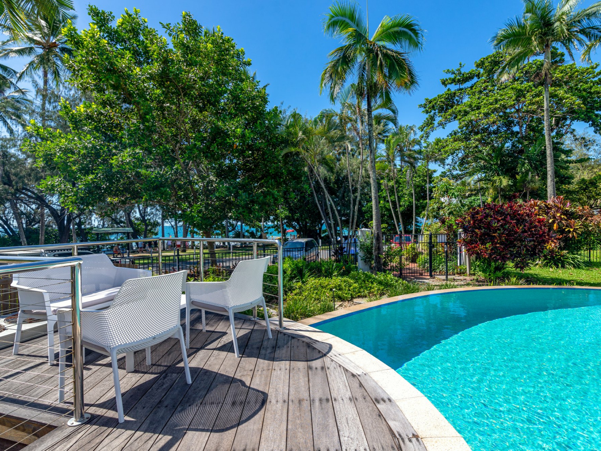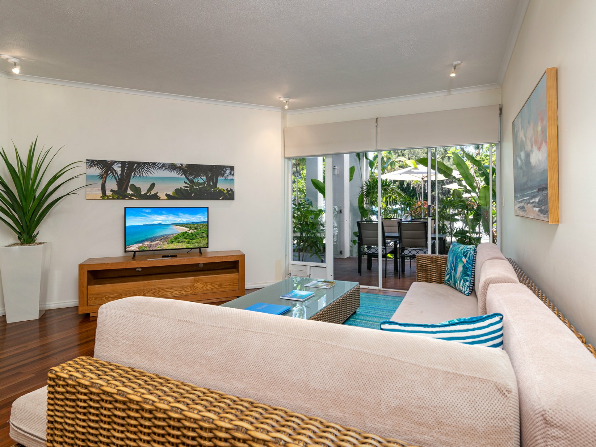 With its high ceilings and neutral decor, the open plan lounge and dining area provides a great sense of space and opens directly onto the large poolside patio. Breezes drifting in across the Coral Sea, air conditioning and ceiling fans combine to help assure your year-round comfort.