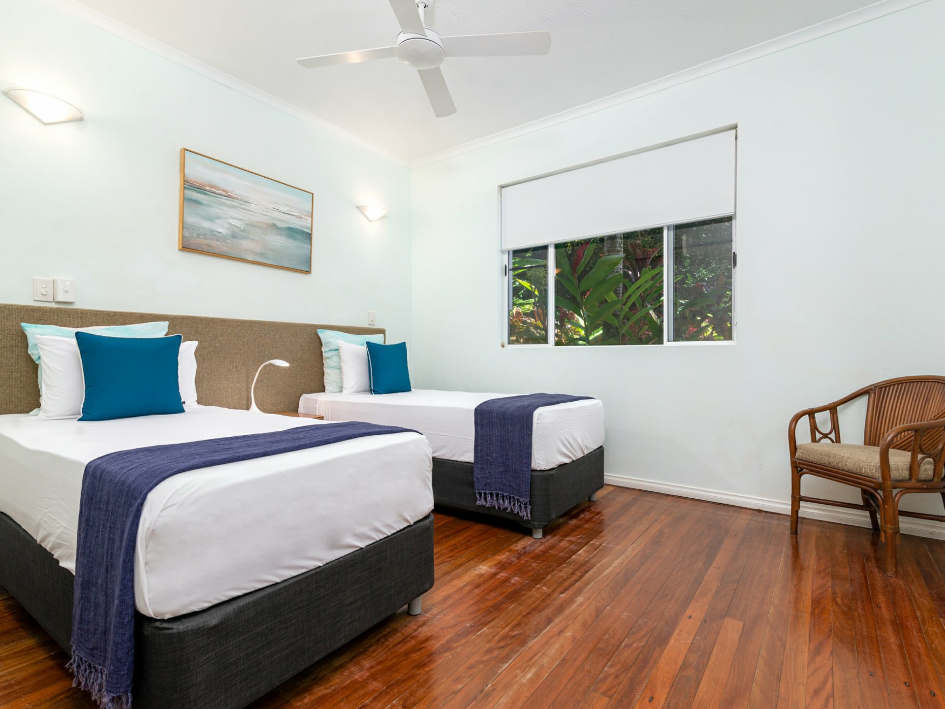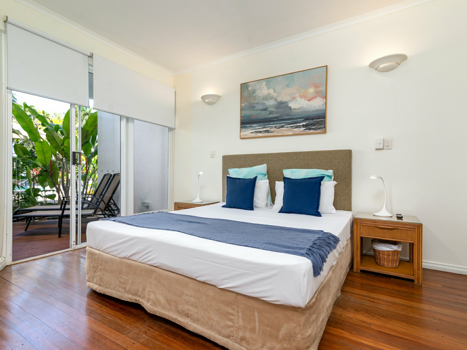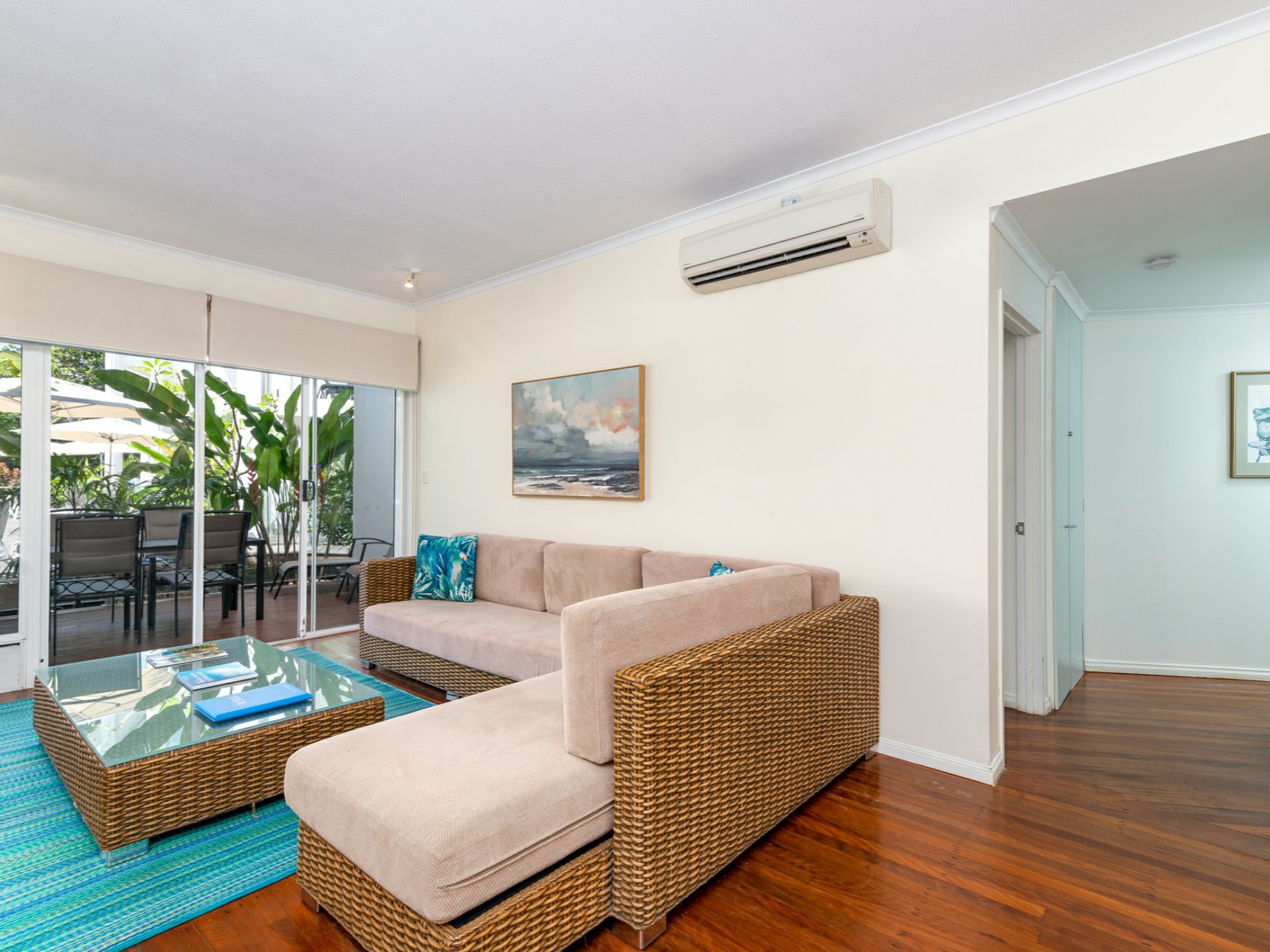 With its high ceilings and neutral decor, the open plan lounge and dining area provides a great sense of space and opens directly onto the large poolside patio. Breezes drifting in across the Coral Sea, air conditioning and ceiling fans combine to help assure your year-round comfort.