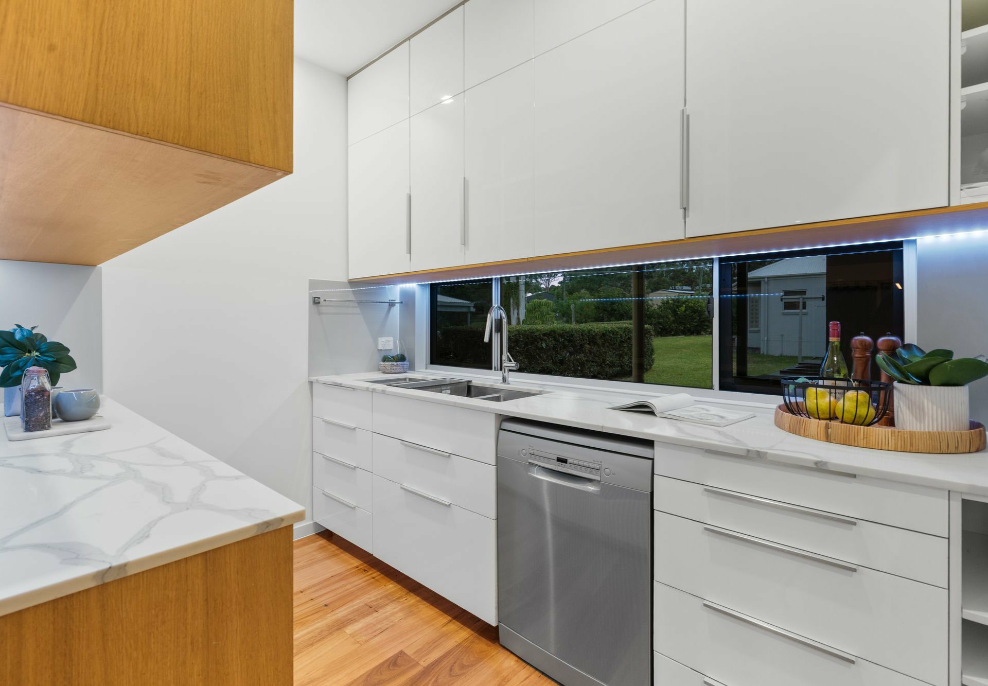 The granny flat is every bit as polished, and spacious, as the main home. It features a huge gourmet kitchen with a large island counter, butler's pantry, and big glass sliders that lead out to the enclosed sunroom and two decks.