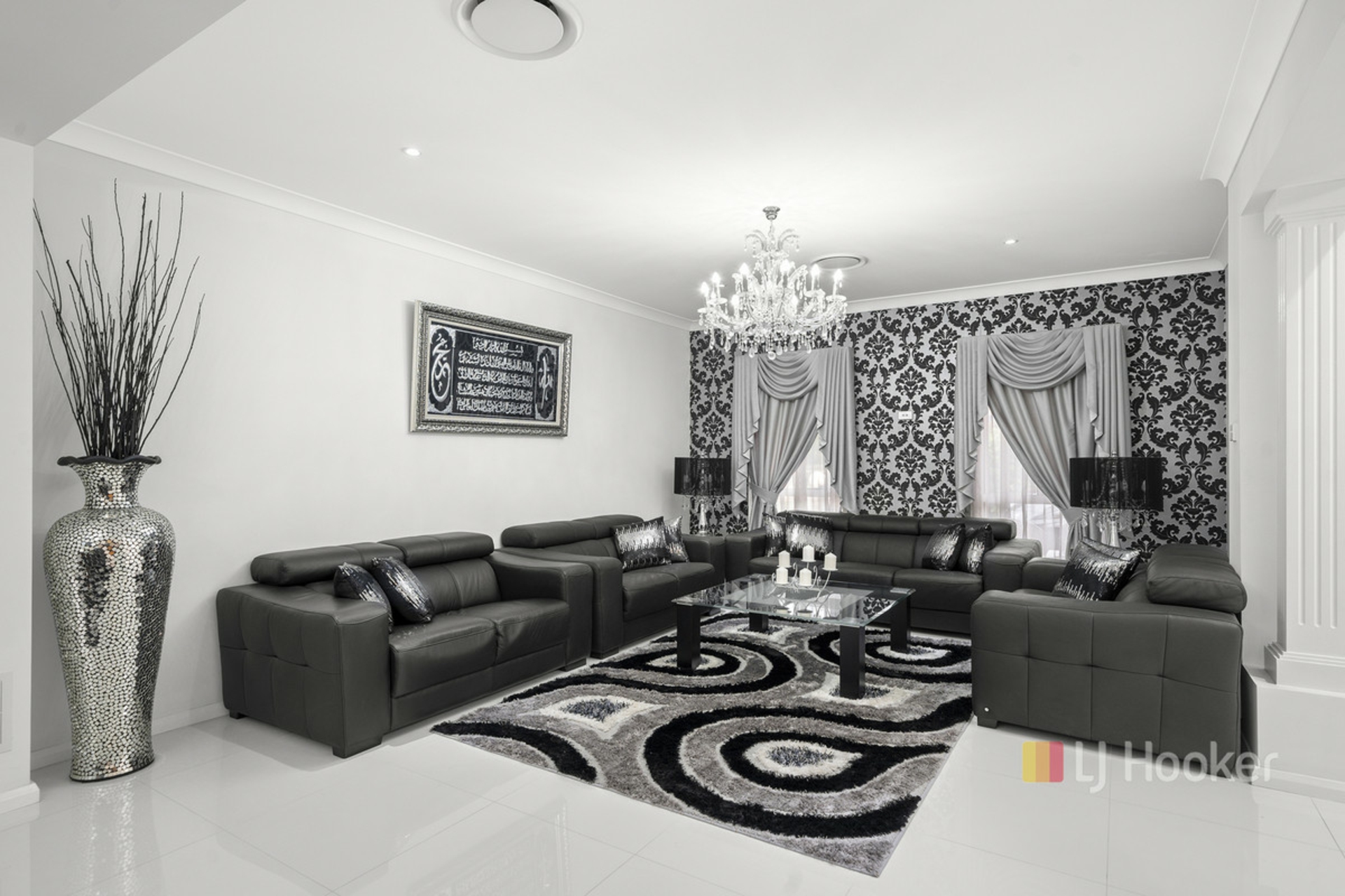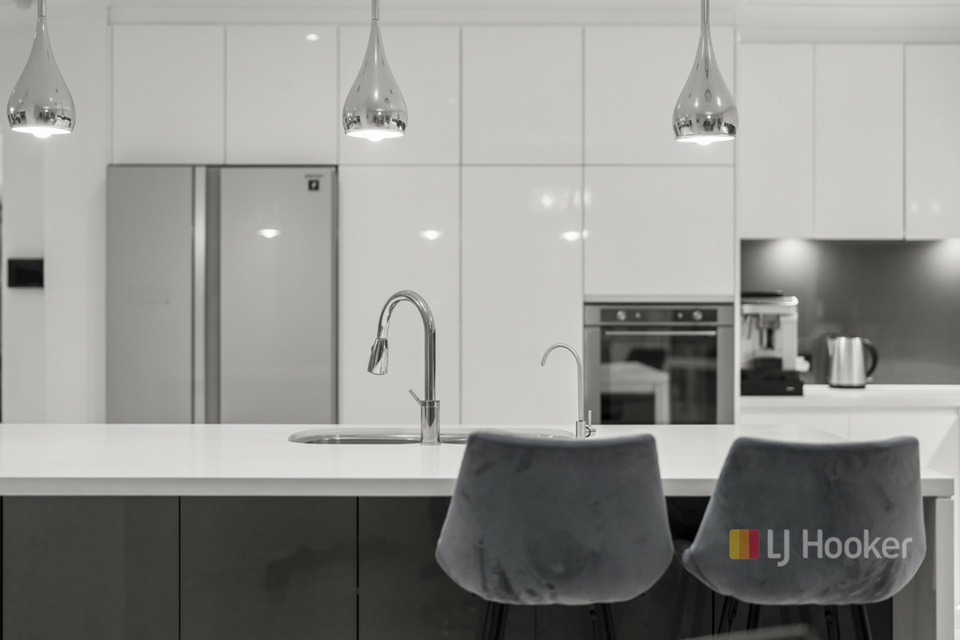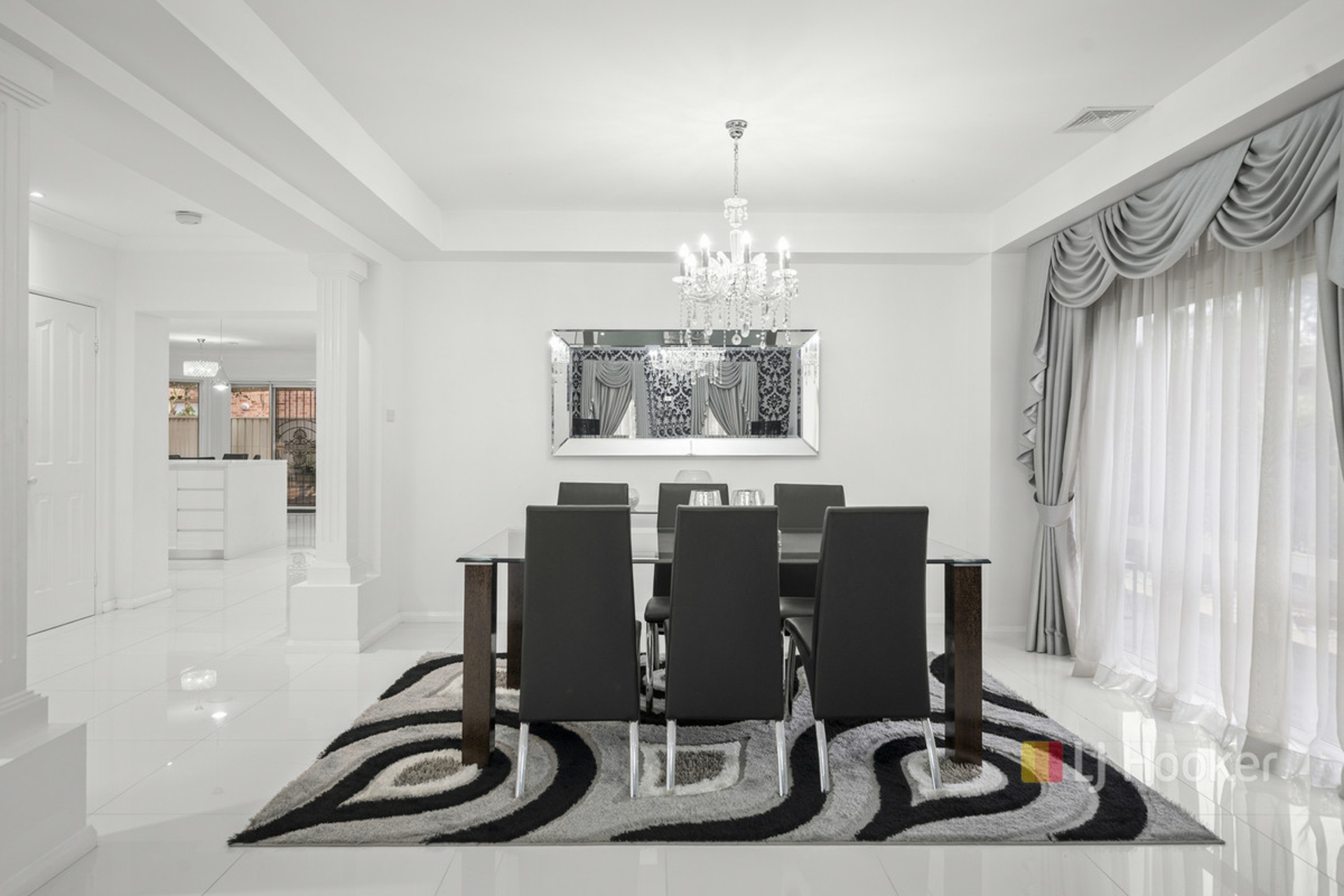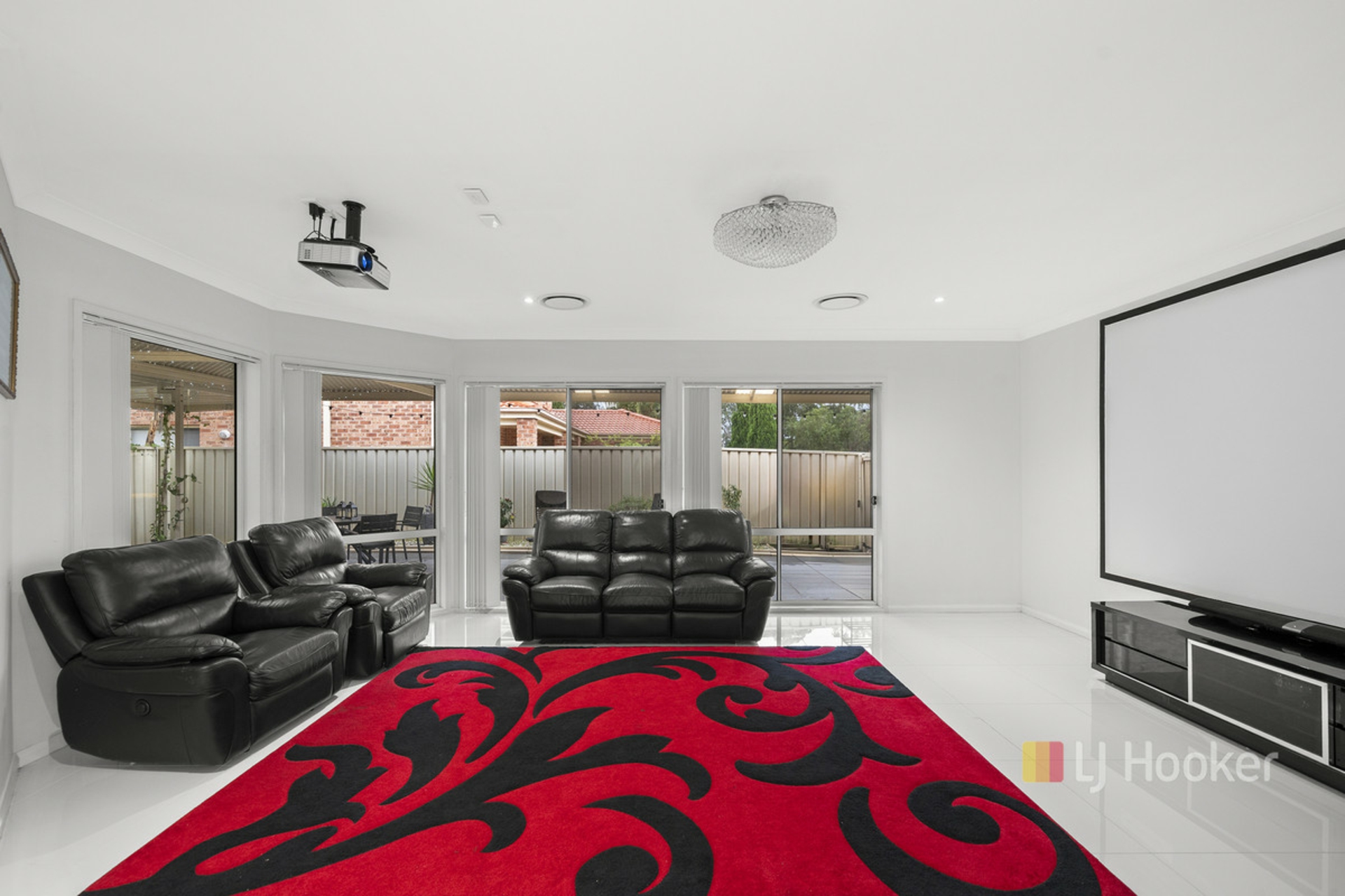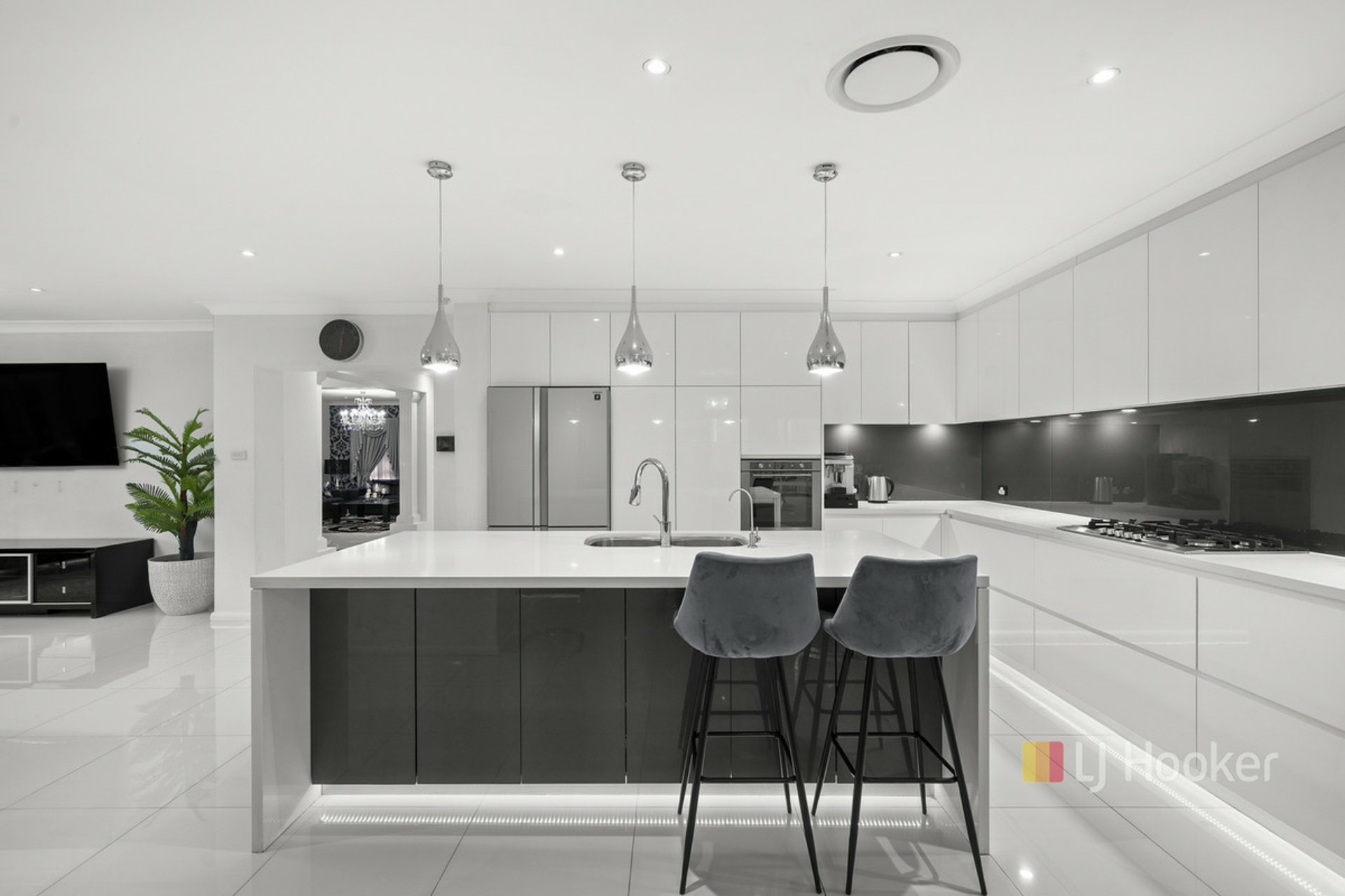 Flowing seamlessly from the kitchen are multiple living zones, including a dedicated theatre room, creating the ultimate space for movie nights, relaxation, or entertaining guests in style.