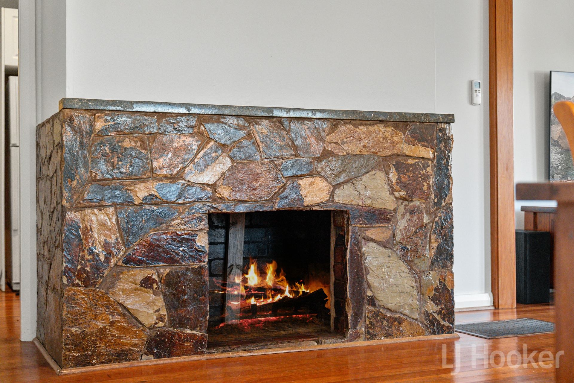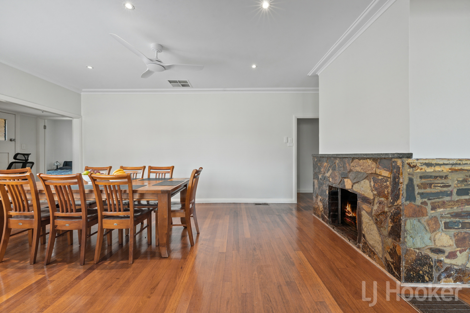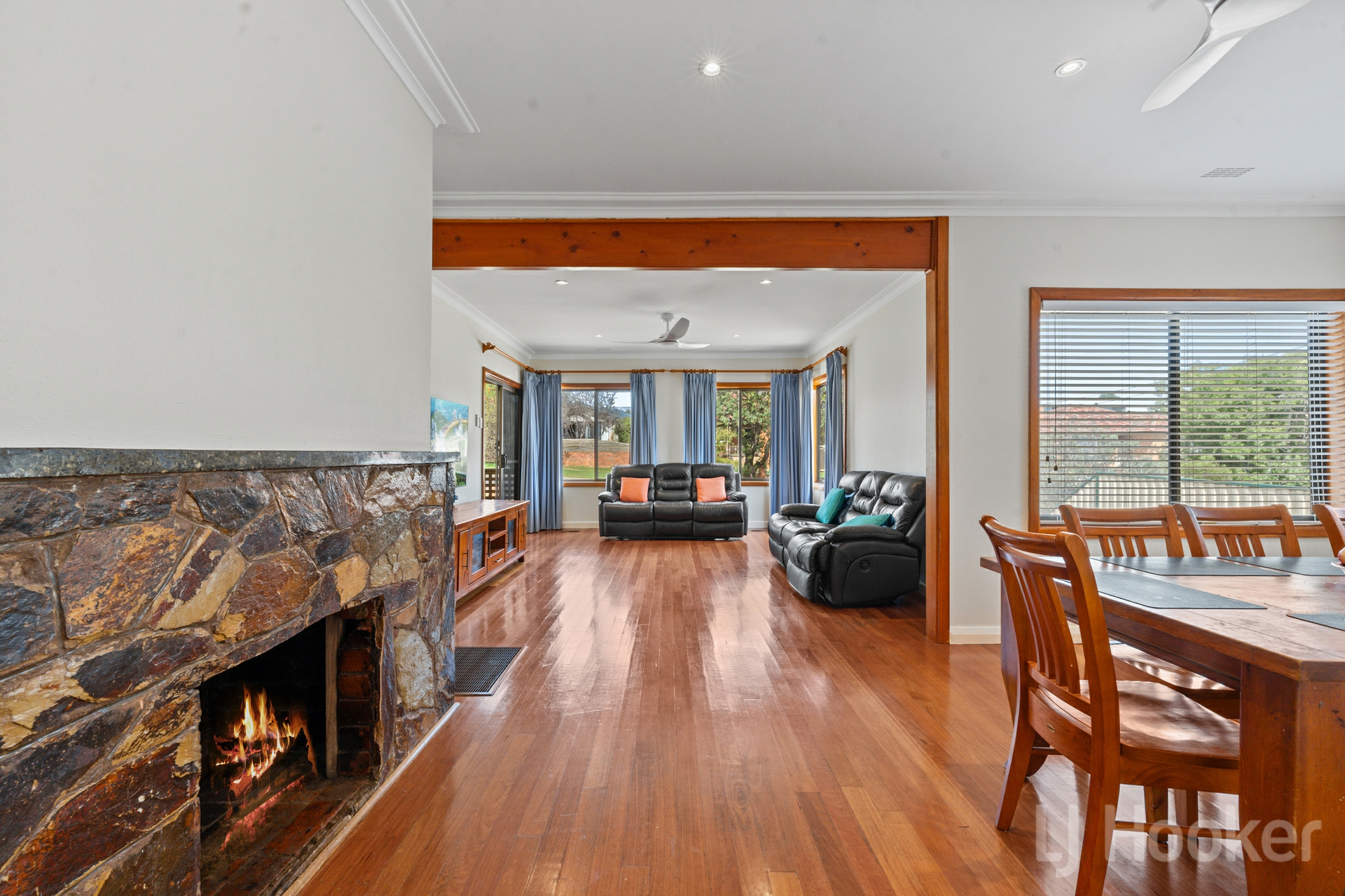 Inside, stunning natural timber floorboards flow throughout, complemented by generous living zones including a welcoming lounge and family dining area, complete with an original open fireplace.