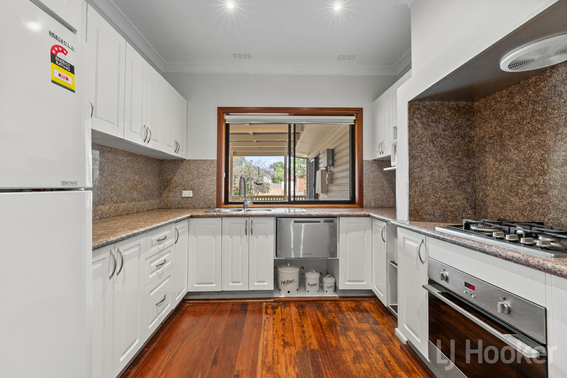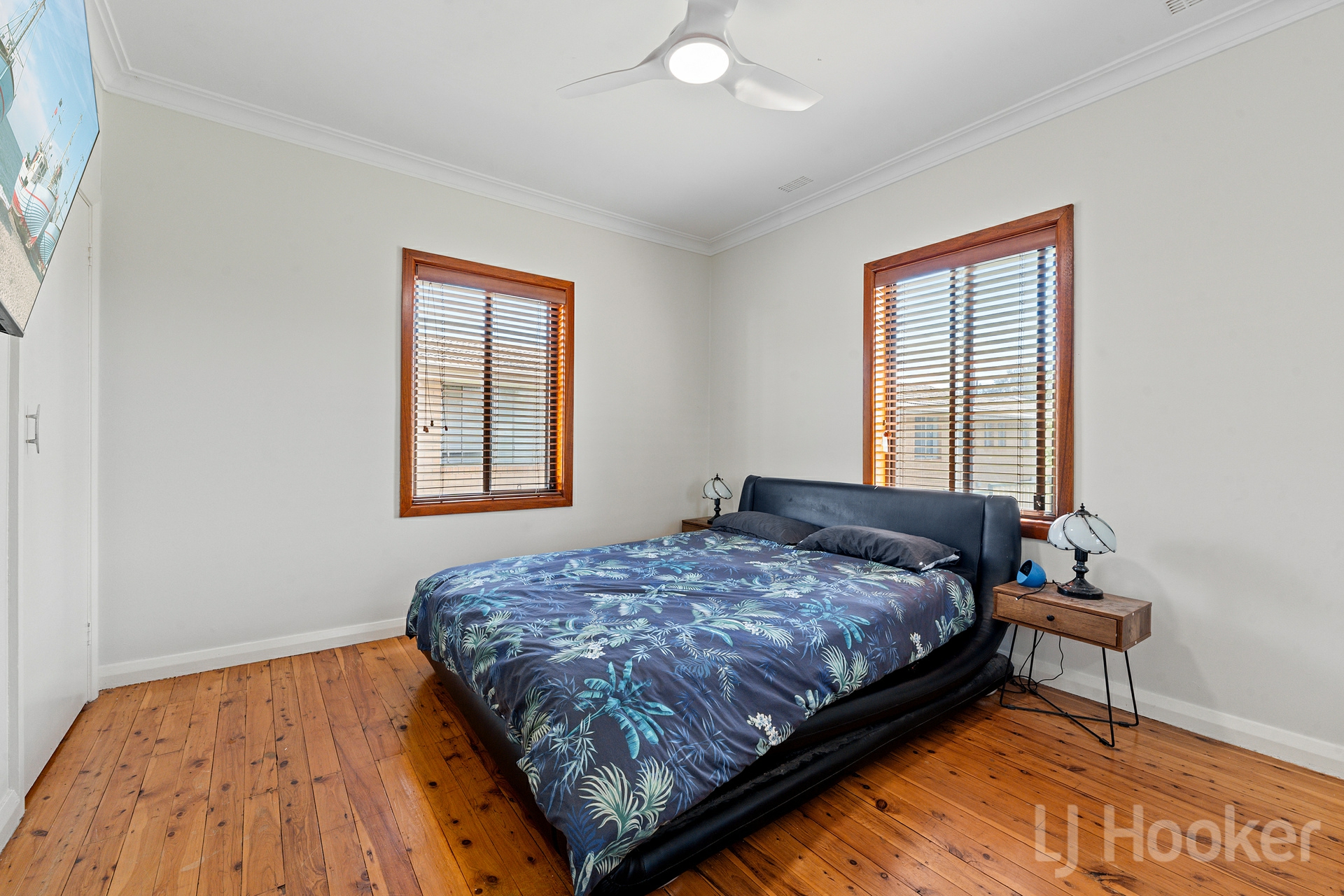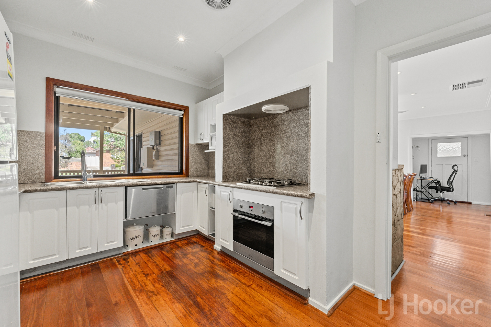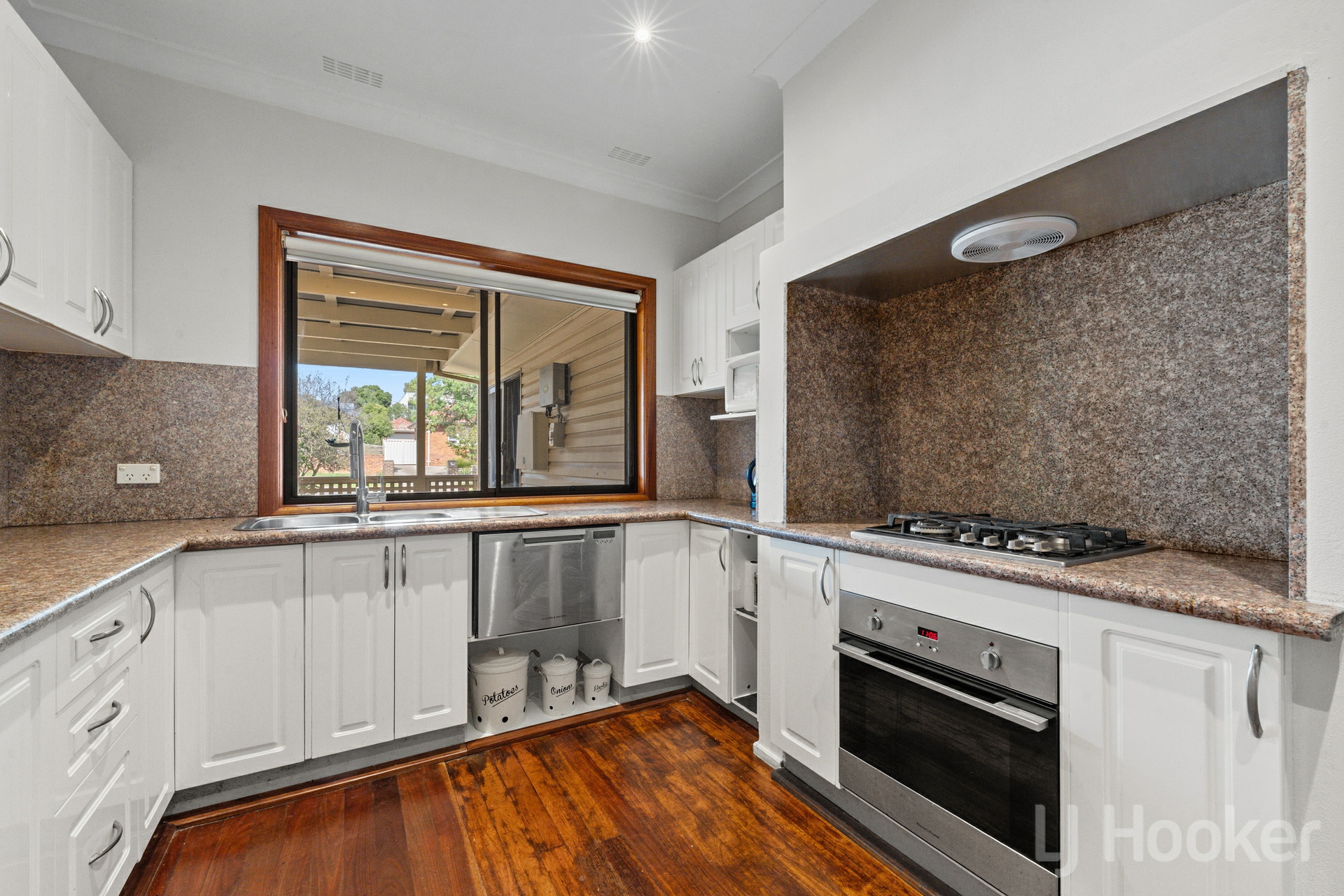 Inside, stunning natural timber floorboards flow throughout, complemented by generous living zones including a welcoming lounge and family dining area, complete with an original open fireplace.