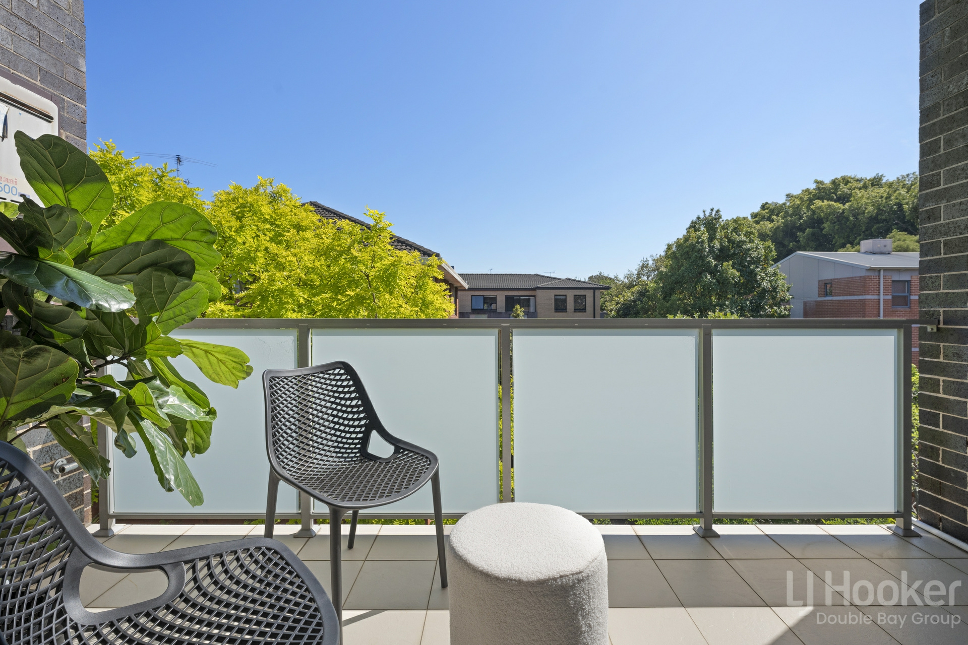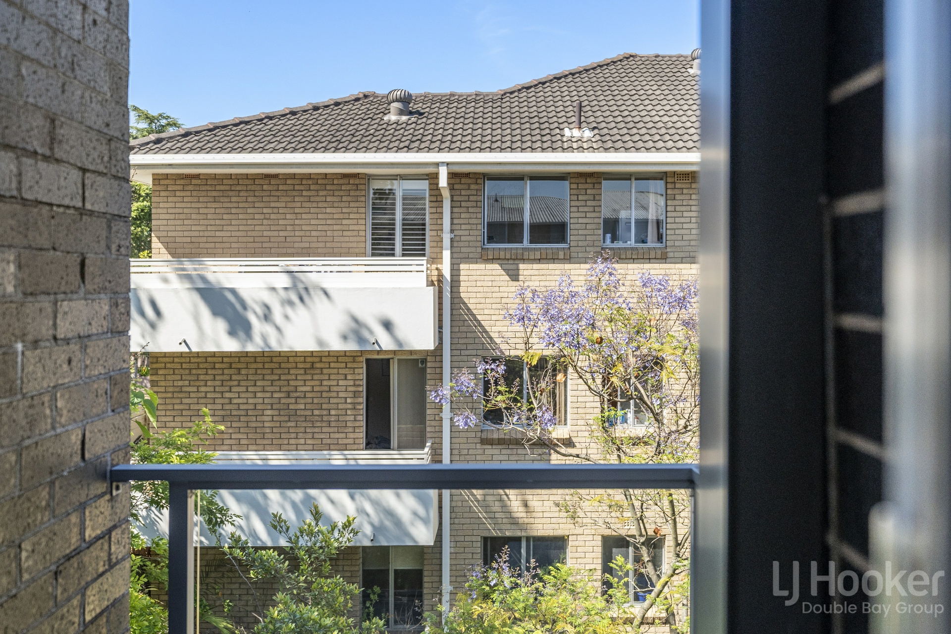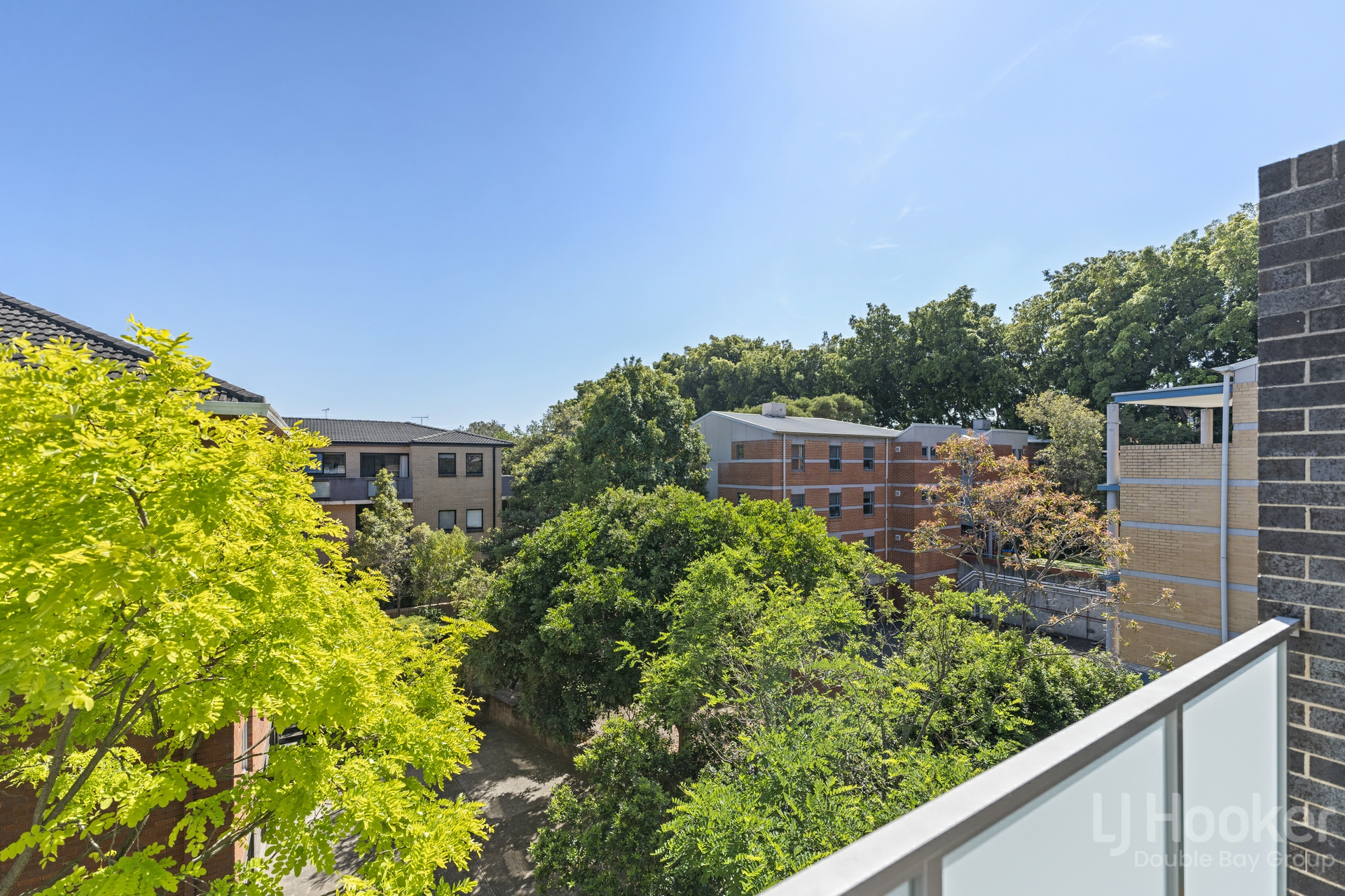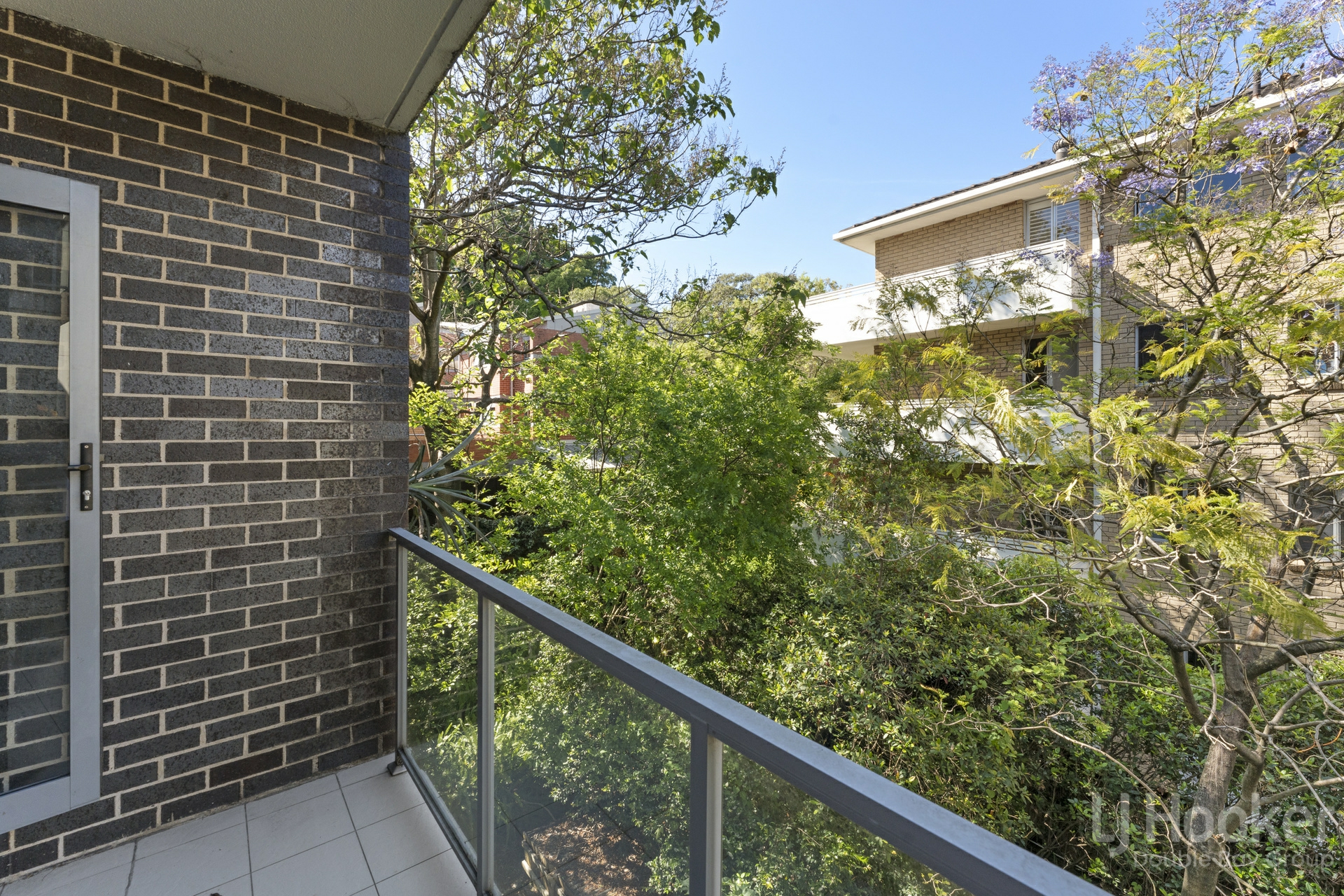 - Sunny north facing balcony enjoys a leafy tree top backdrop