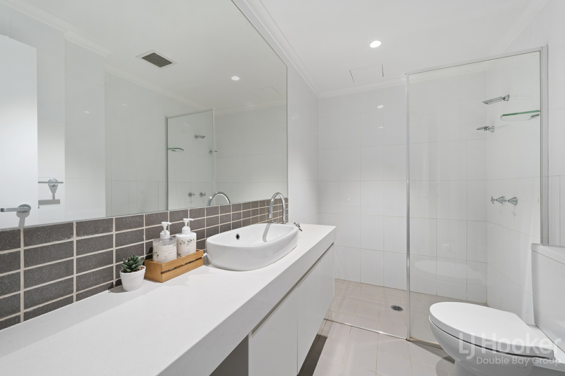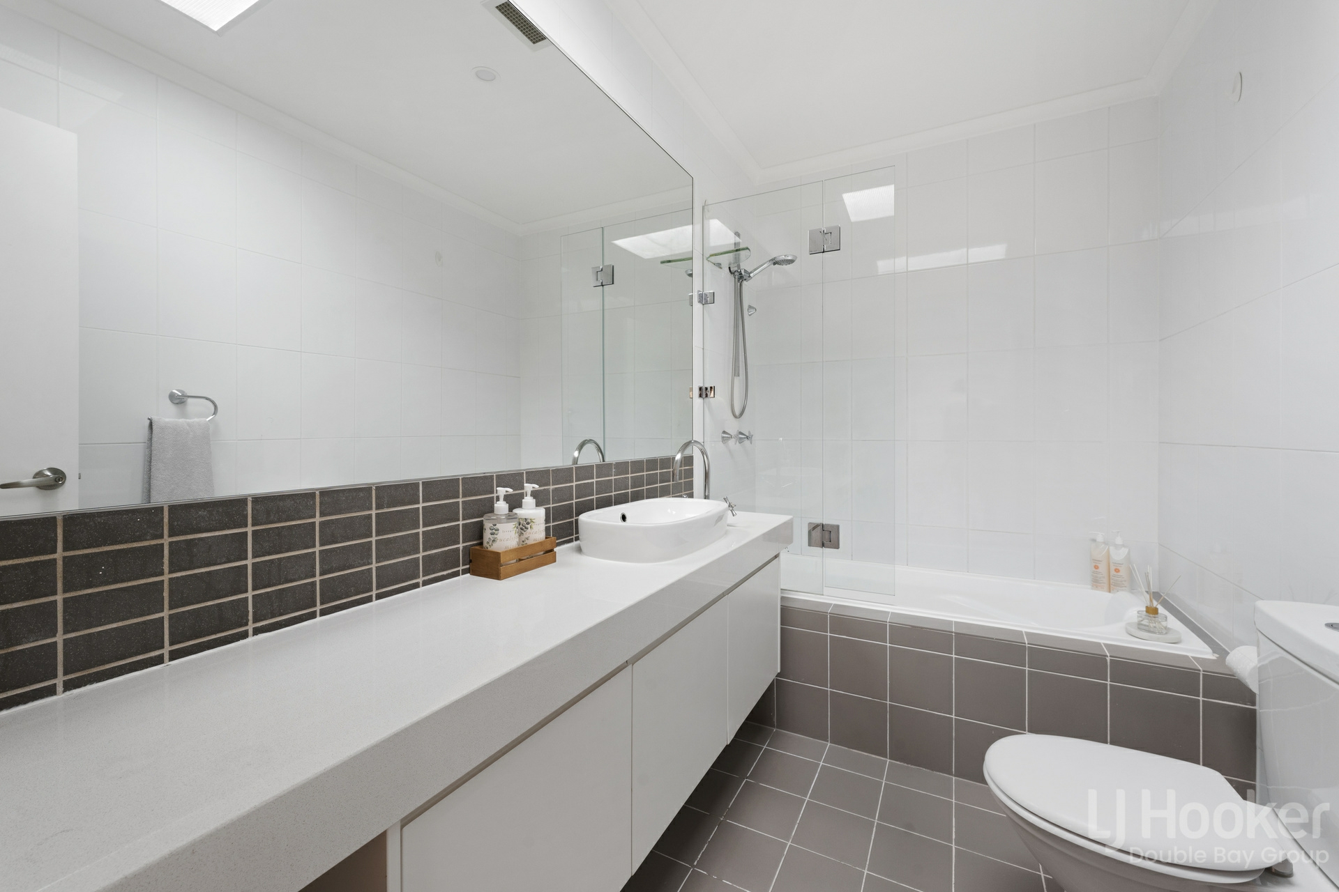 - Main bathroom designed with sleek floor-to-ceiling tiles