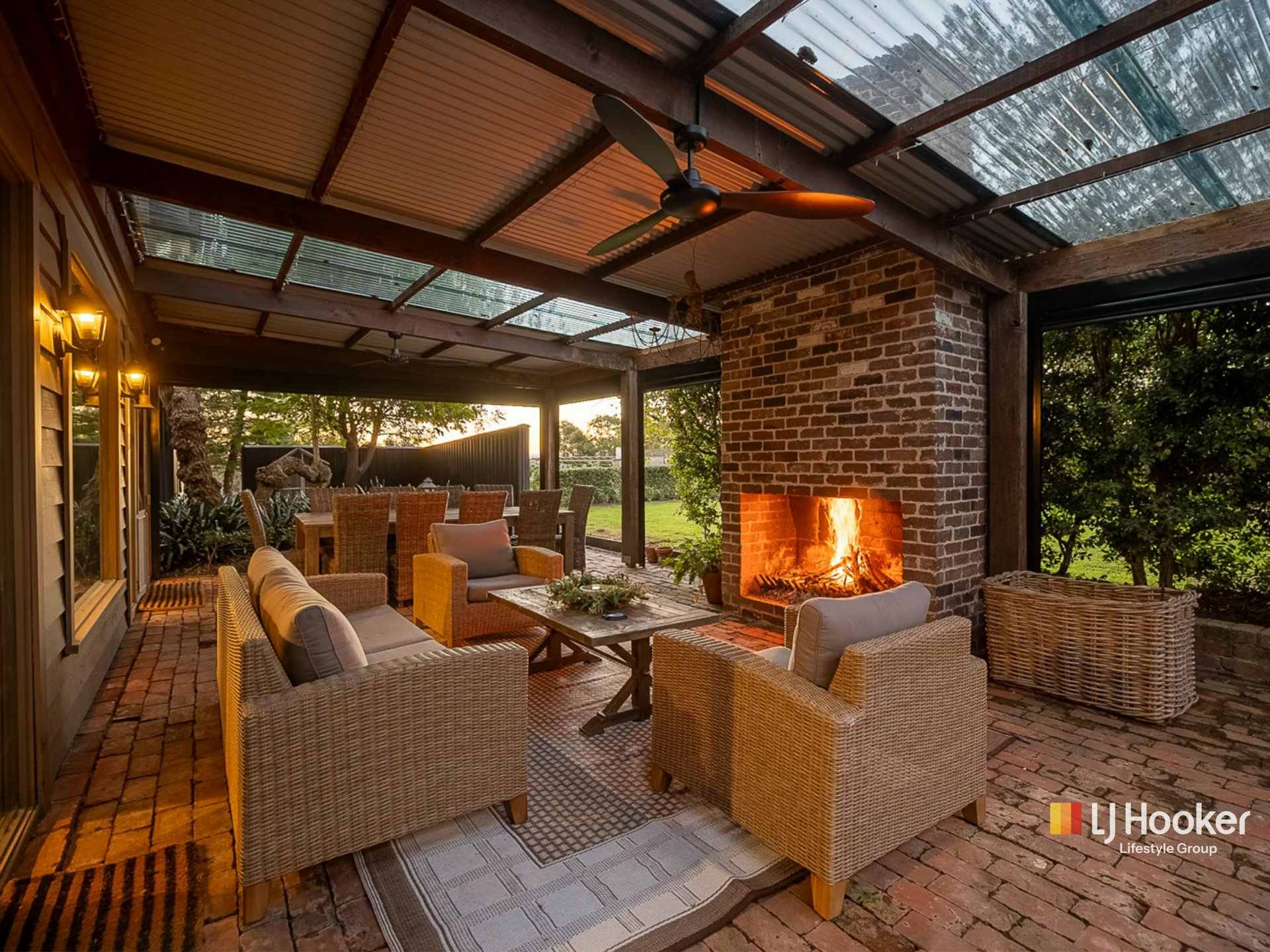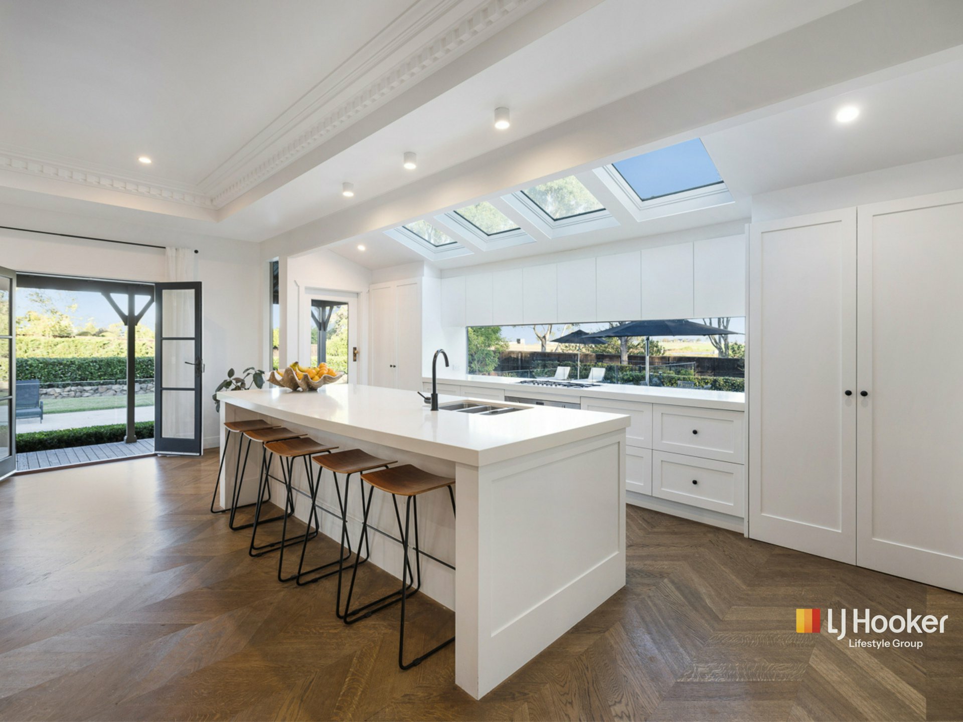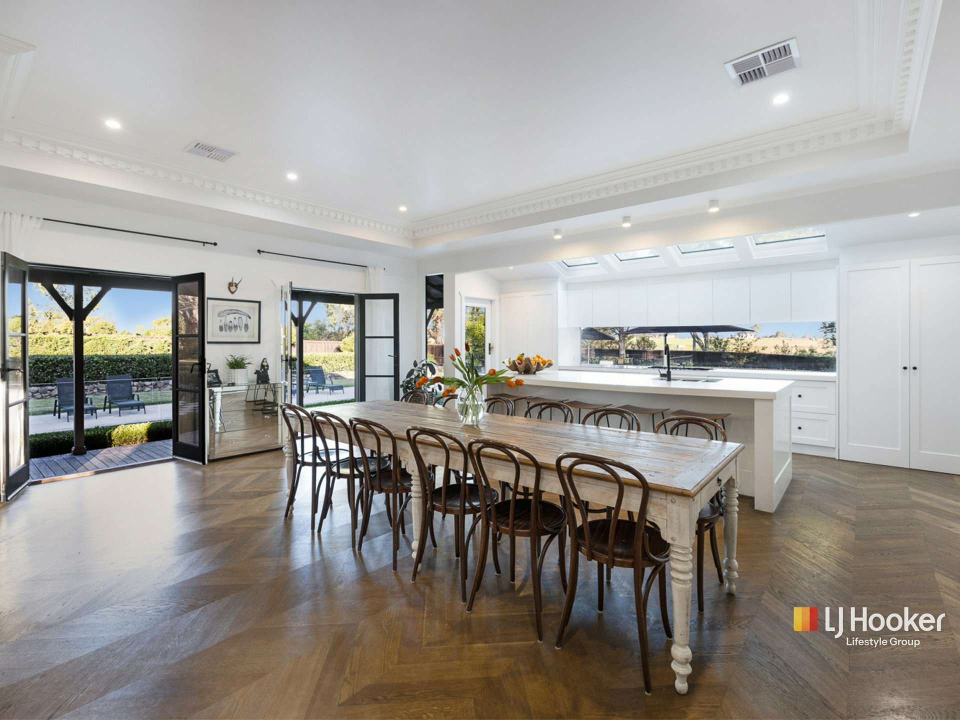 Set on five acres of lush, landscaped grounds, the main residence exudes warmth and character from the moment you arrive. Original timber floors flow throughout, adding a timeless touch to the home's multiple living and entertaining areas. At its heart lies a stunning Hampton style kitchen, complete with stone benchtops, a large island bench, and a seamlessly connected open plan living and dining area resting on striking herringbone floors. Oversized doors open wide to reveal manicured gardens and a sparkling mineral heated pool, creating a sense of indoor outdoor flow that's perfect for both relaxed family living and elegant entertaining.