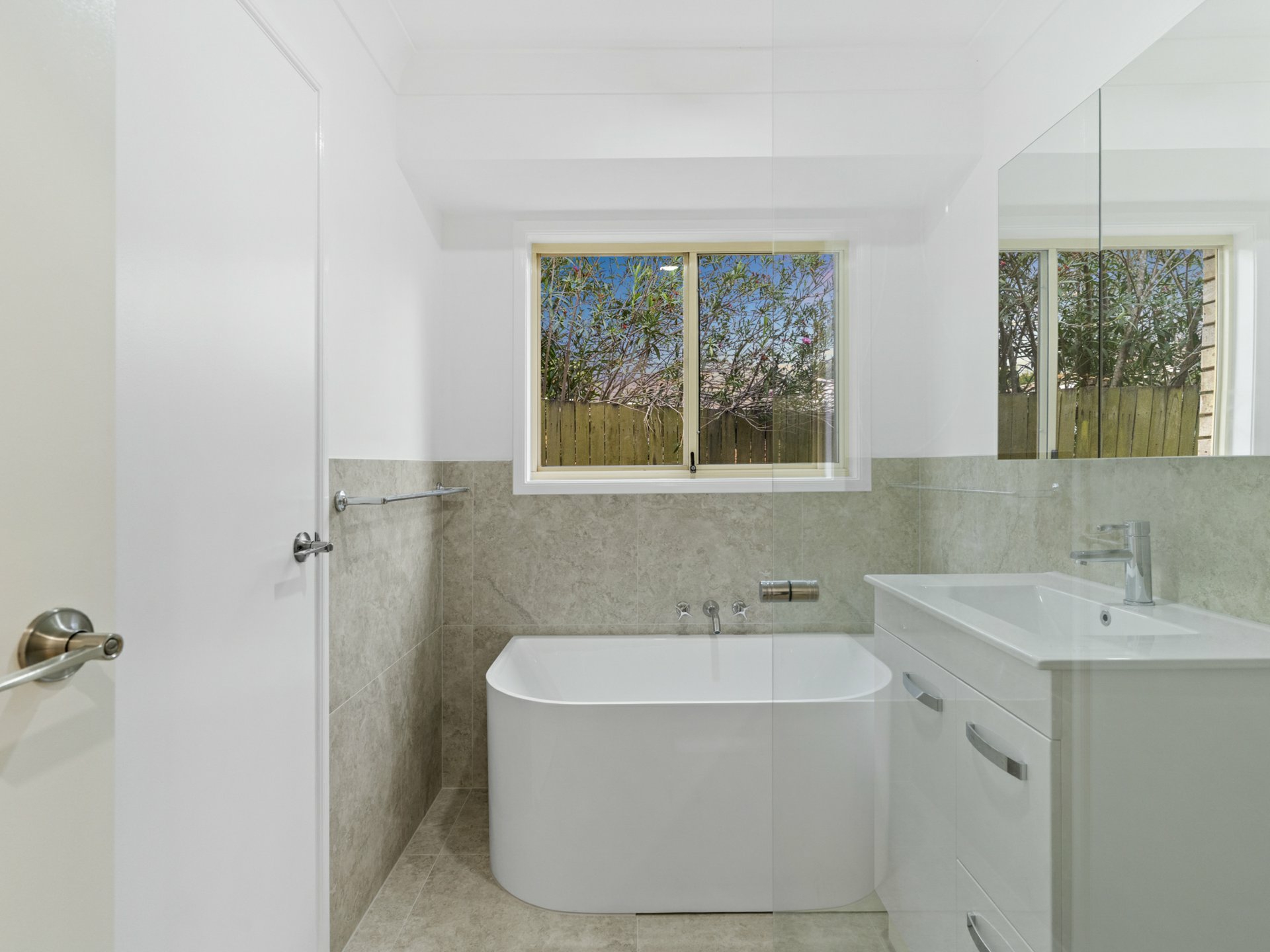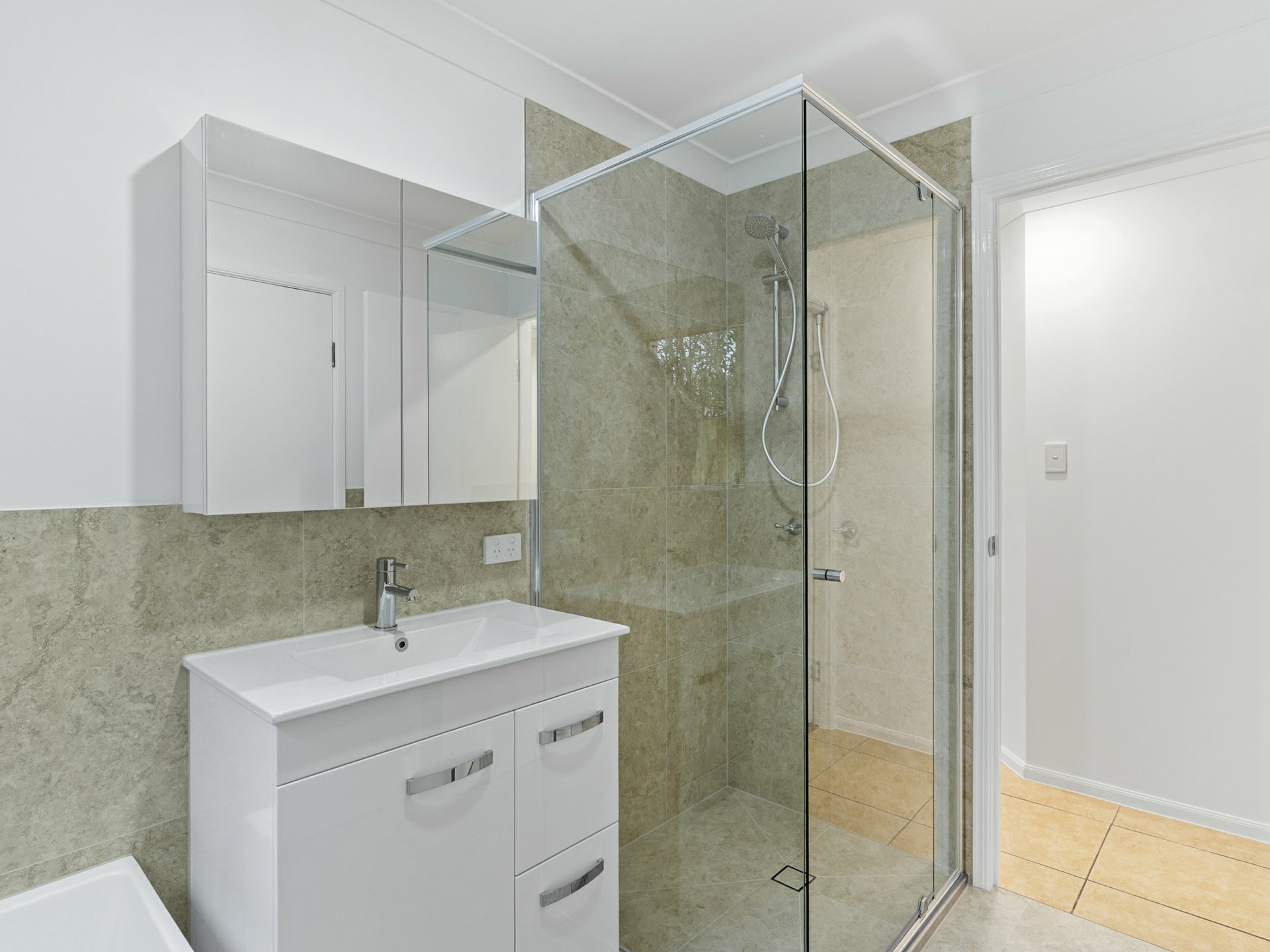 Now accessible directly from the air-conditioned master suite, as well as a passageway close to the other 2 beds, the bathroom now sports tasteful, large-format tiles extending up its walls, with mirrored storage over a self-contained vanity unit, a glass-enclosed shower and elegantly curved tub! Conveniently, the toilet is on its own, just next door.