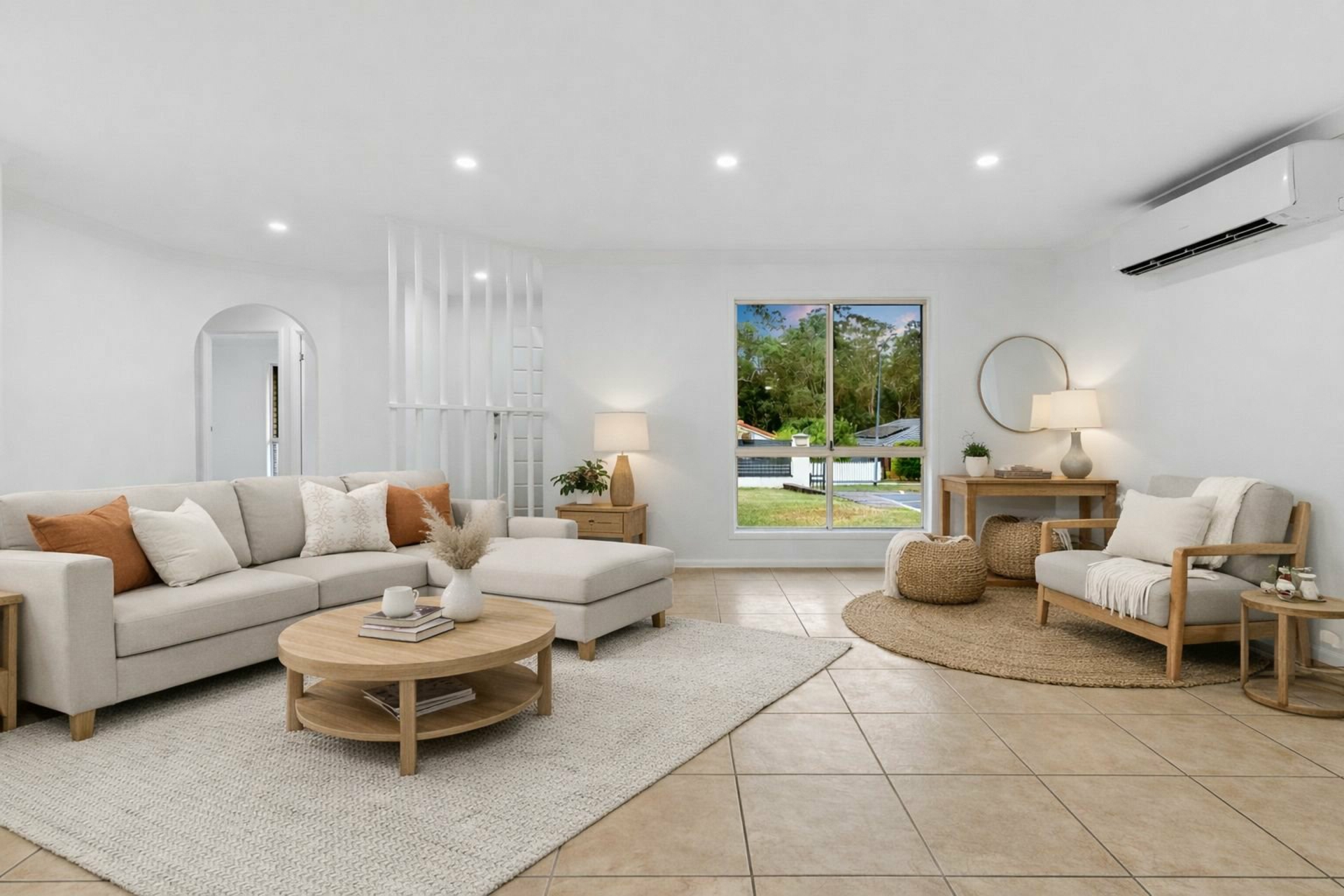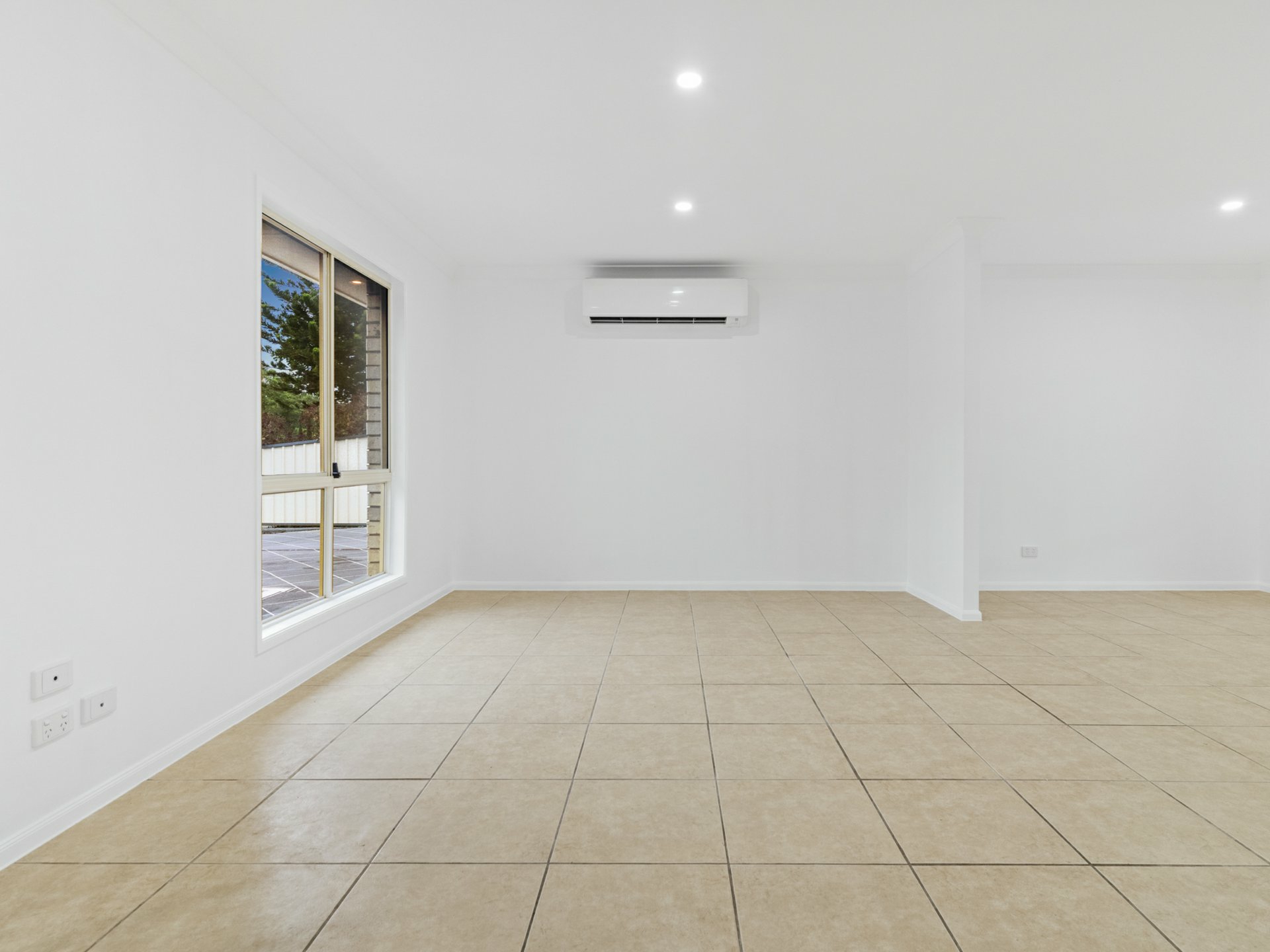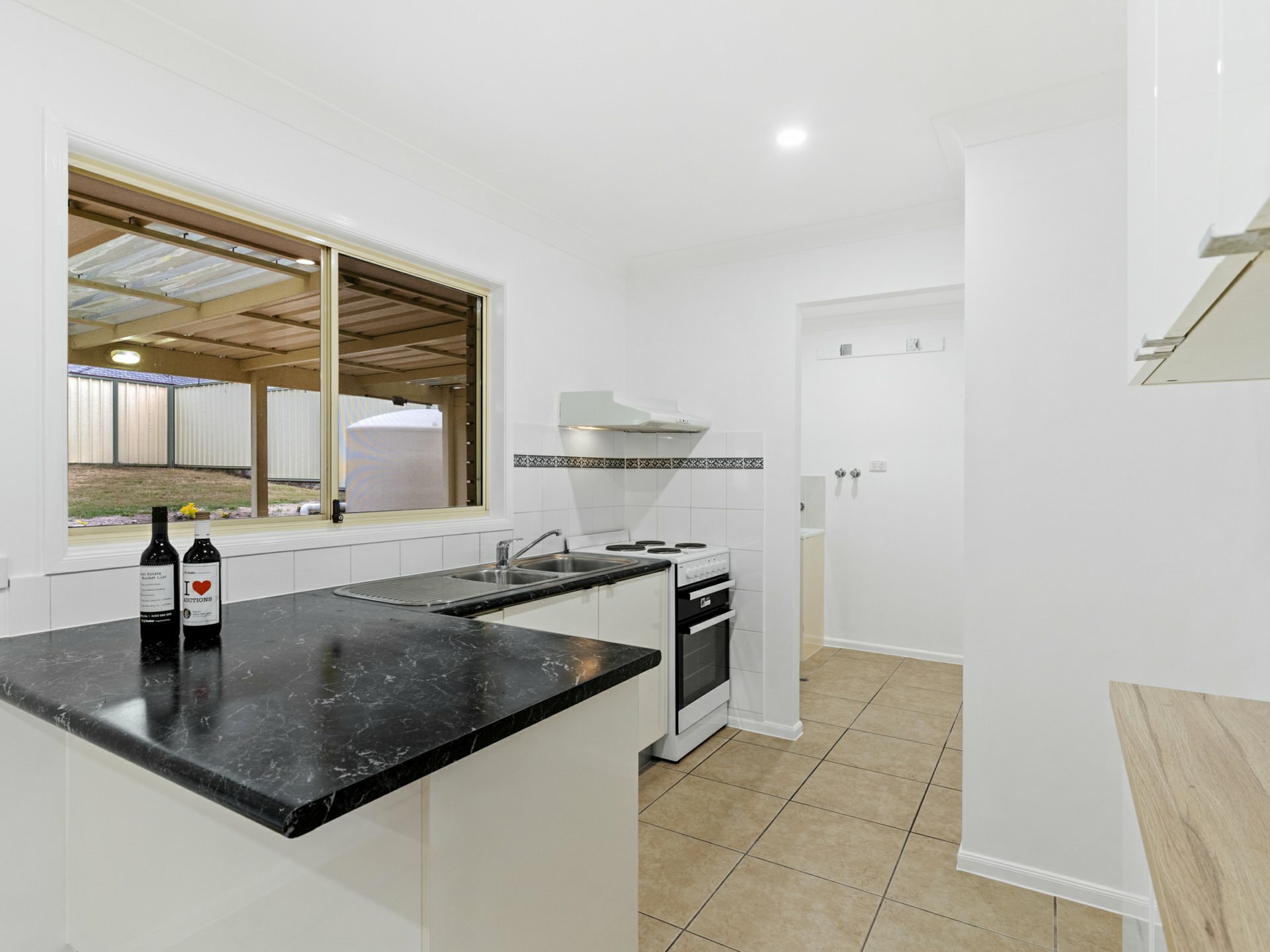 A split system AC keeps the combined lounge and dining room cool or cosy as the seasons dictate, and a screened slider extends this tiled hub onto a large, covered entertaining area with a stepped path to the backyard. In the kitchen, there's ample bench space and storage, a cooker/oven combo, twin sink, and access into the laundry