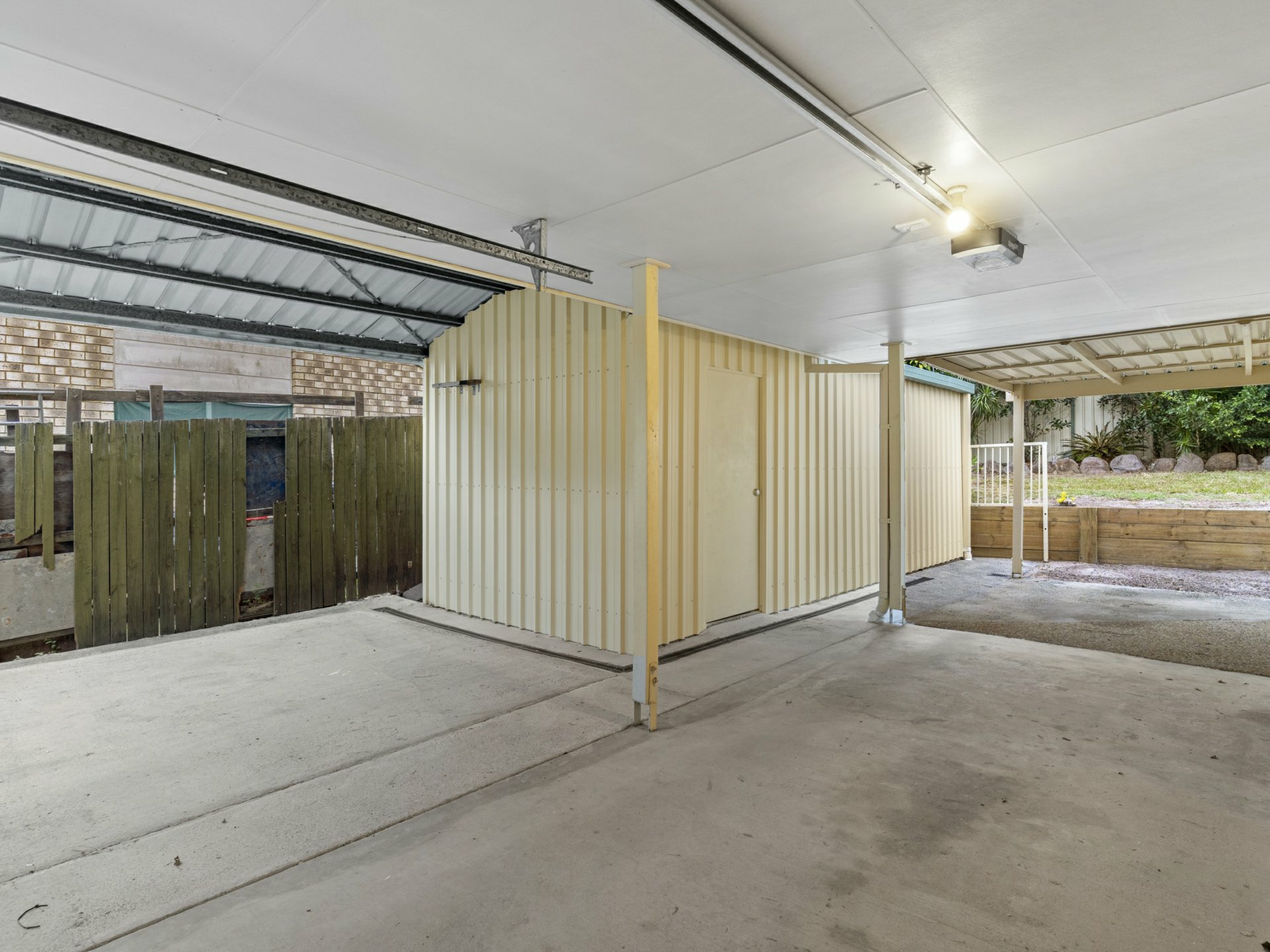 - Tandem-style double carport next to a big shed/workshop, more off-street parks on drive