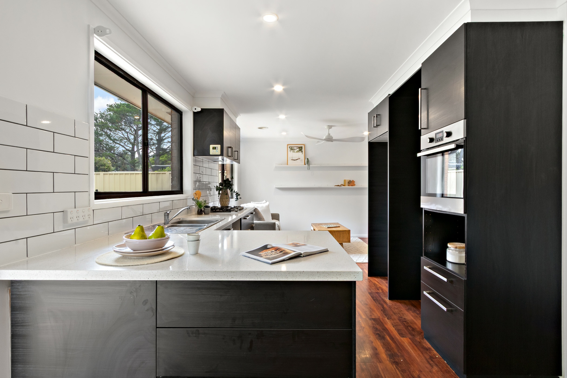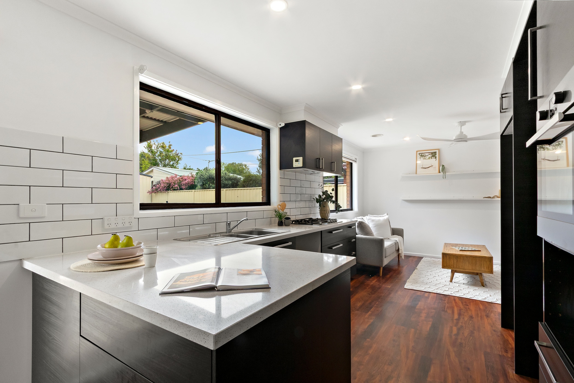 At its heart, the designer kitchen is both striking and functional, featuring a stone island benchtop, walk-in pantry, quality appliances and gas cooking-perfectly suited to both relaxed family living and effortless entertaining. Flowing living spaces are enhanced by natural light, clean lines, and a calming neutral palette, with year-round comfort assured via ducted gas heating, split system air conditioning and ceiling fans.