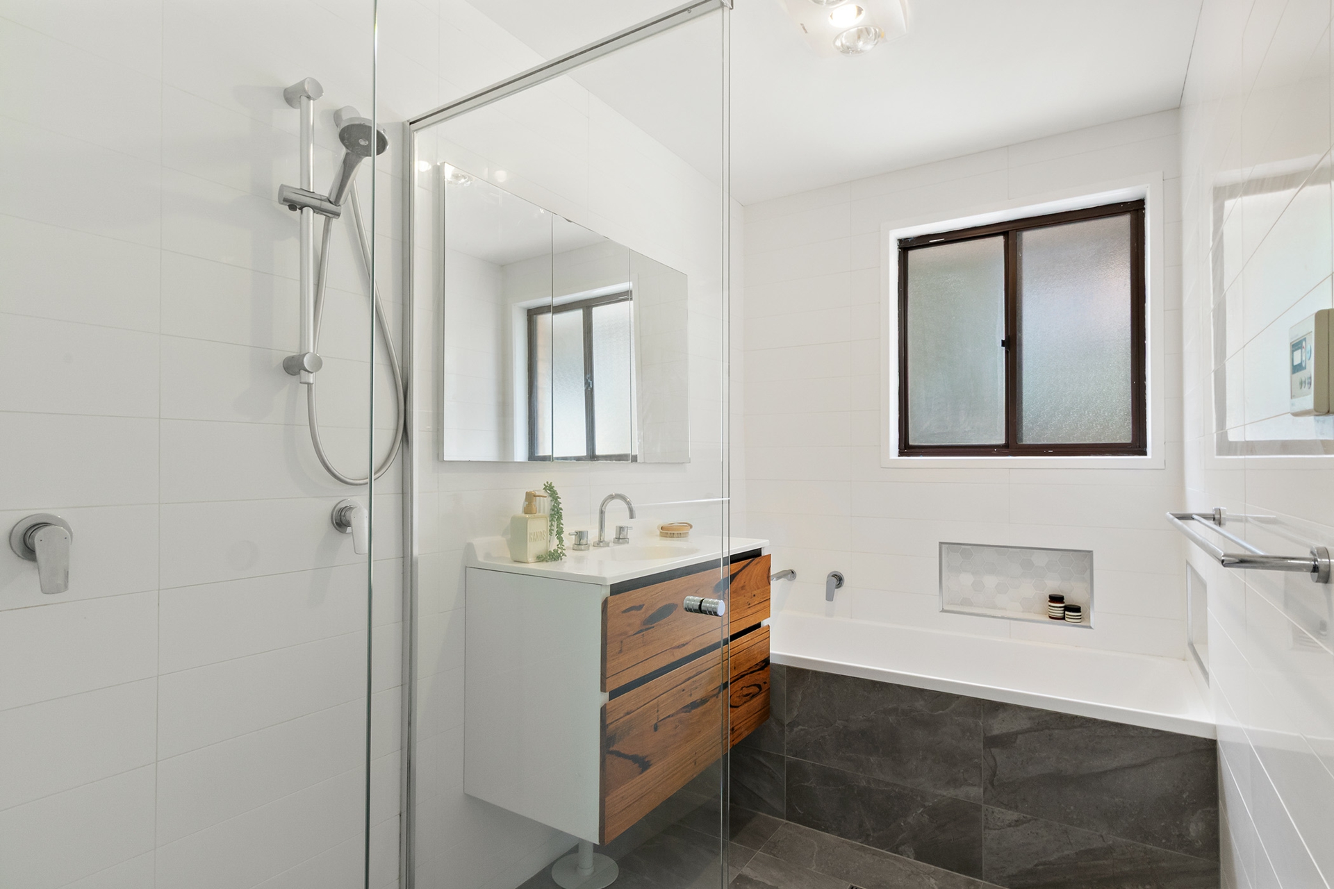 •Elegant bathroom with floating vanity and full-sized large bathtub