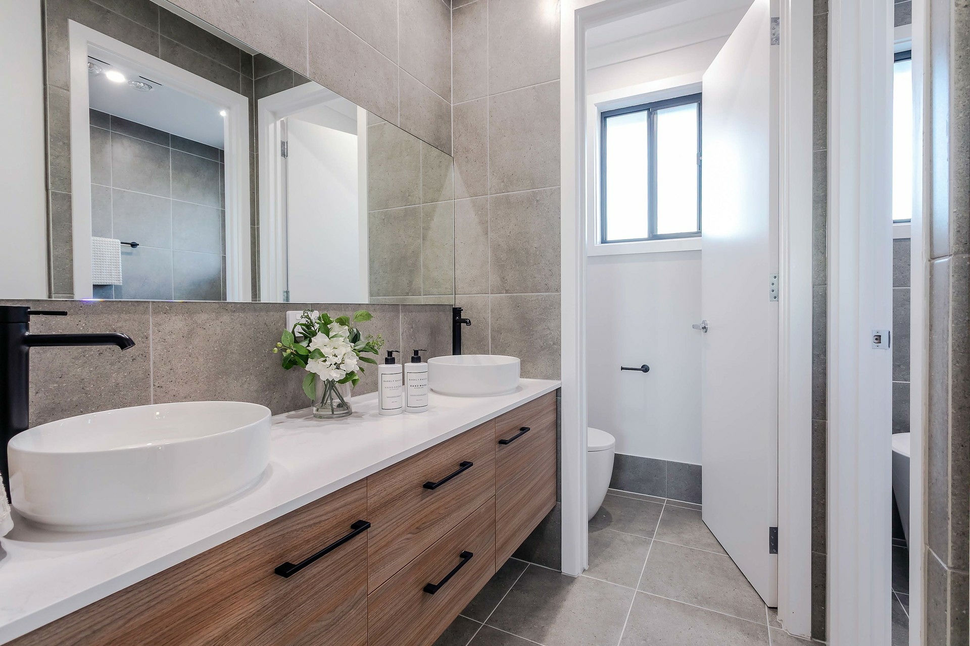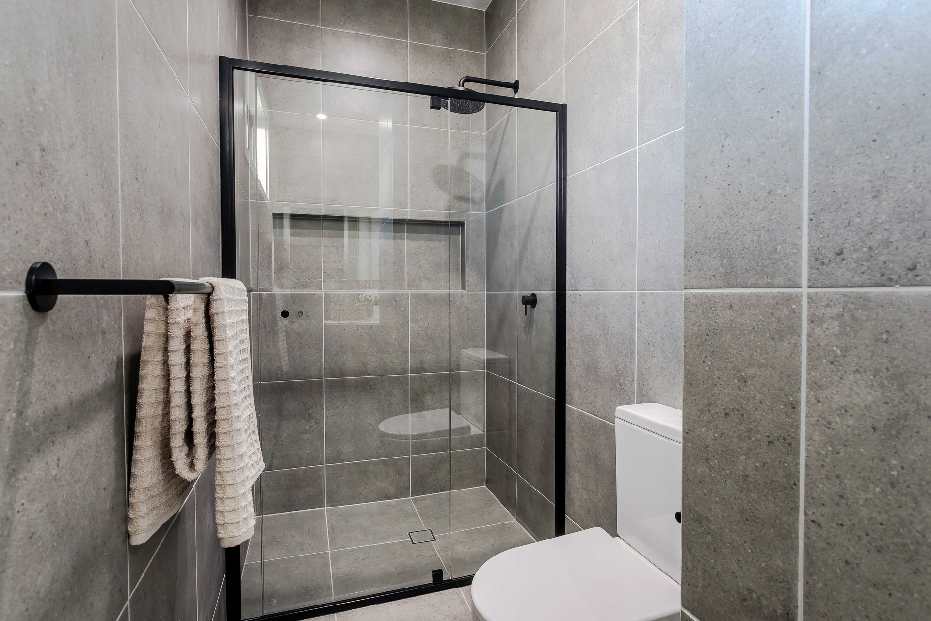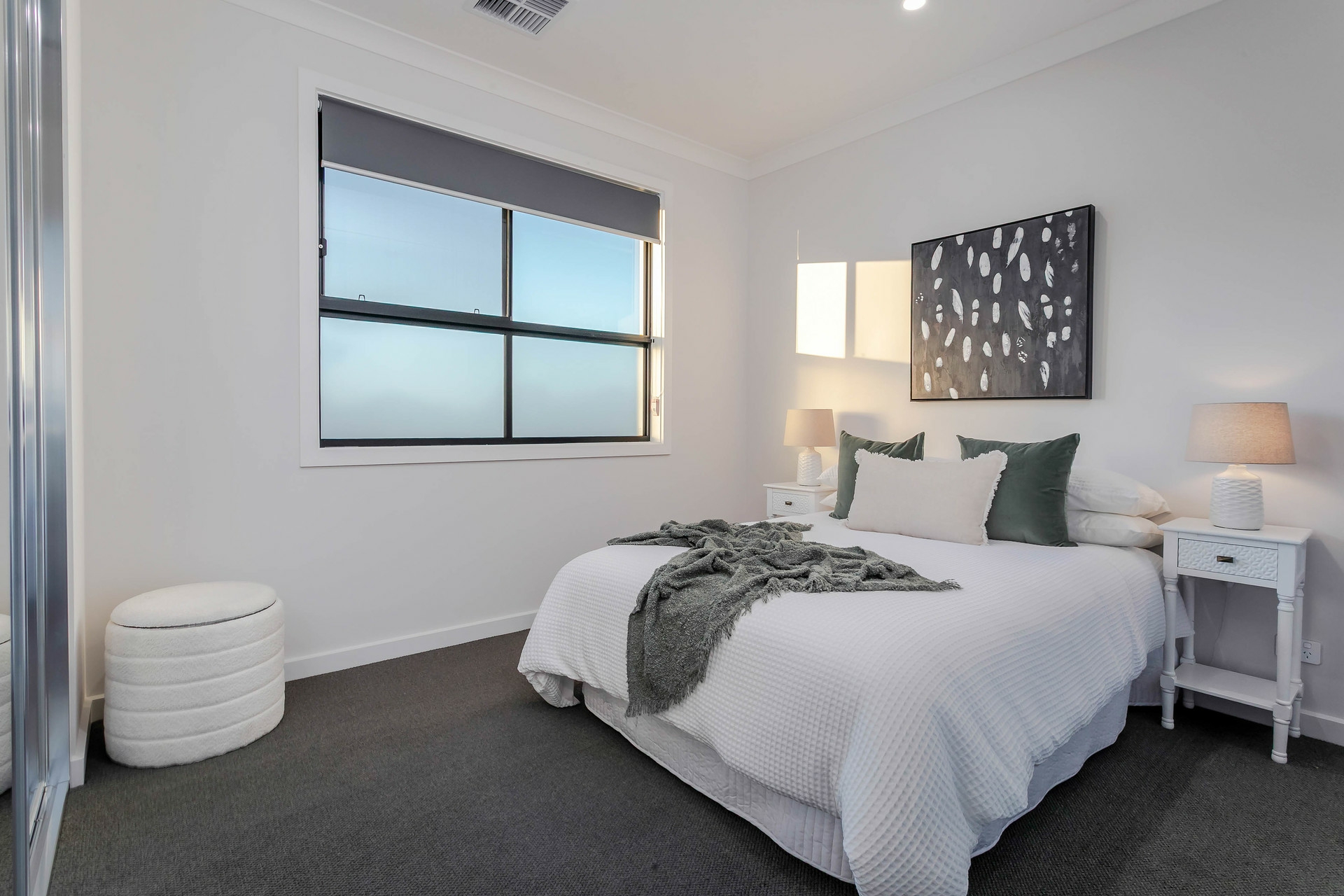 Also on the ground floor is the spacious master bedroom, complete with a walk-in wardrobe and a luxurious ensuite showcasing floor-to-ceiling tiles, dual vanities and a stone benchtop. A guest-friendly powder room adds further practicality to the layout.