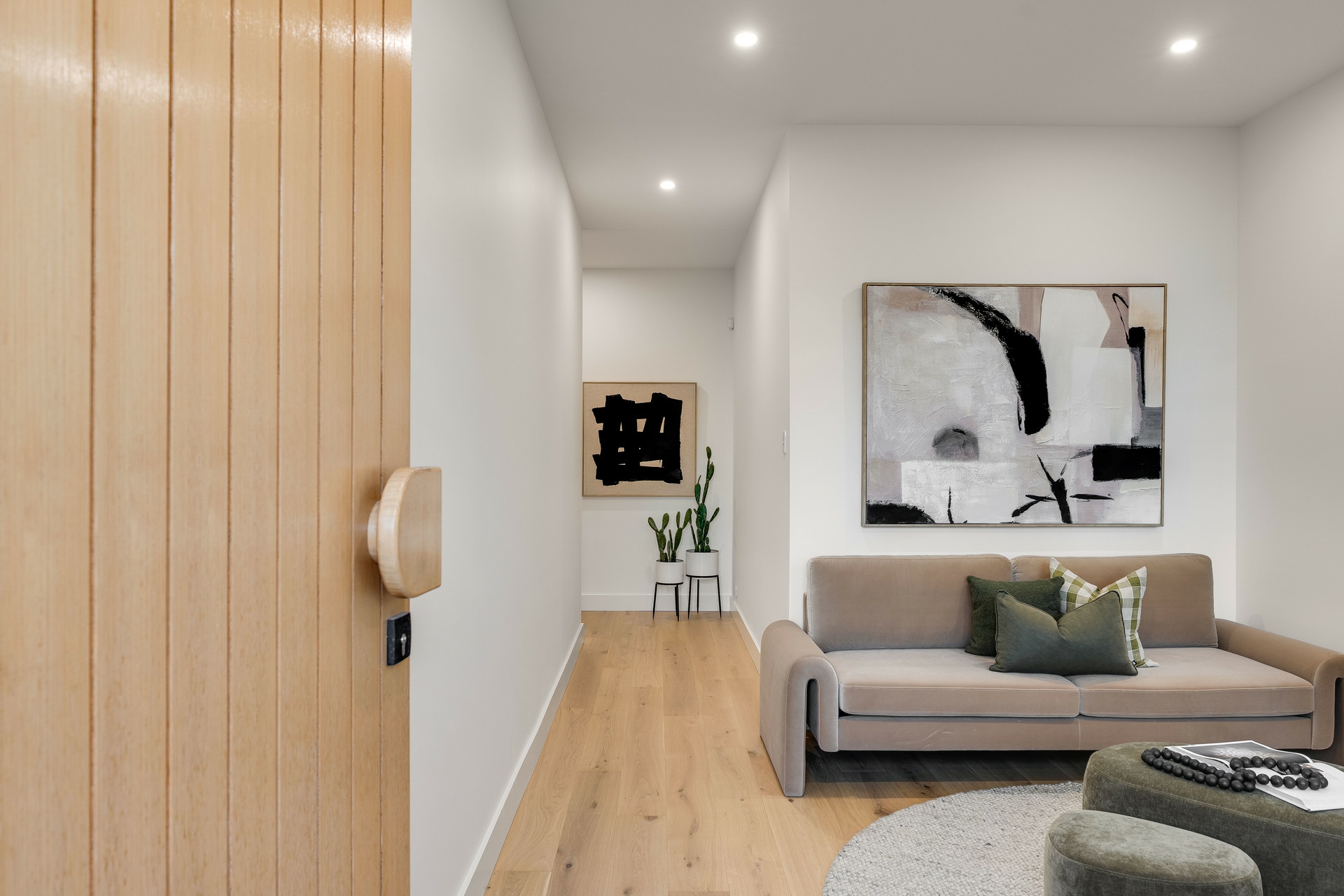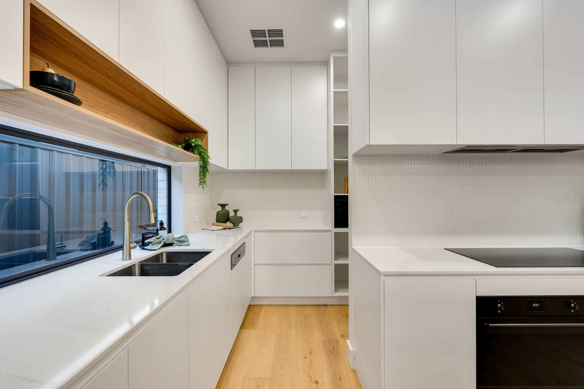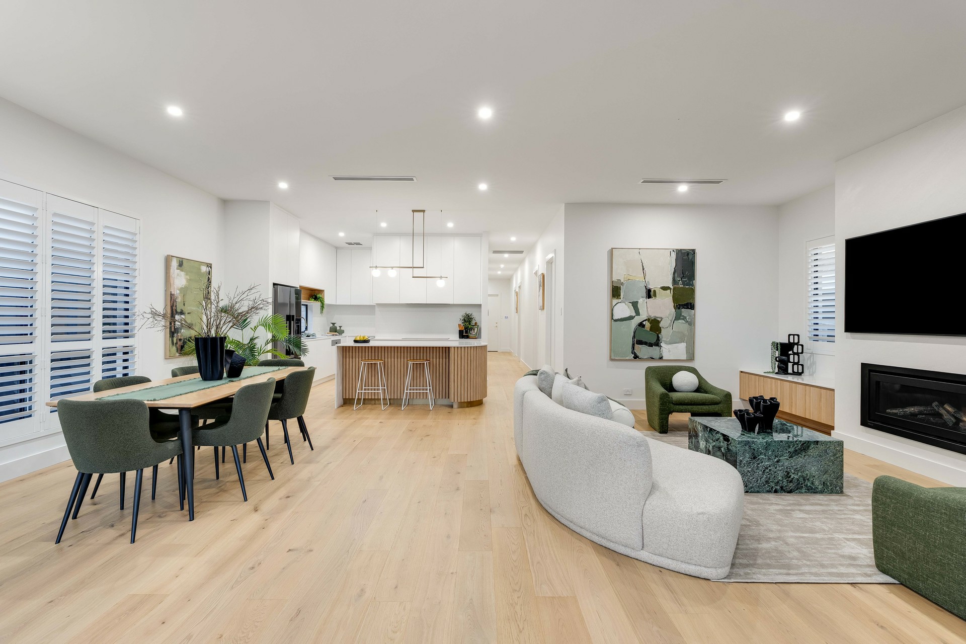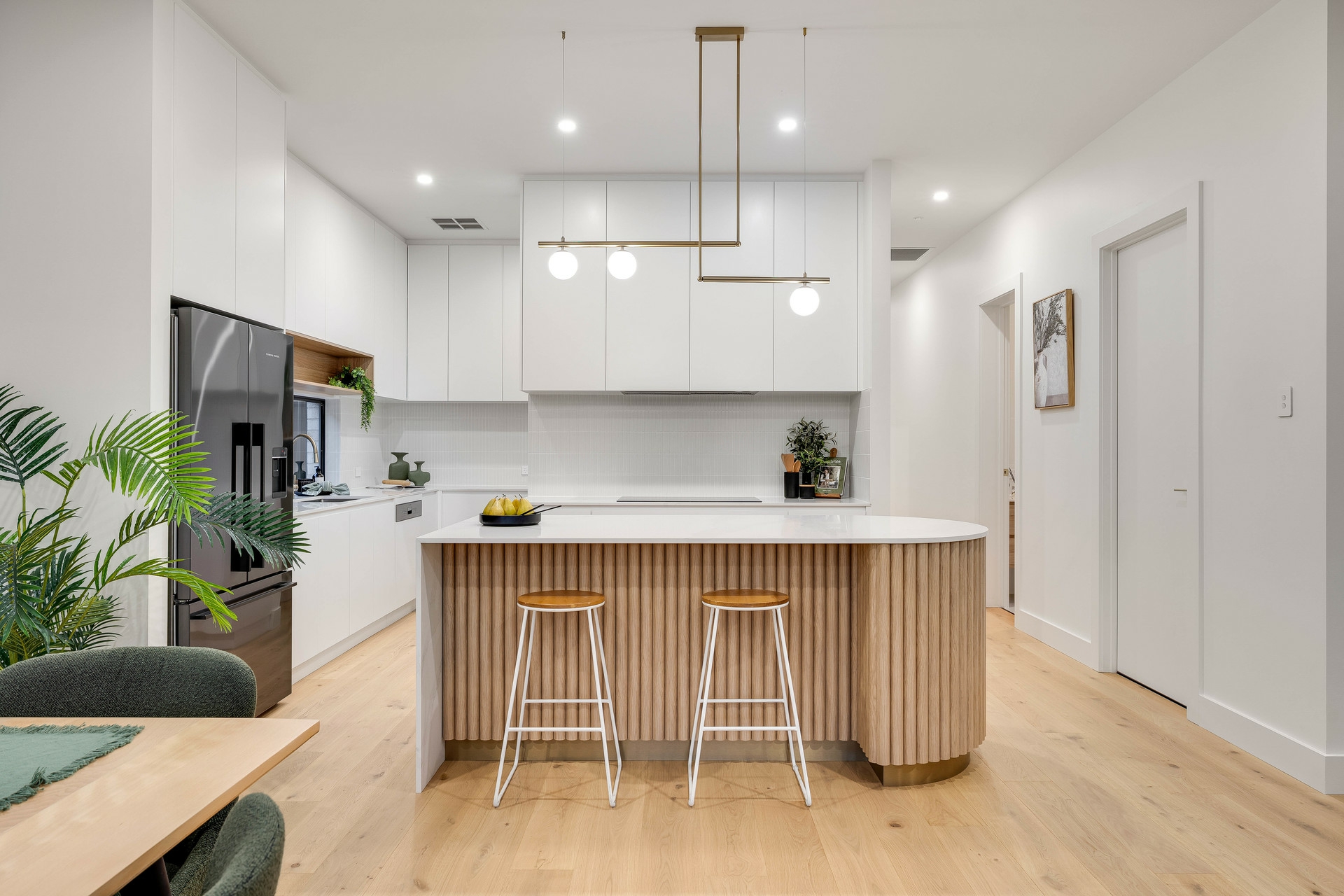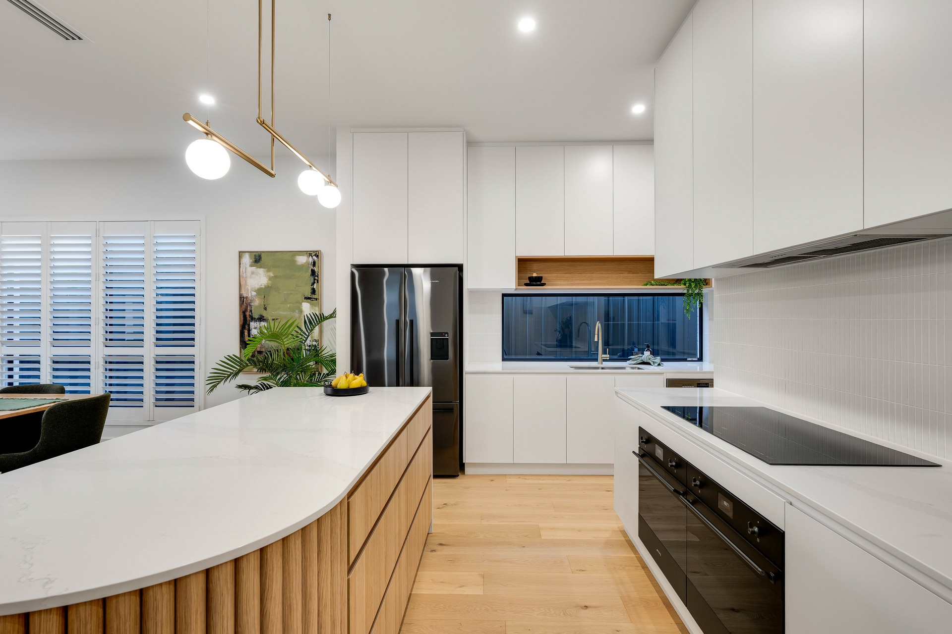 From the moment you step inside, soaring 3m ceilings and premium engineered timber flooring set the tone for refined modern living. At the heart of the home, a stunning designer kitchen showcases a glamorous curved stone island bench, complemented by a fully equipped butler's pantry, perfect for seamless entertaining.