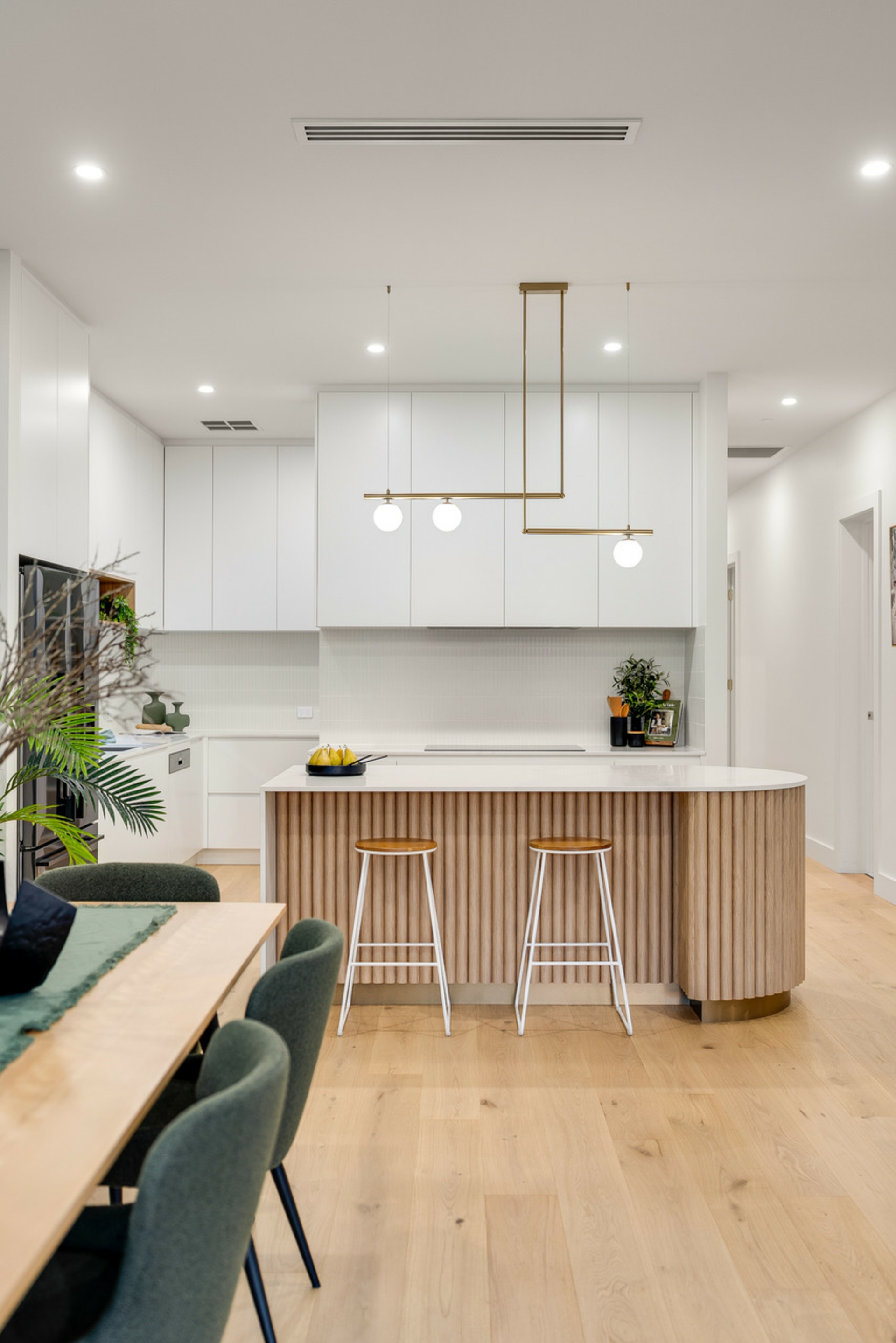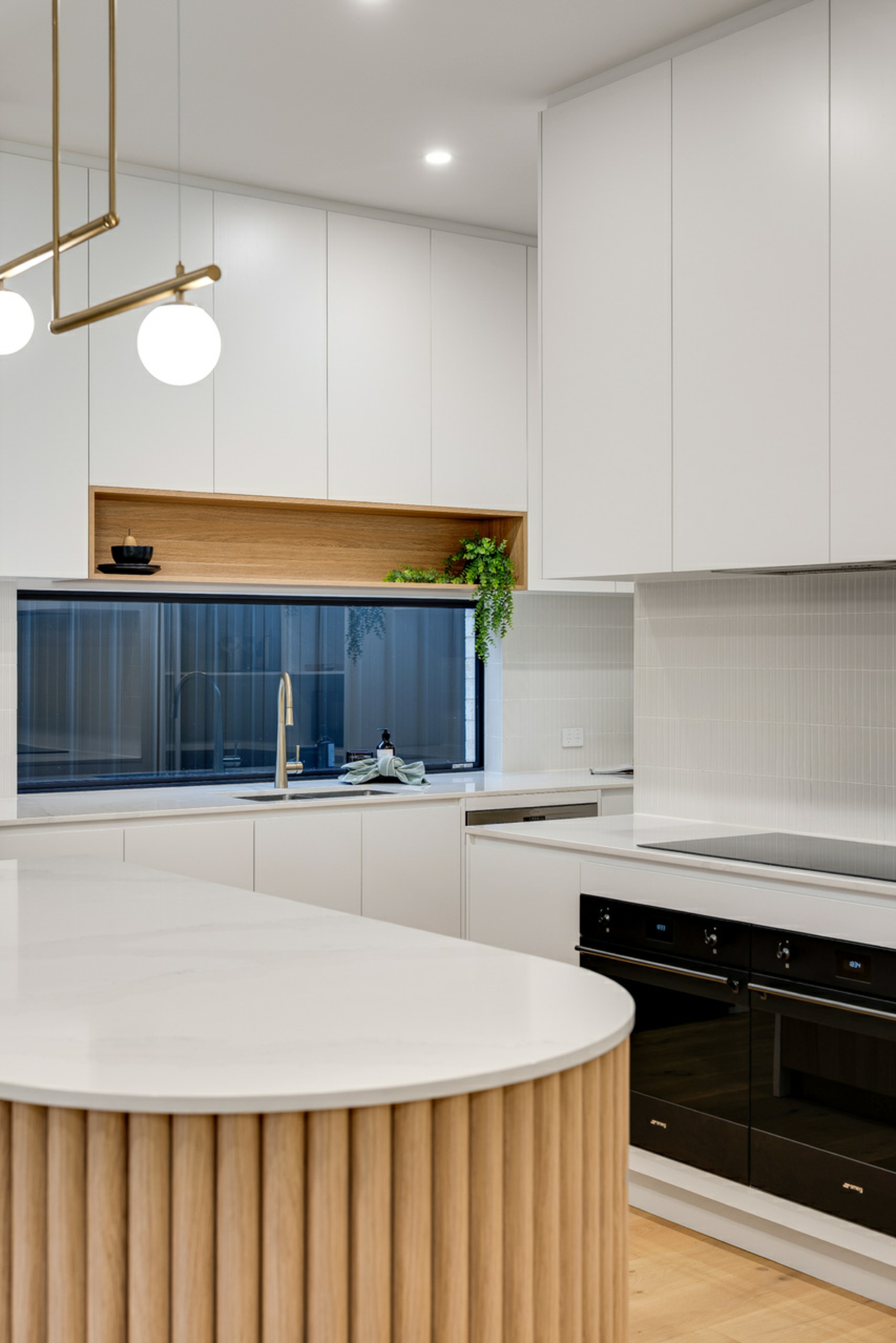 - Designer kitchen with curved stone island bench