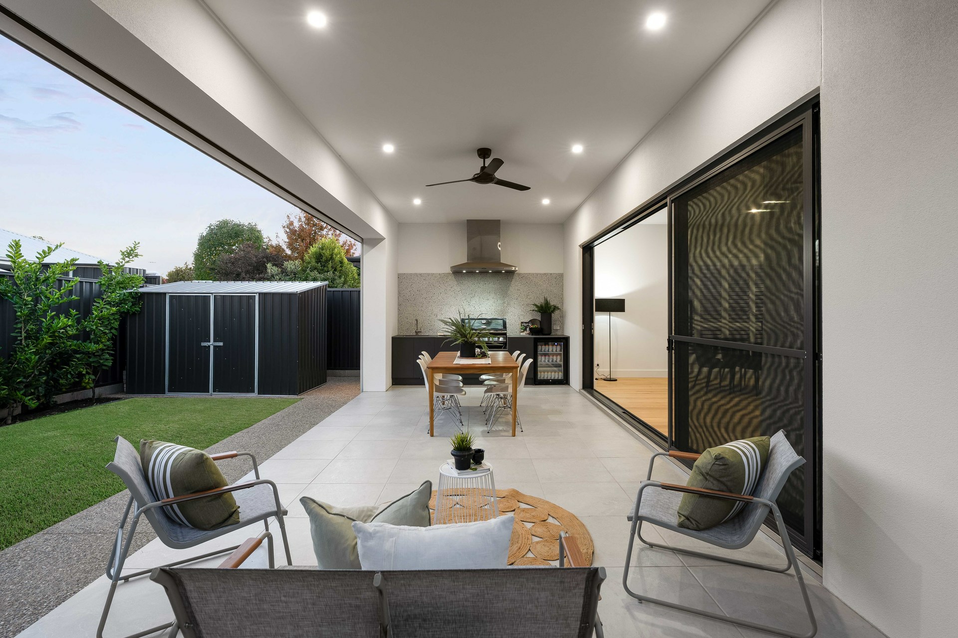 Outfitted with premium Smeg appliances, including double 600mm ovens, this space is as functional as it is beautiful. The adjoining living and dining area flows effortlessly to an alfresco entertaining zone, complete with a gas BBQ and wok burner, ideal for year-round gatherings.