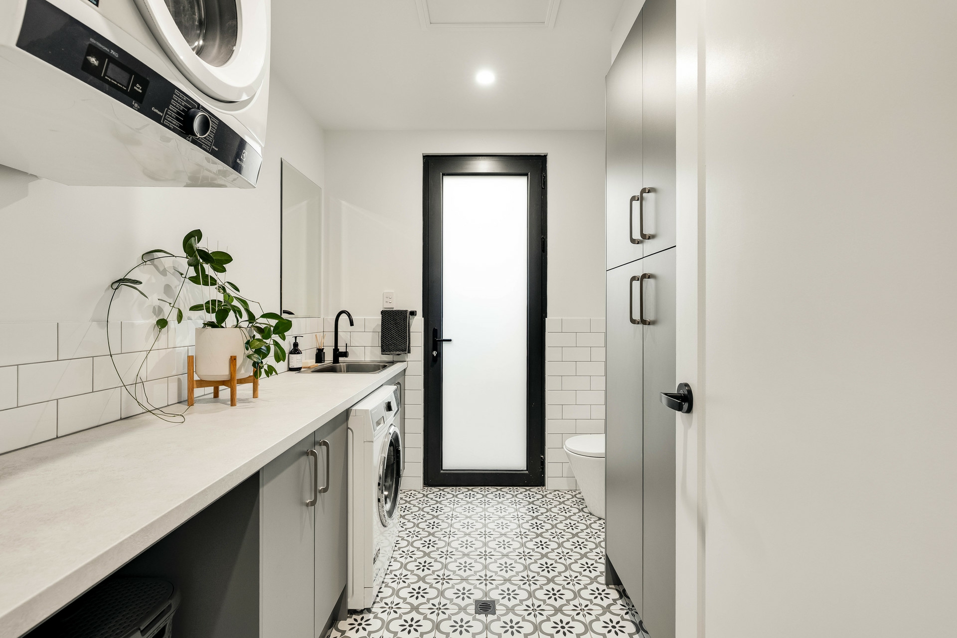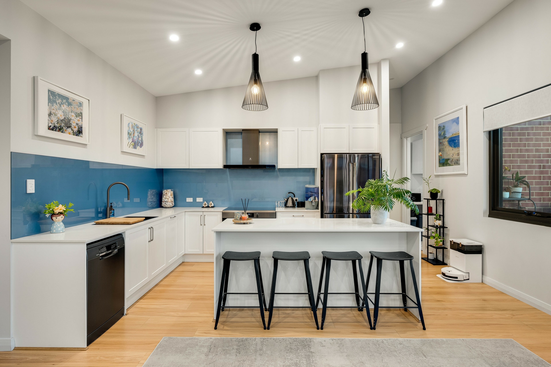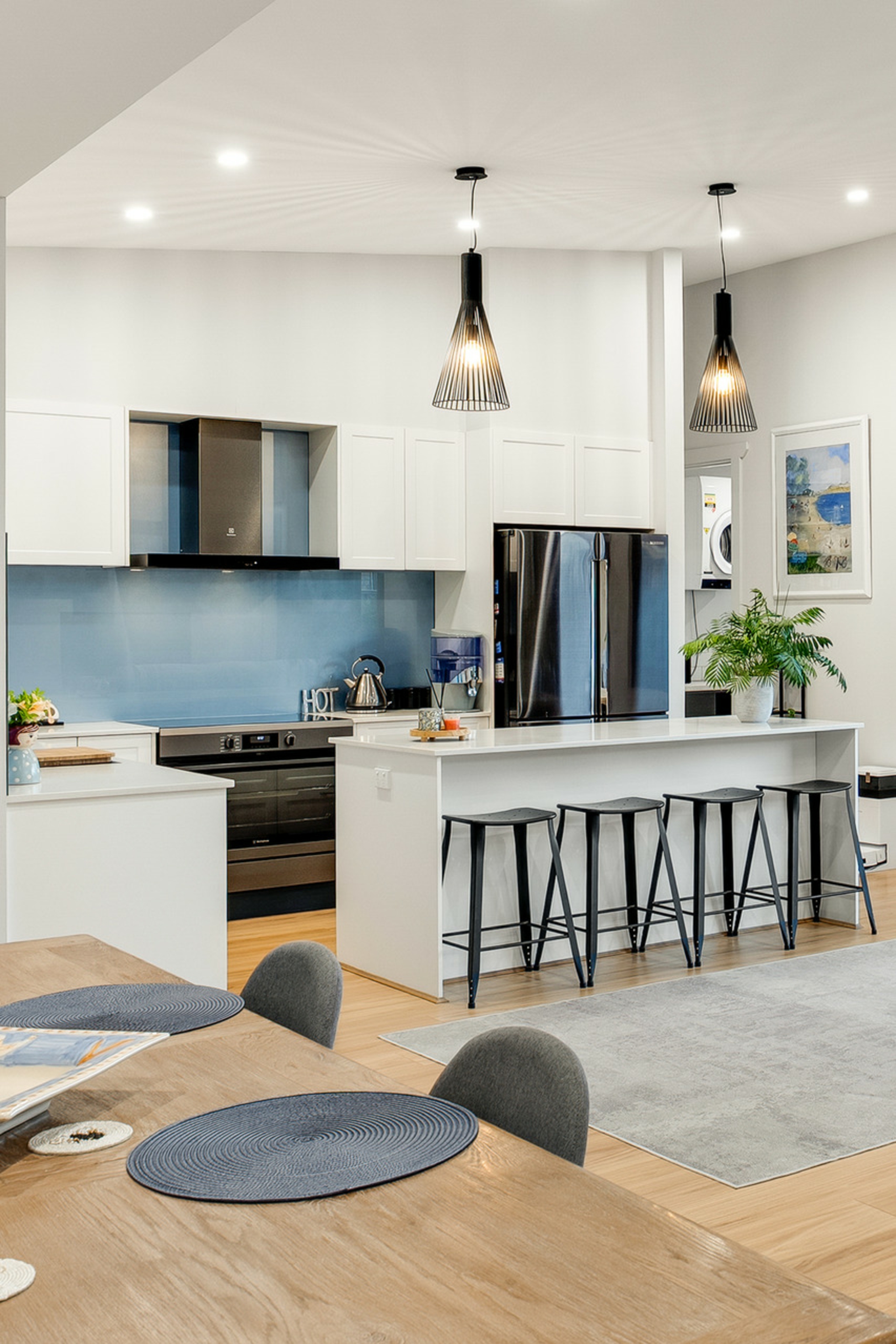 The kitchen is both beautiful and functional, appointed with Caesarstone benchtops, a Bosch dishwasher, Westinghouse induction cooktop and oven, smart Electrolux rangehood, Olivieri double sink with quality tapware, integrated bins, and a generous walk-in pantry.