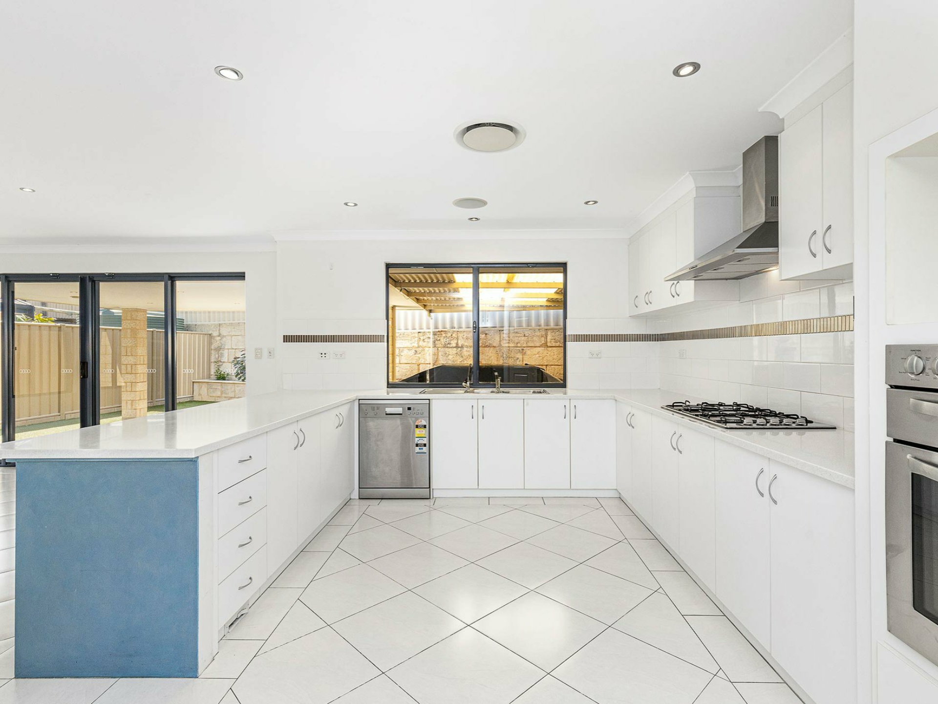 • Stone benches, square and stainless-steel appliances with overhead cupboards.