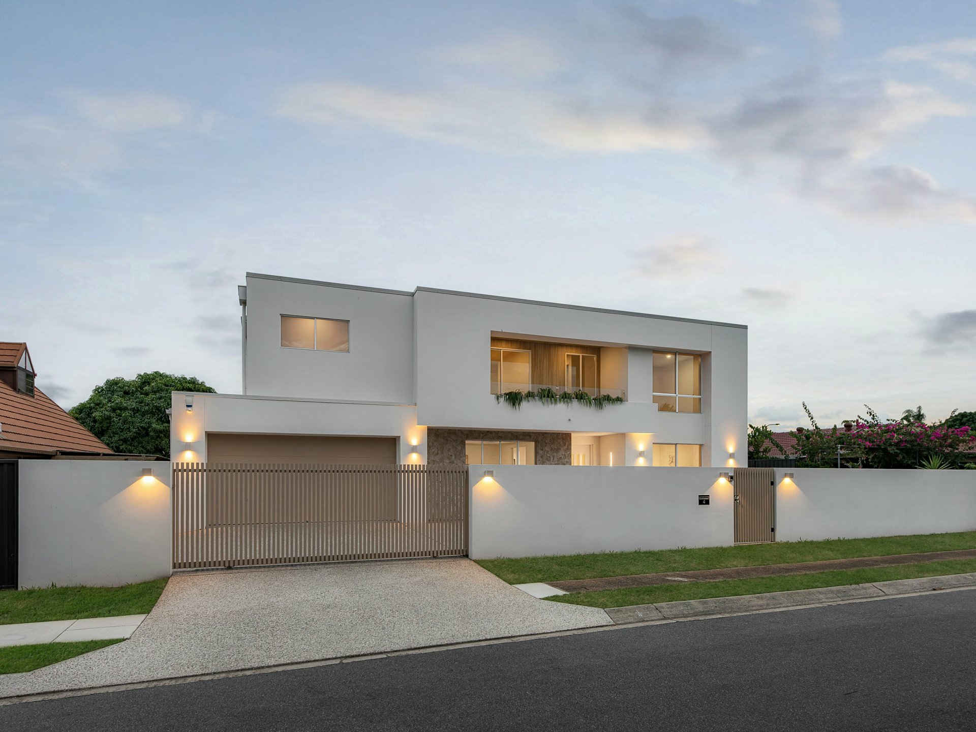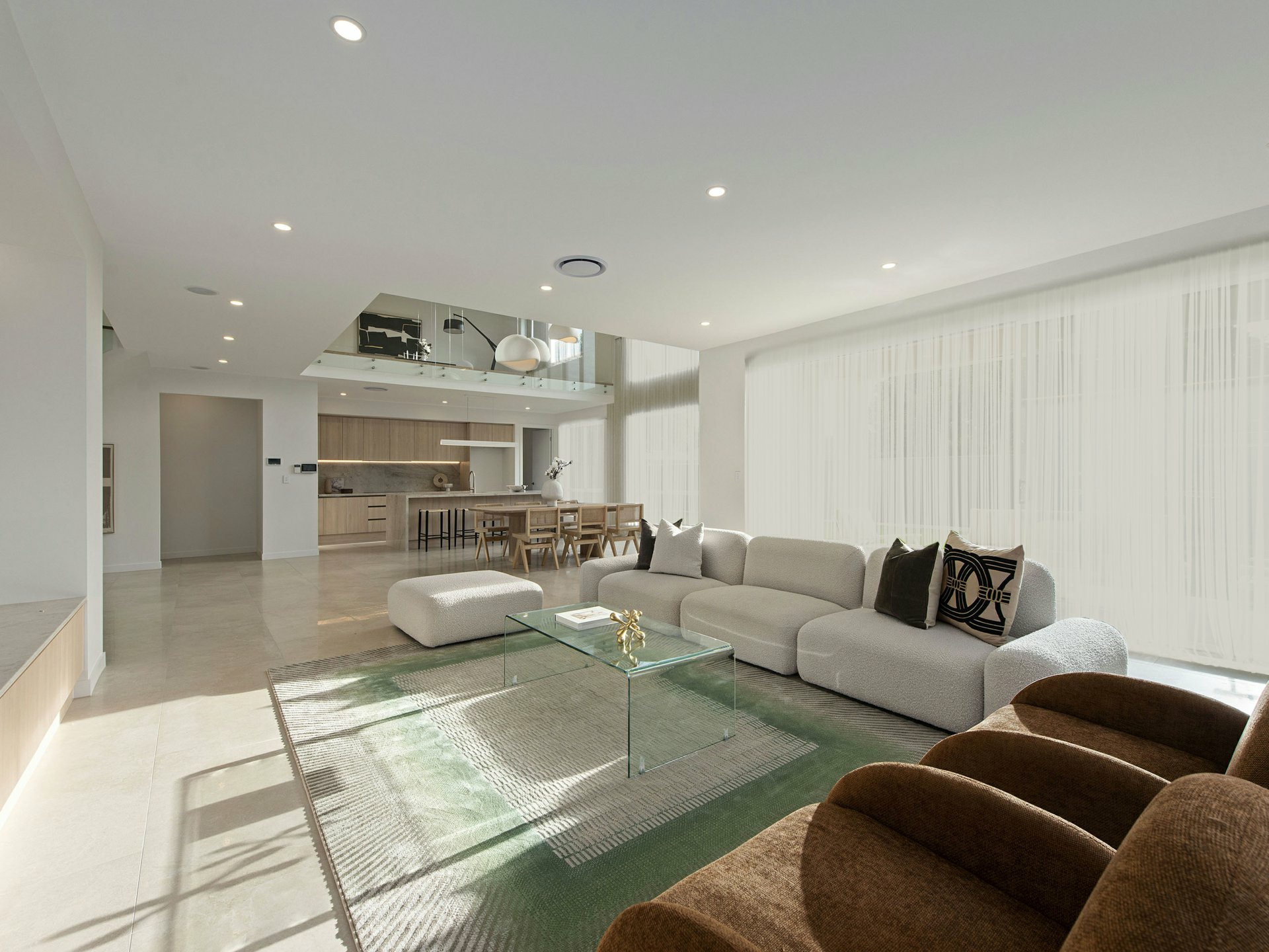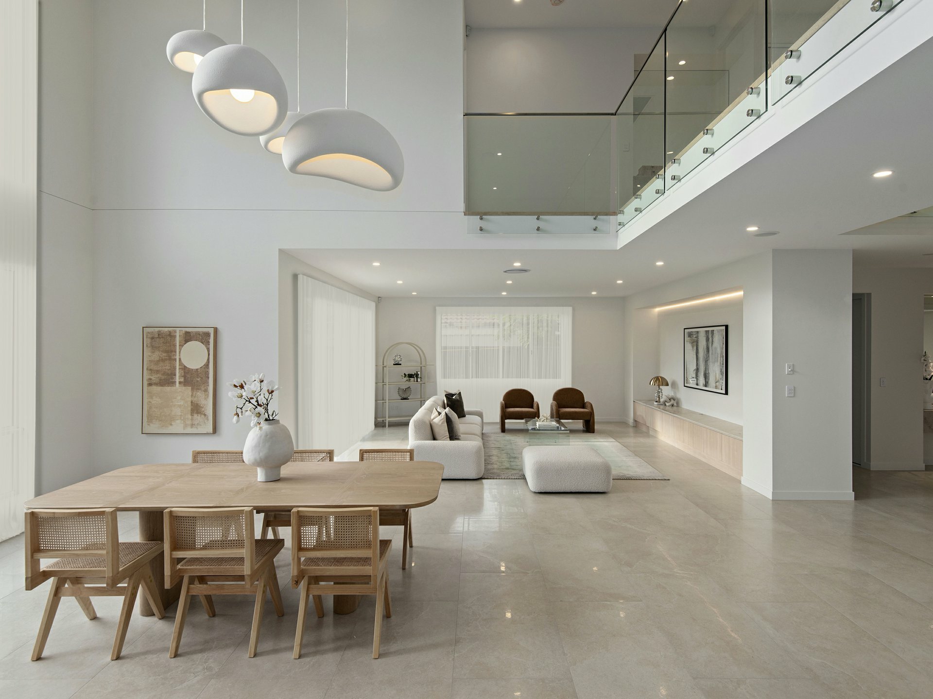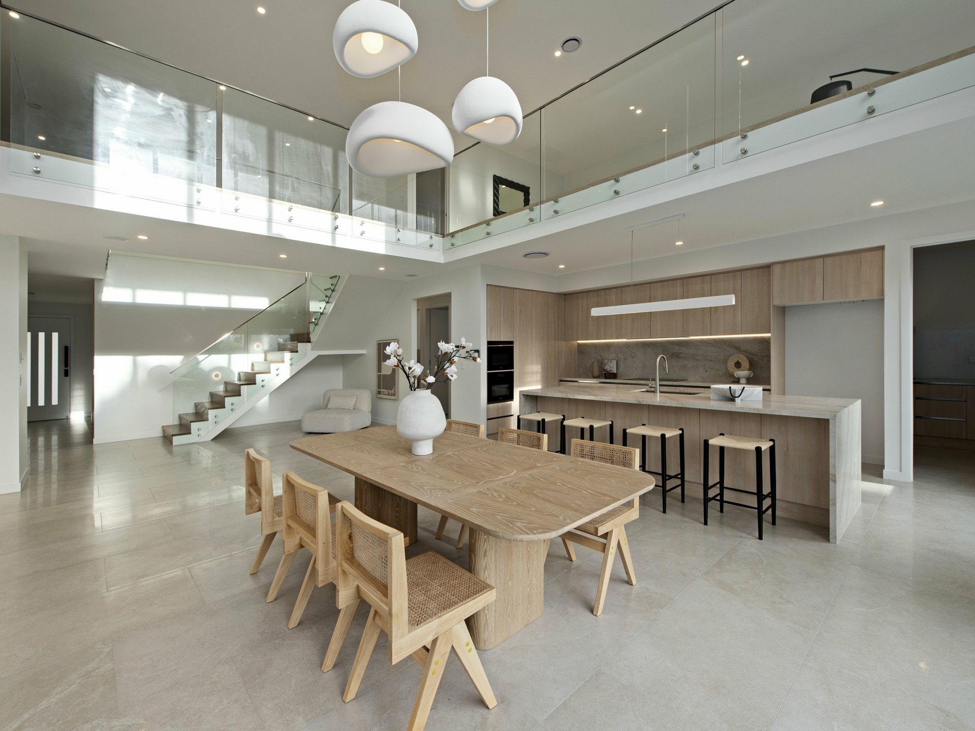 From the moment you arrive, the home's clean architectural facade and secure gated frontage set the tone for what lies beyond. Inside, a soaring double-height void and sculptural staircase create a remarkable sense of arrival, with natural light pouring through the home to enhance its openness and drama, a sculptural staircase with glass balustrading creating a striking centrepiece.