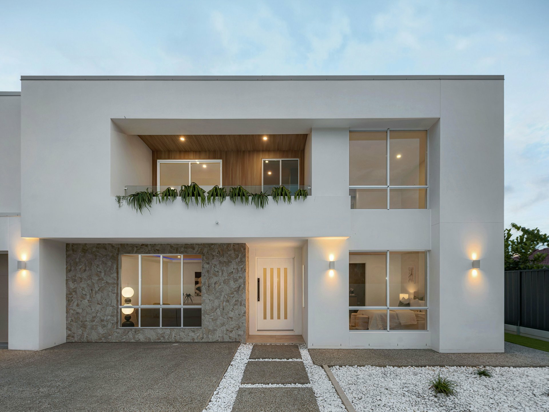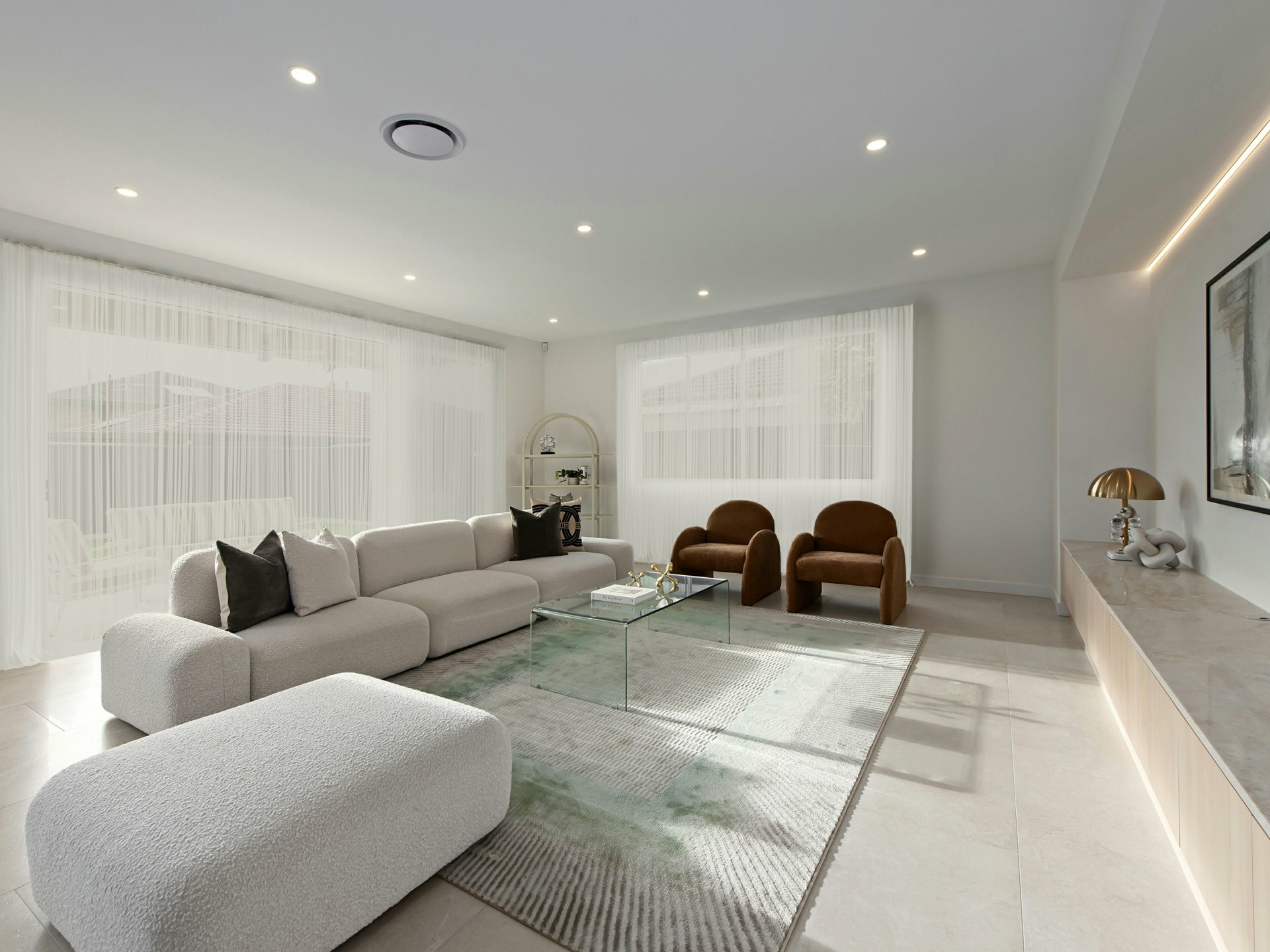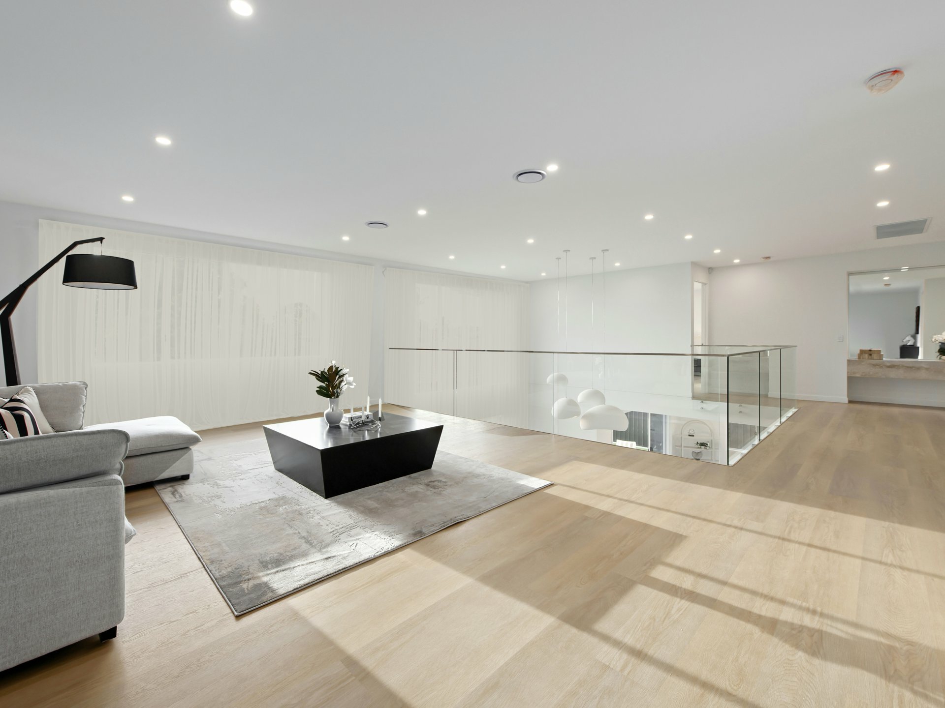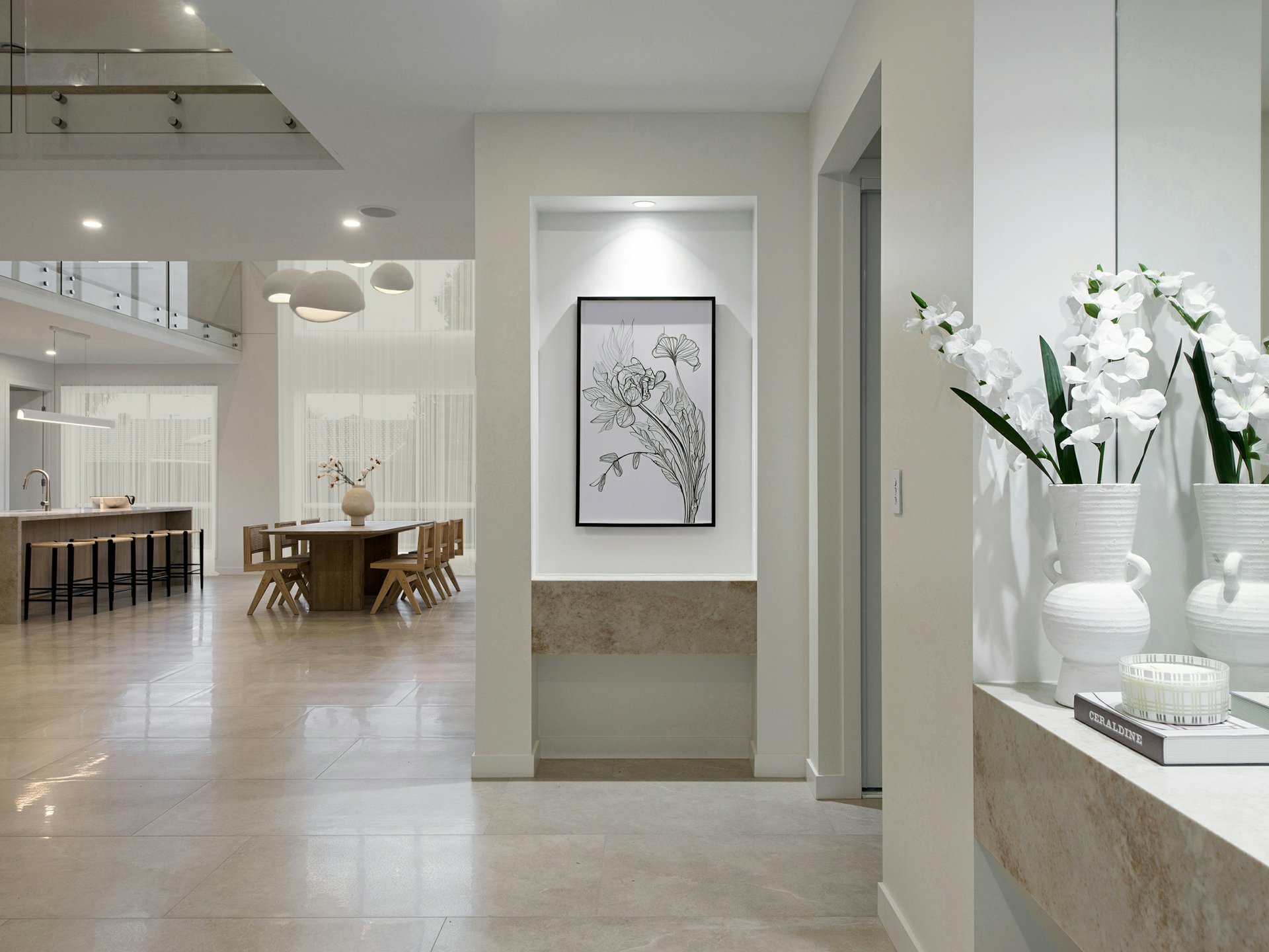 From the moment you arrive, the home's clean architectural facade and secure gated frontage set the tone for what lies beyond. Inside, a soaring double-height void and sculptural staircase create a remarkable sense of arrival, with natural light pouring through the home to enhance its openness and drama, a sculptural staircase with glass balustrading creating a striking centrepiece.