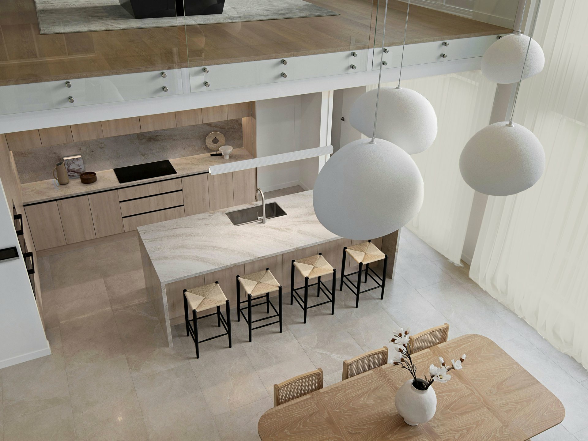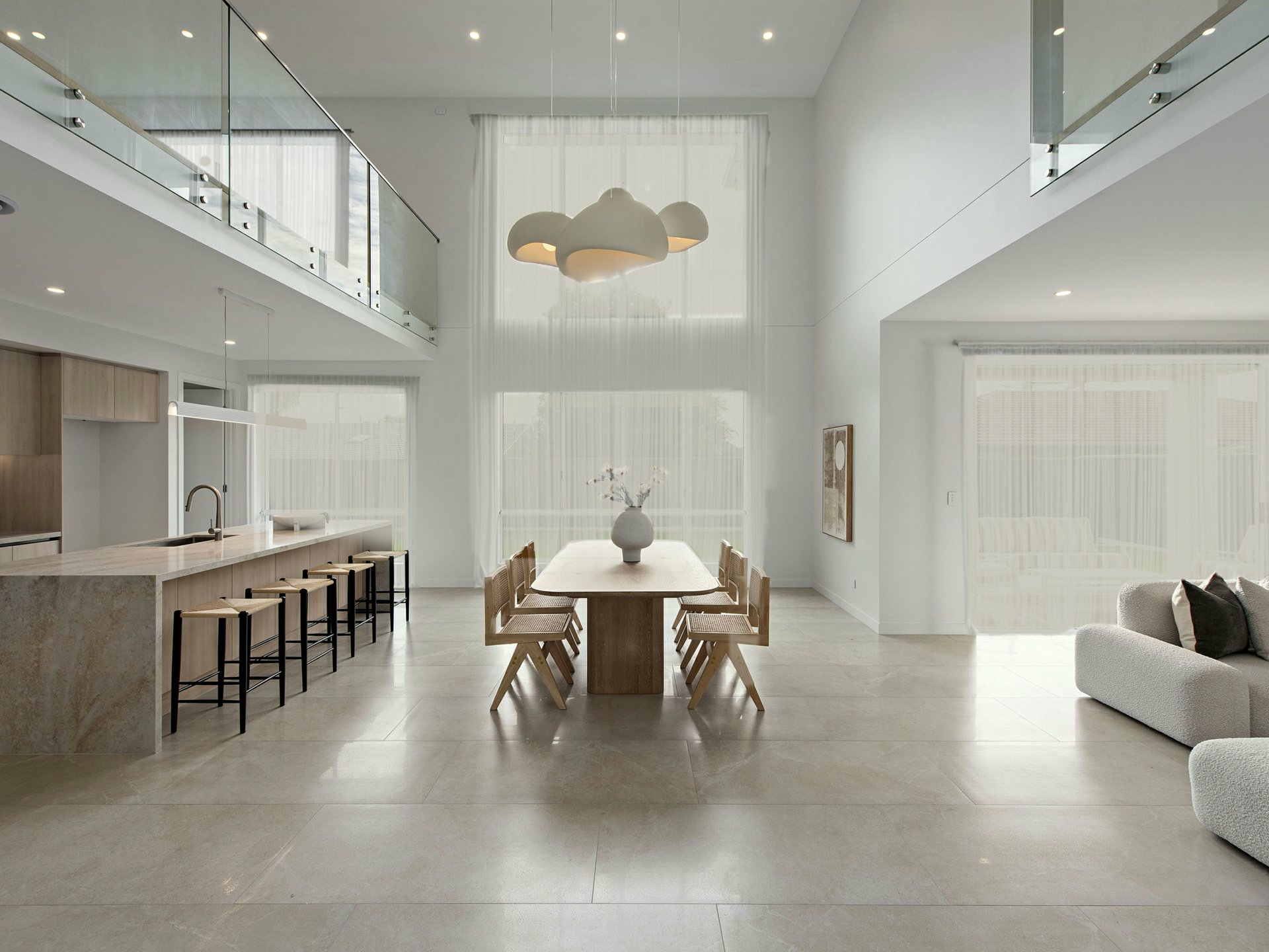 At the heart of the home, the expansive open-plan living and dining zone is nothing short of spectacular. Soaring ceilings enhance the sense of space, while full-height glazing draws the outdoors in.